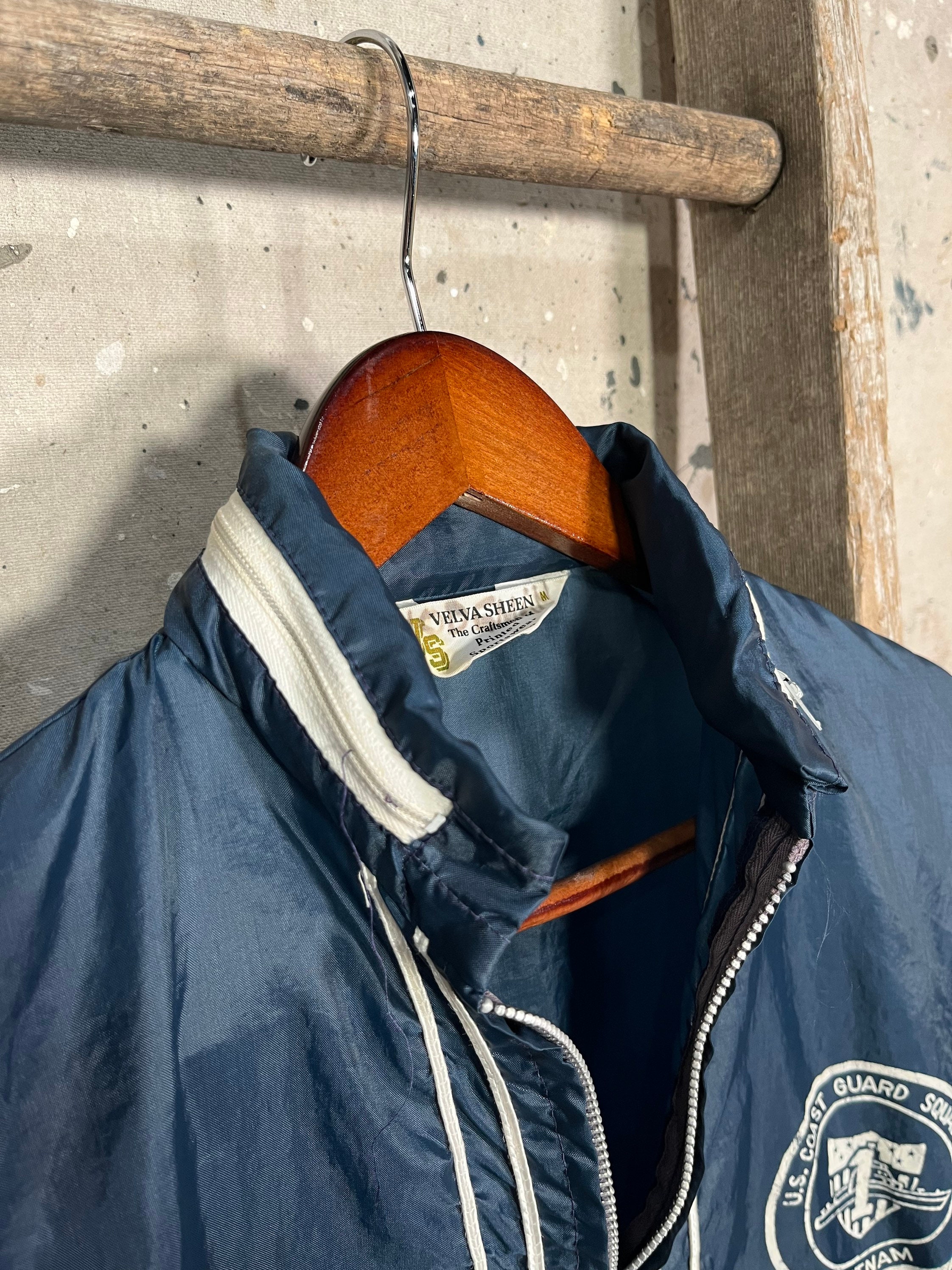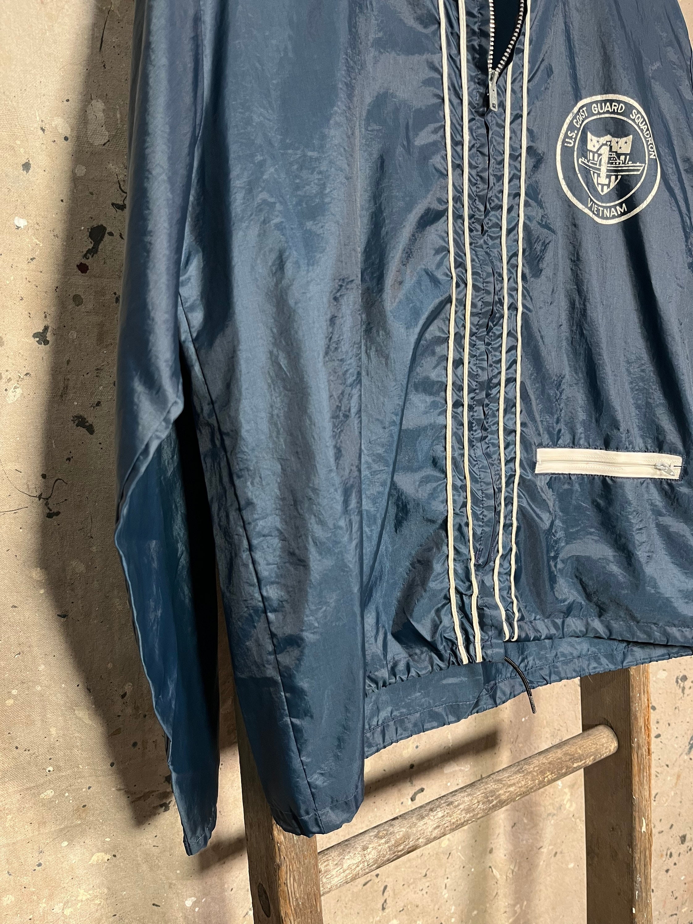 Vietnam war 1960s / 70s Coast Guard Squadron Jacket . Nylon shell, full zip and hide away hood. 2 waist pockets Natural distressing , good condition . See photo