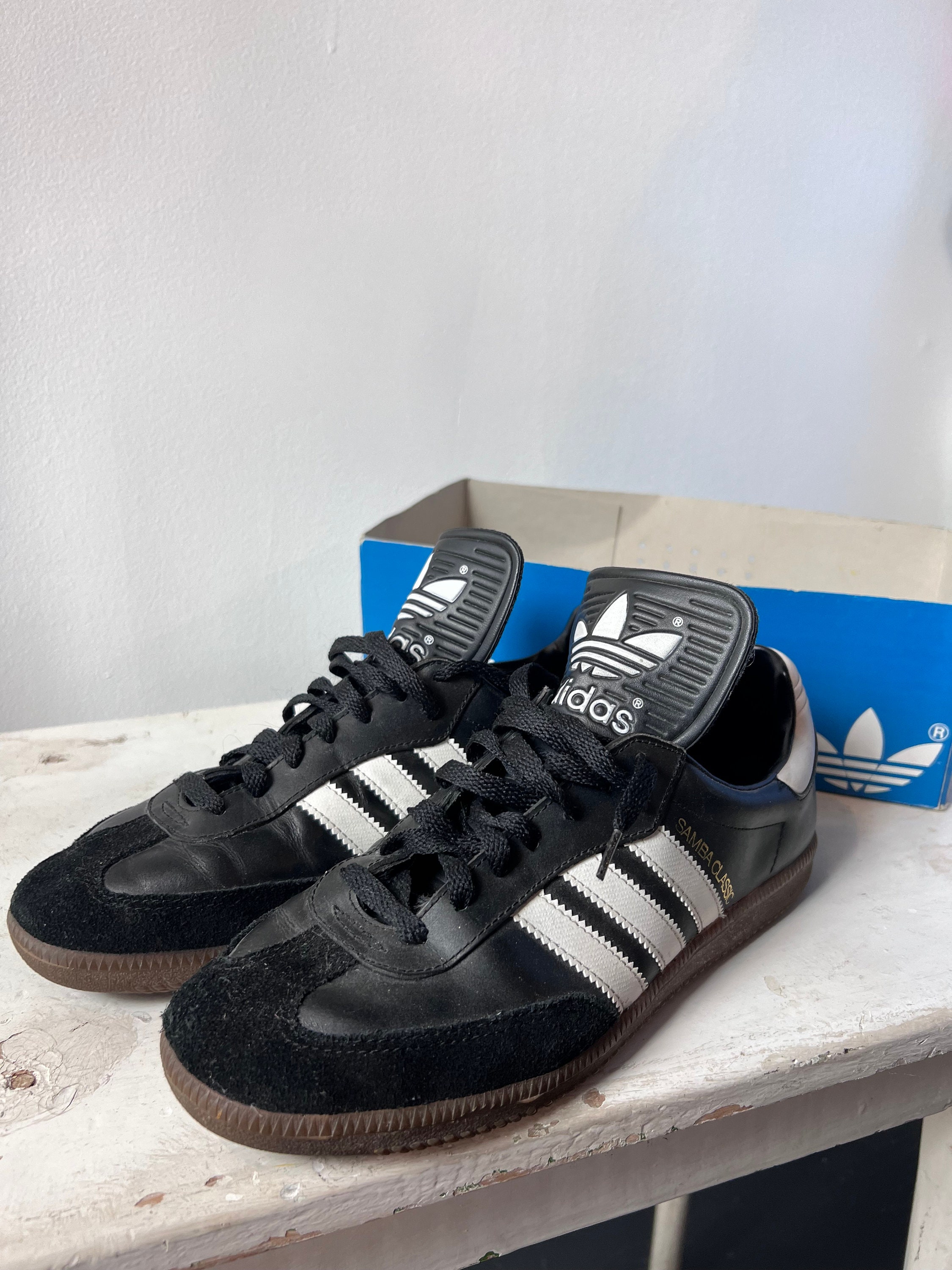 80s / 90s Adidas Samba Classics. Tough to find in Deadstock condition. The box in the photos is not the original box (for Stan Smith Adidas) but is what they were found in. New Old Stock , appear to have been unworn - see photos.