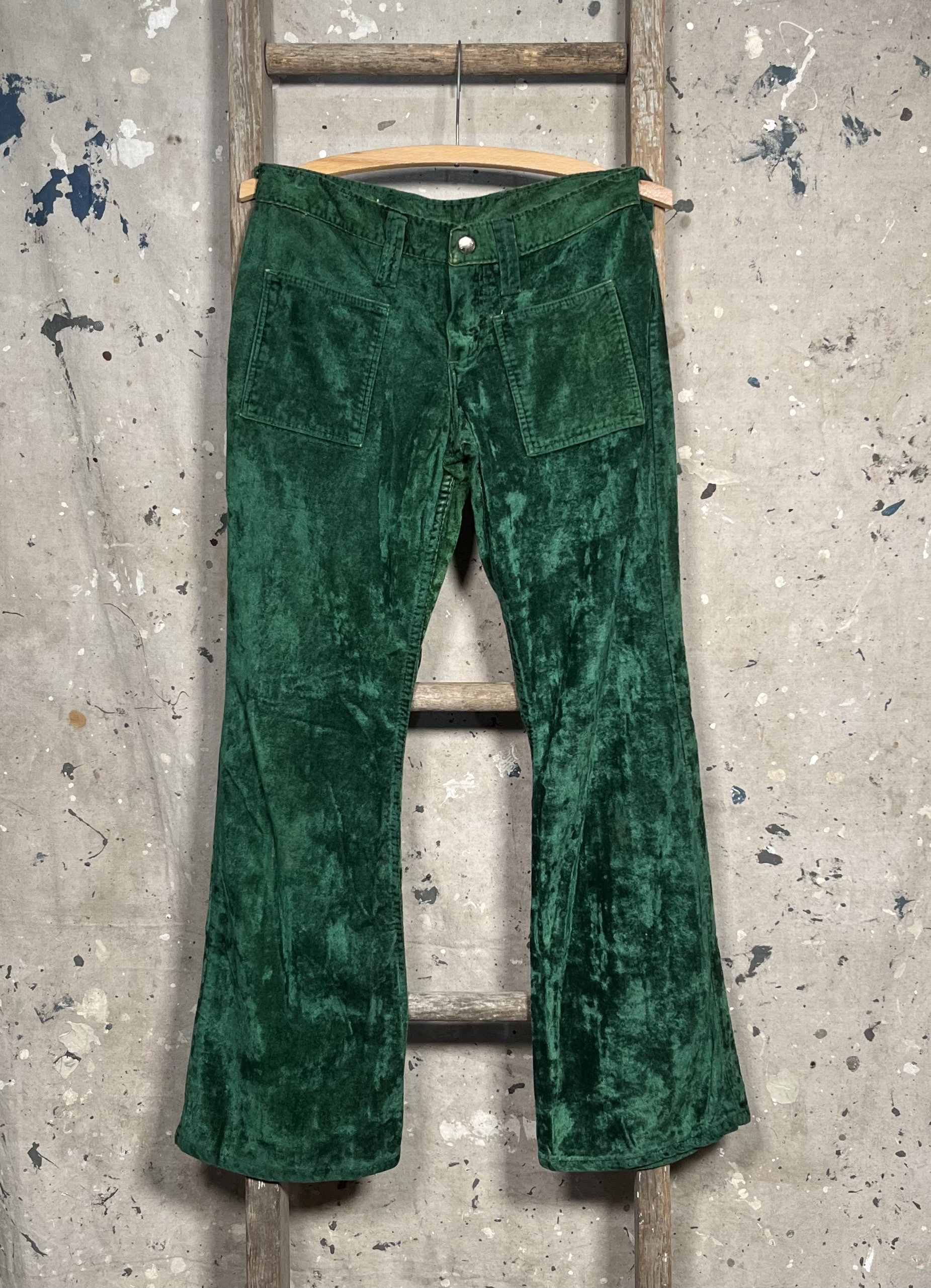 Amazing 1970s Green Velvet Bell Bottoms by Wrangler. Features 2 pockets at thigh, Scoville zipper. Great vintage condition with light natural distressing - see photos.