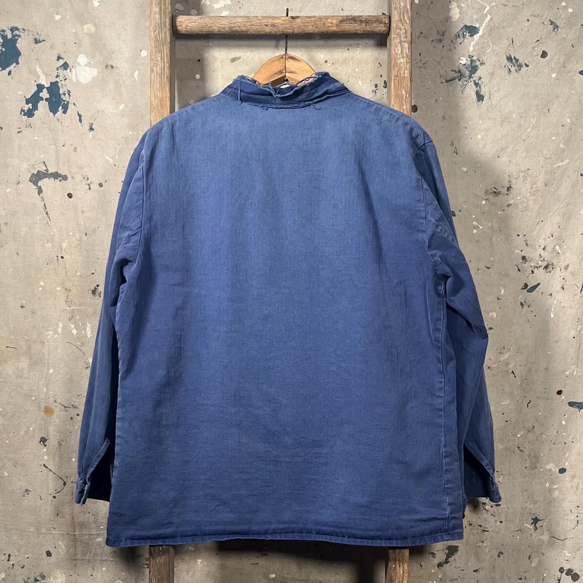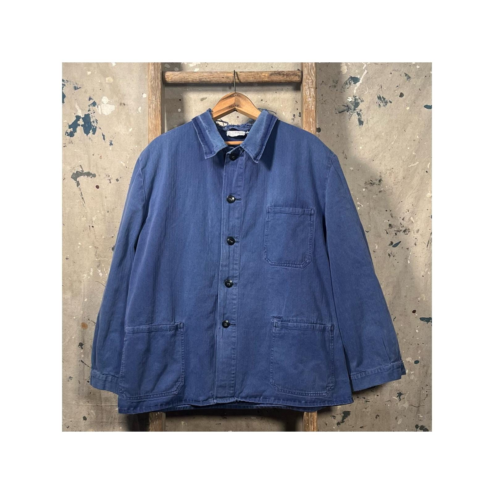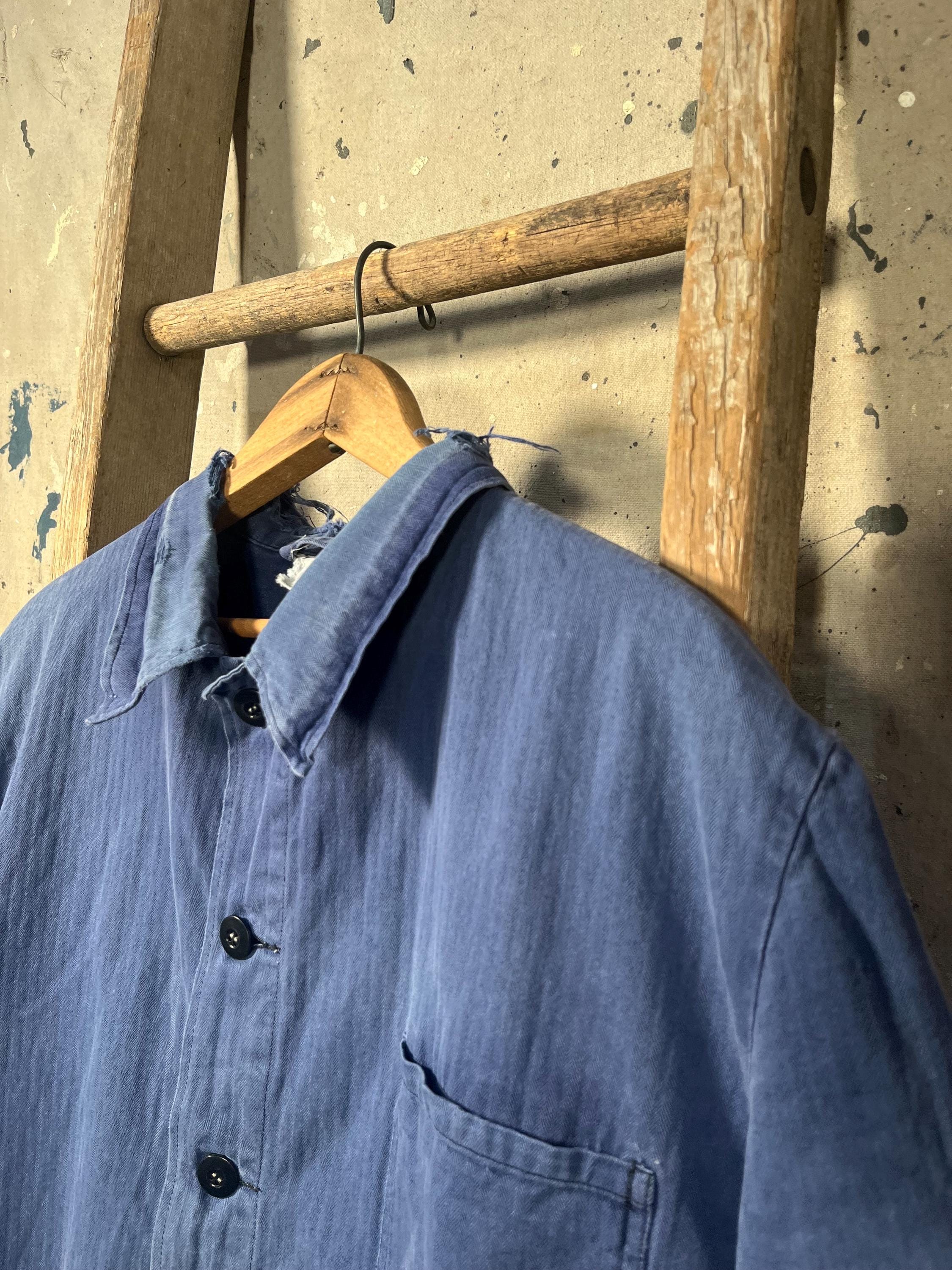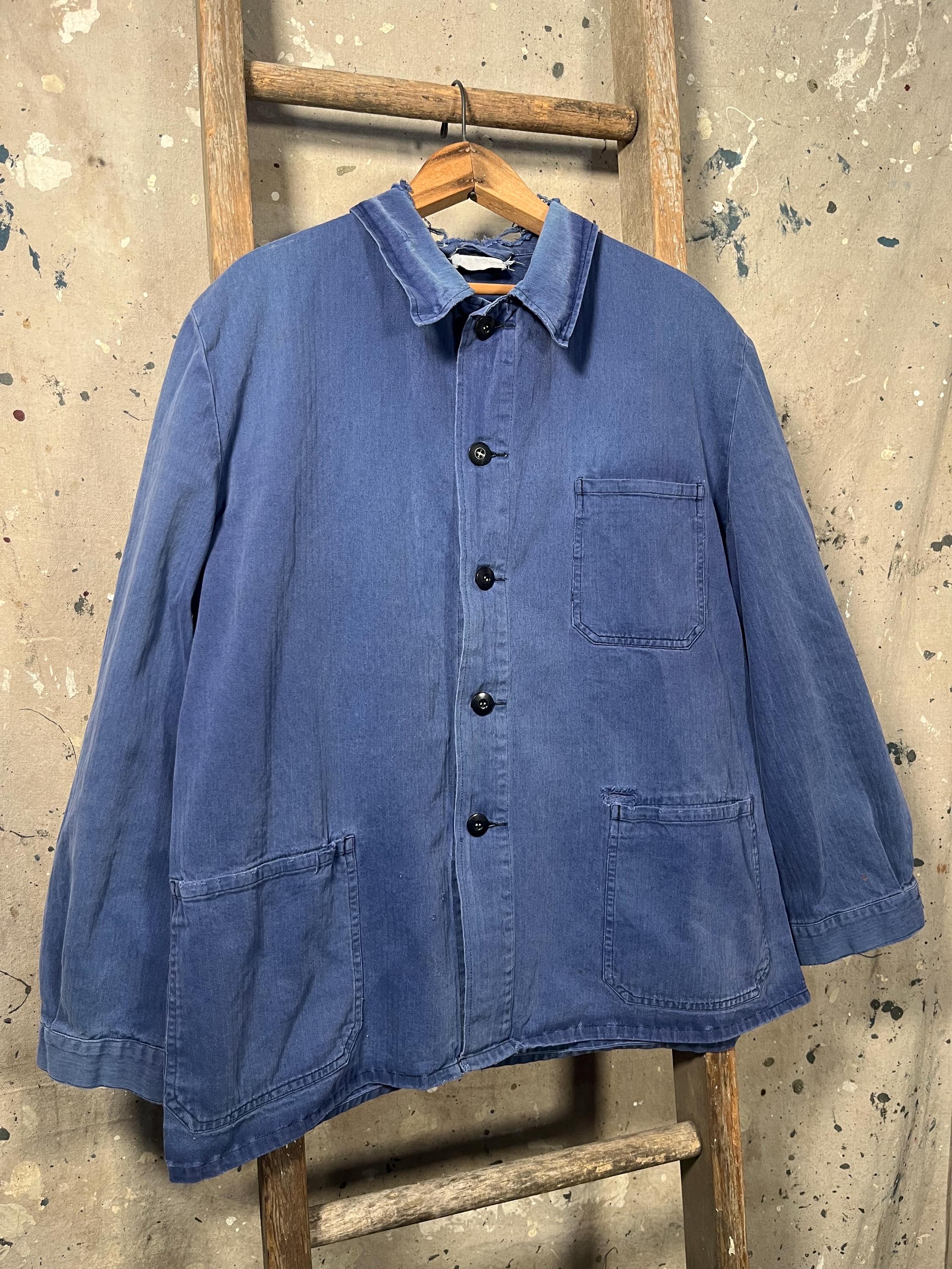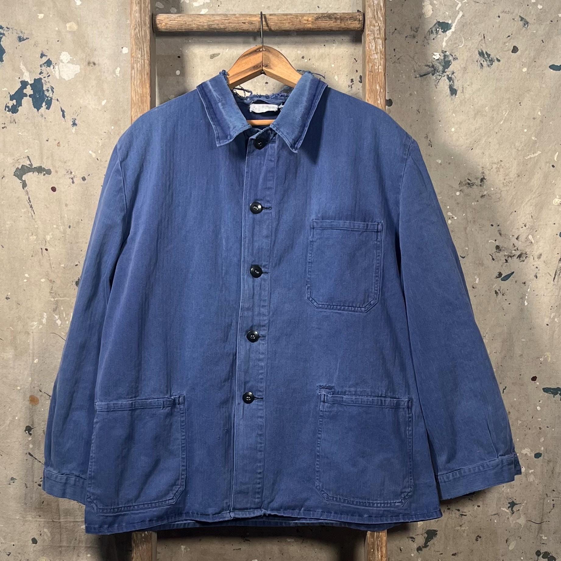 Exceptionally large blue herringbone chore jacket . Amazing natural distressed indigo color. Original sun fading throughout , misc holes. Please see photos. Good condition.