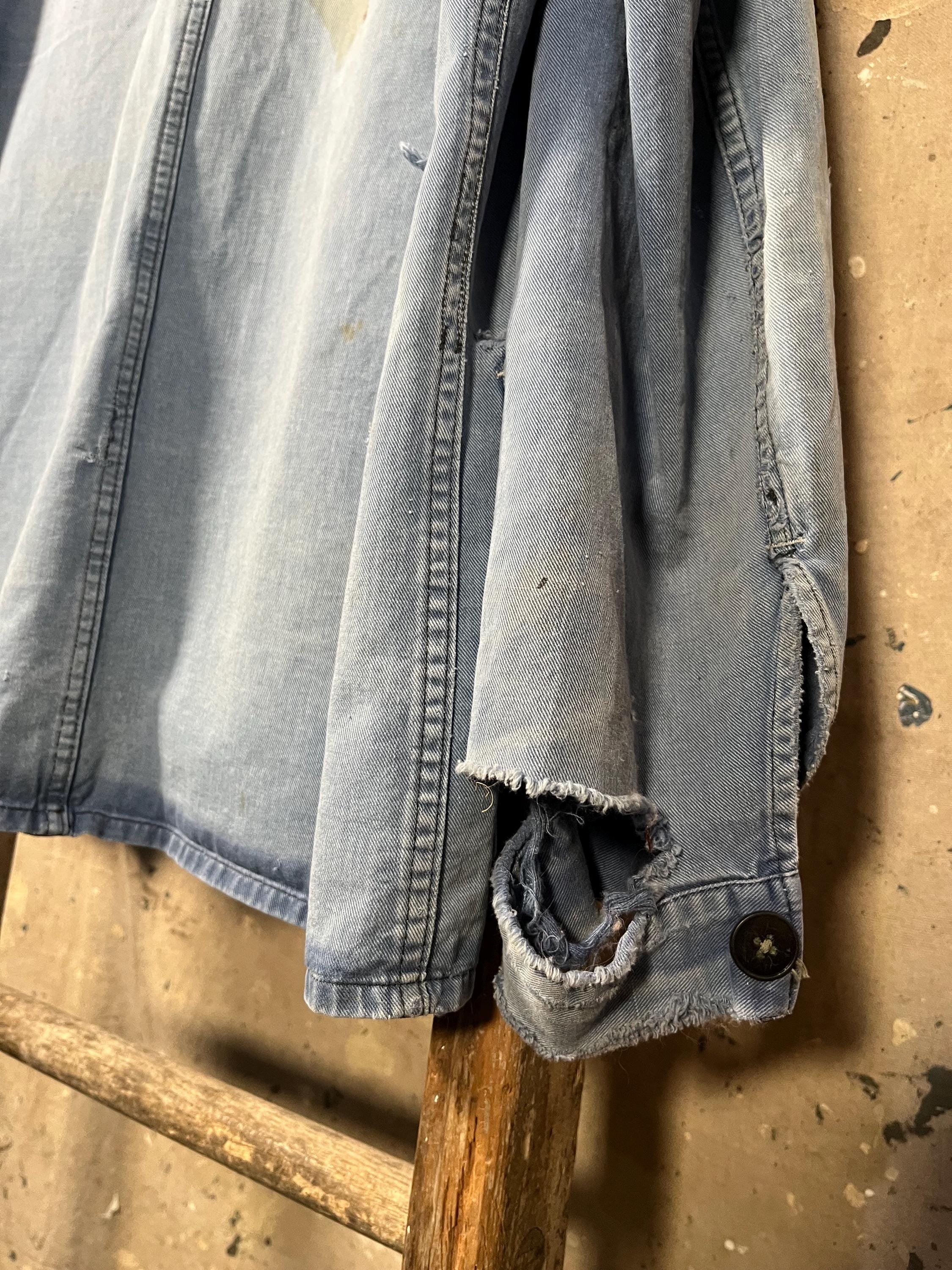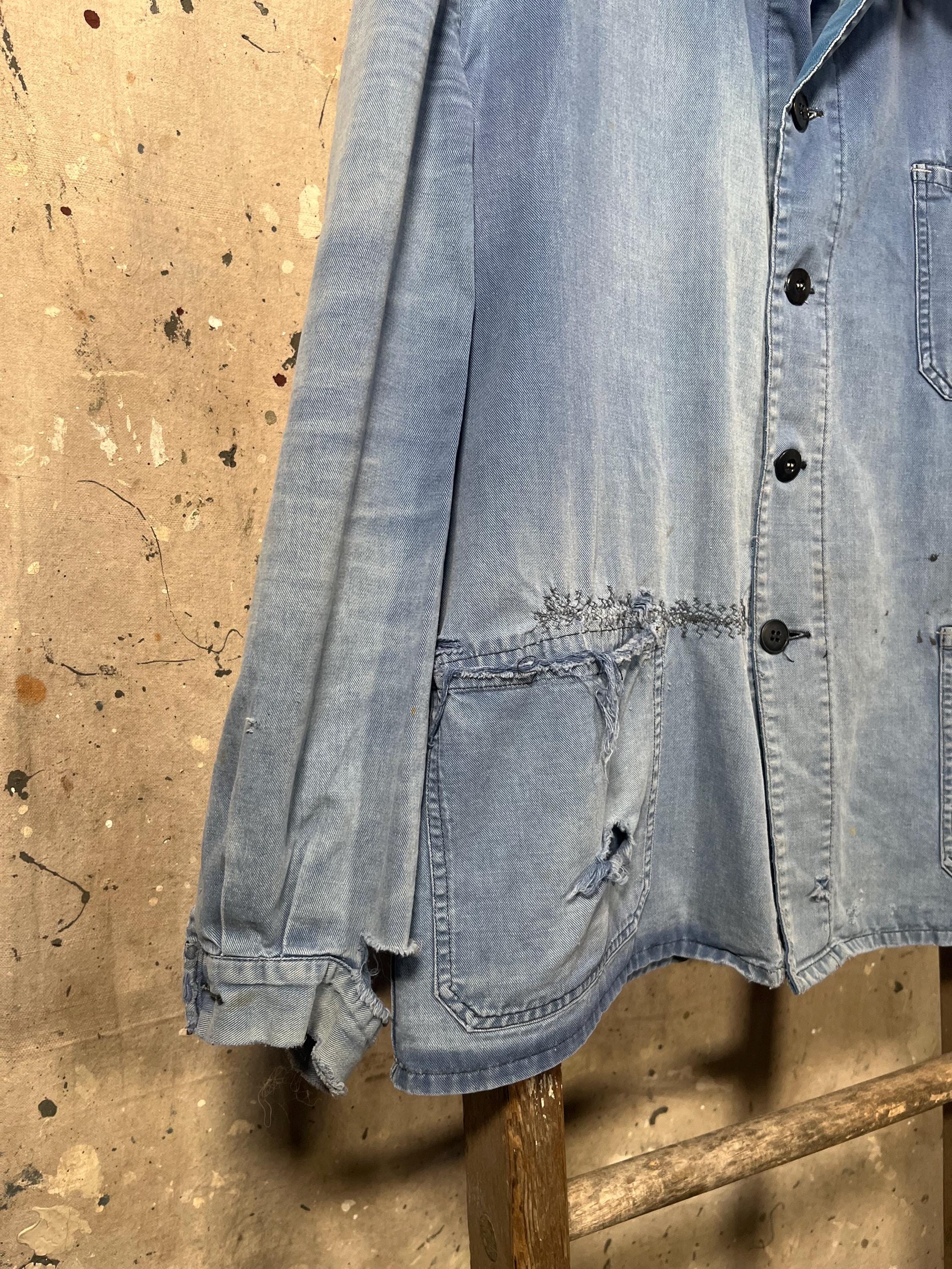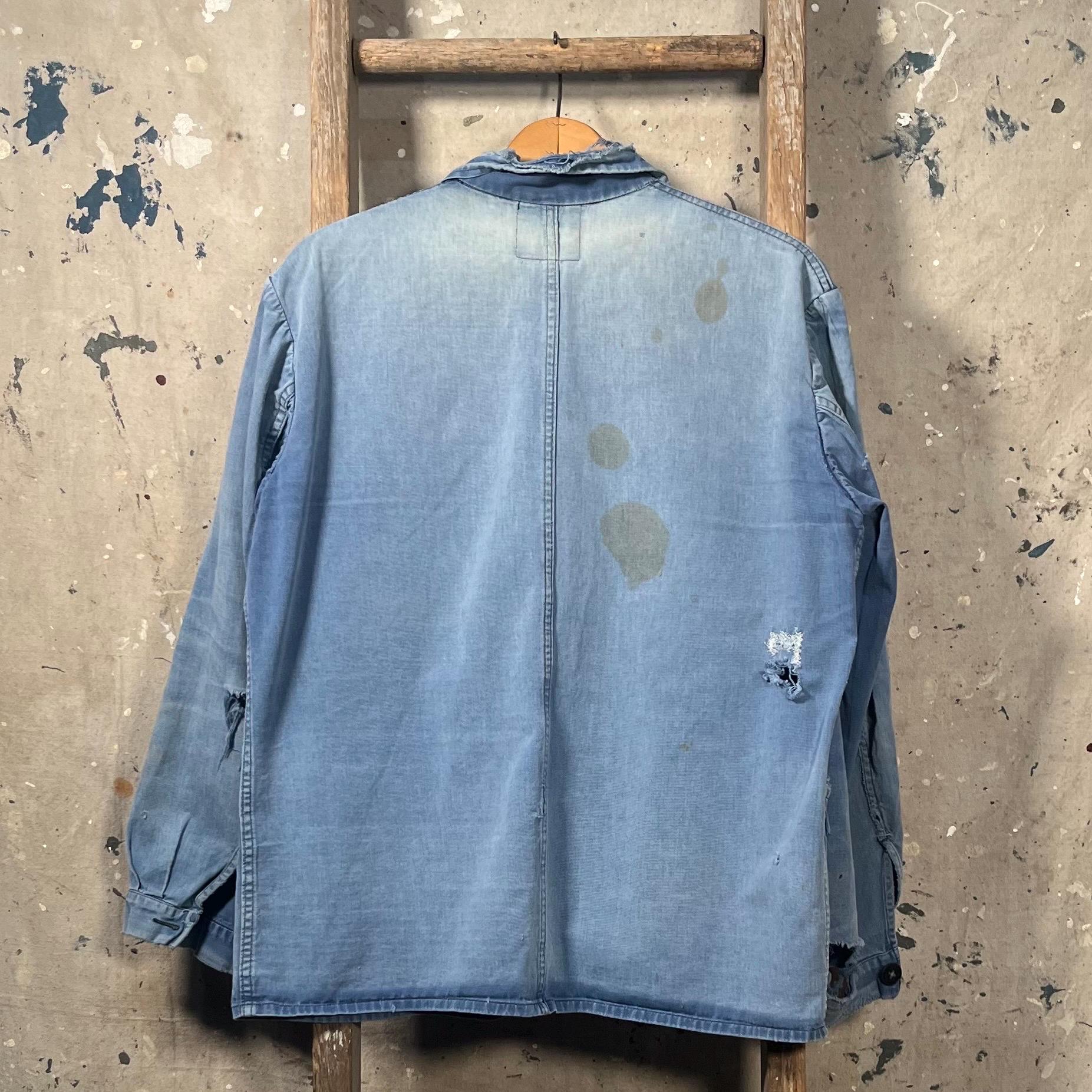 Extremely Distressed blue herringbone chore jacket . Amazing natural distressed indigo color. Completely sun bleached , misc holes and distressing . Please see photos. Sold as is , Good condition.