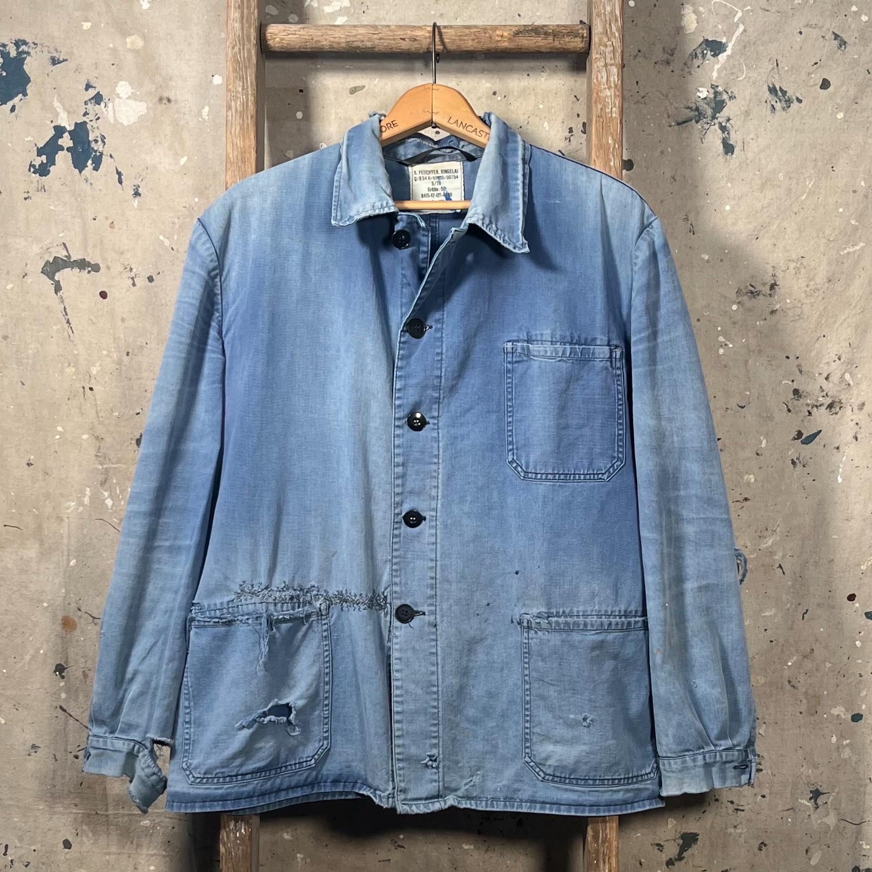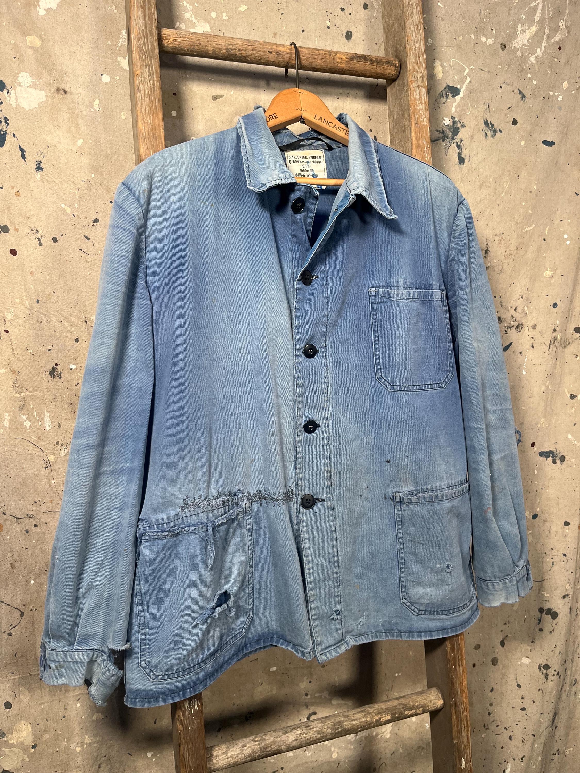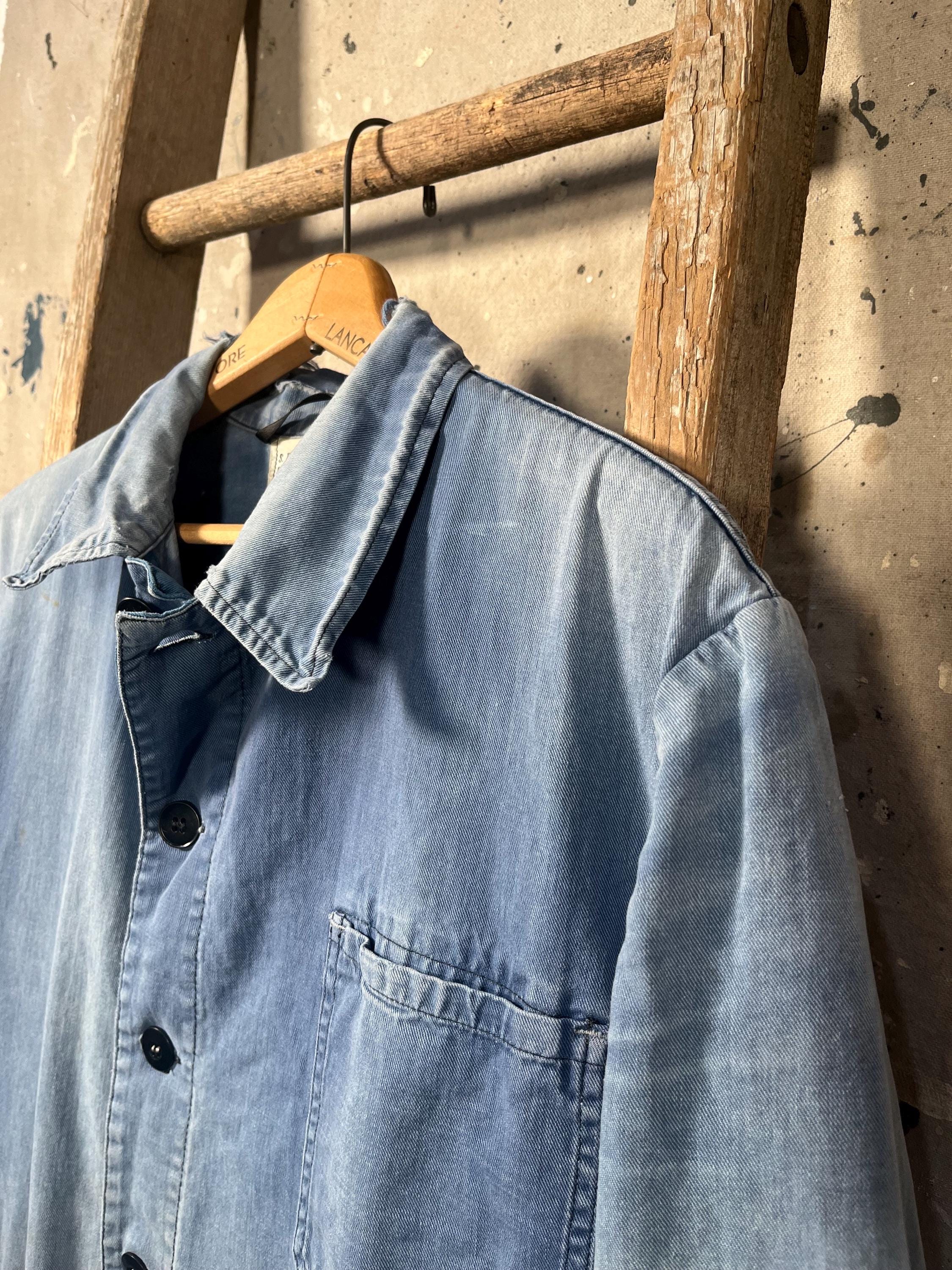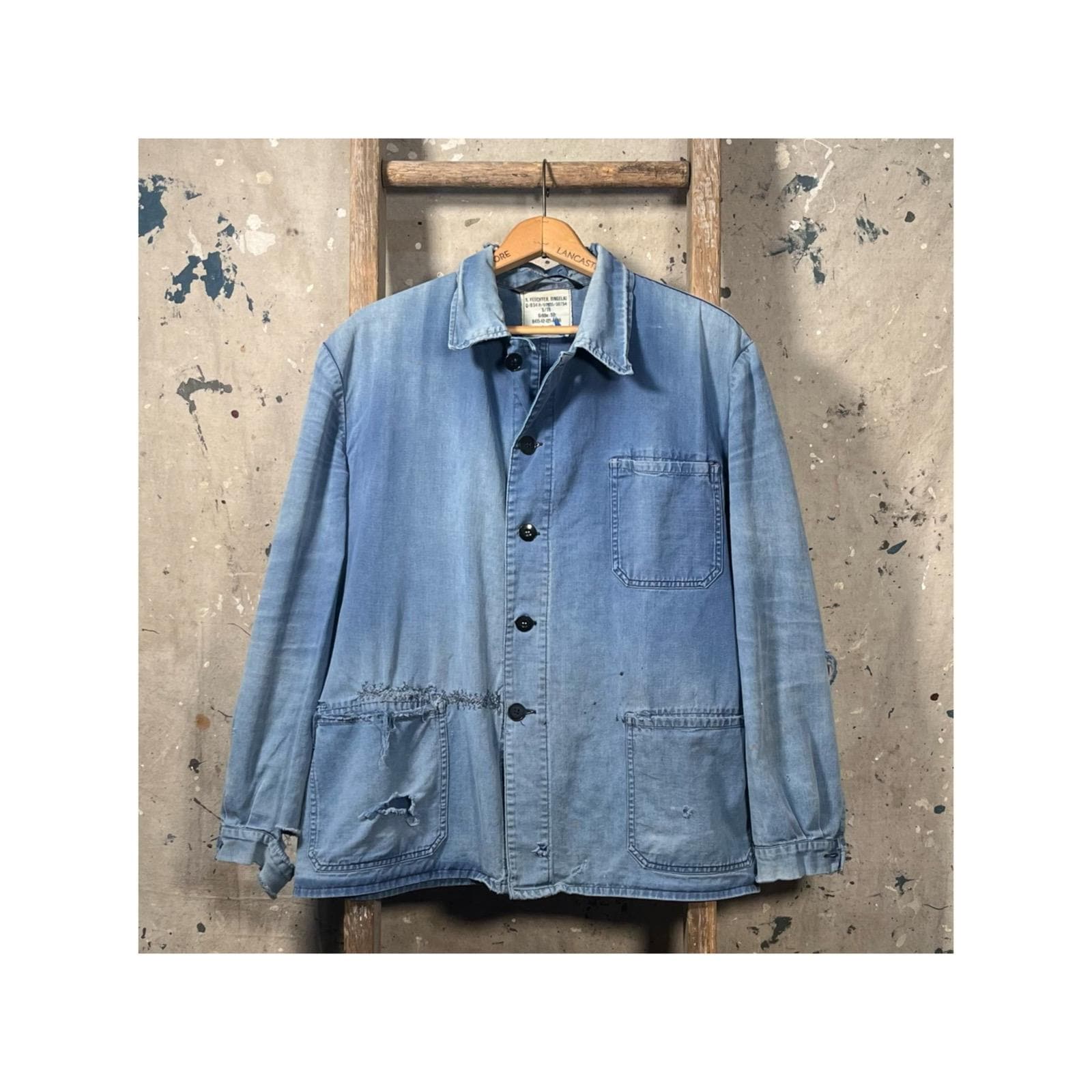 Extremely Distressed blue herringbone chore jacket . Amazing natural distressed indigo color. Completely sun bleached , misc holes and distressing . Please see photos. Sold as is , Good condition.