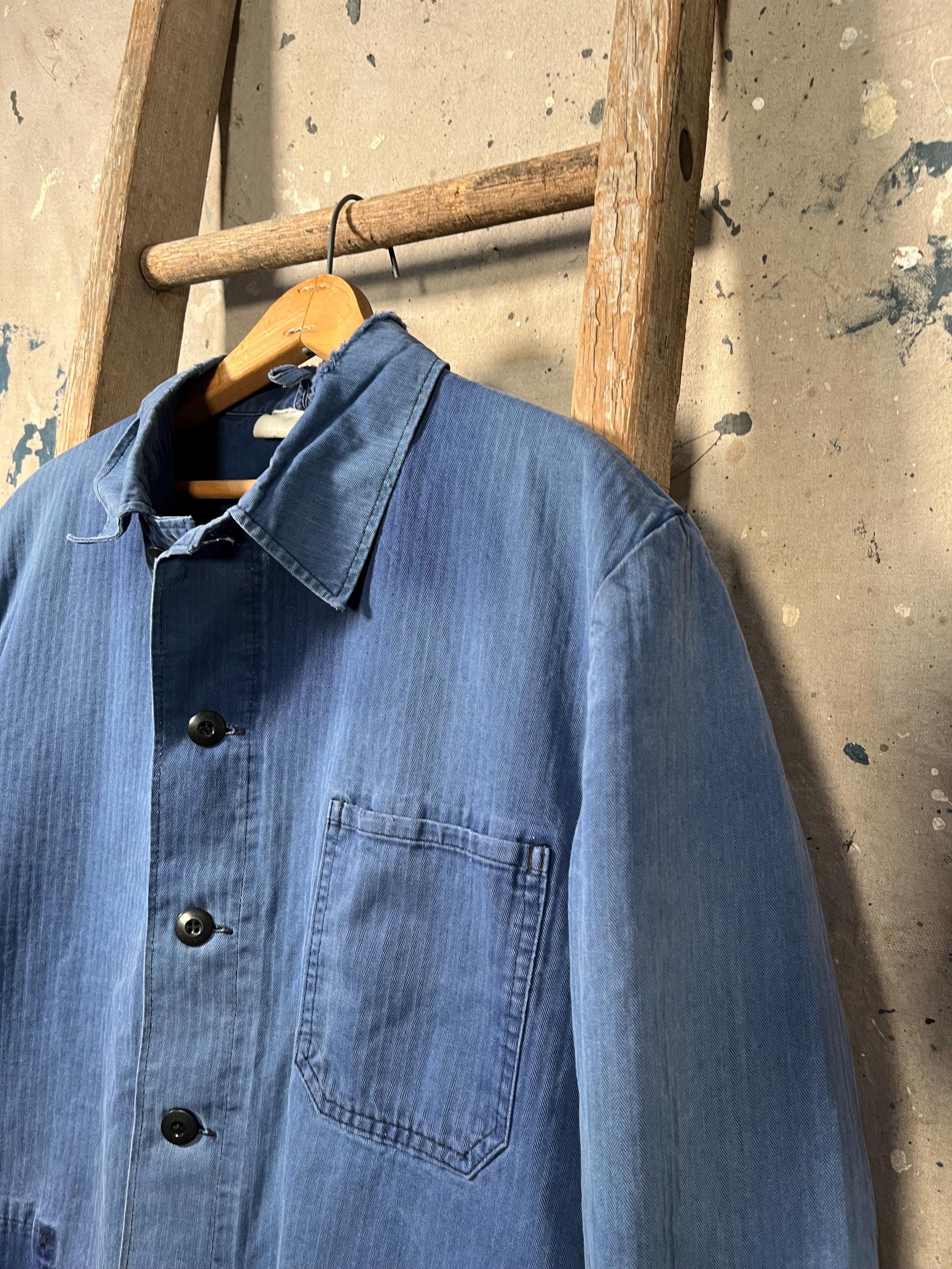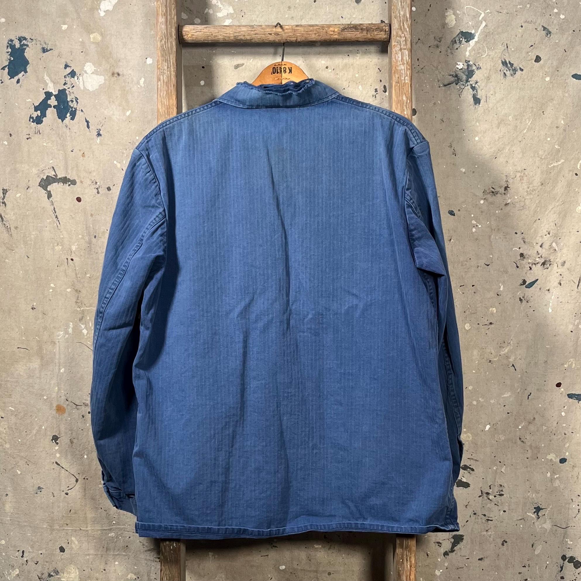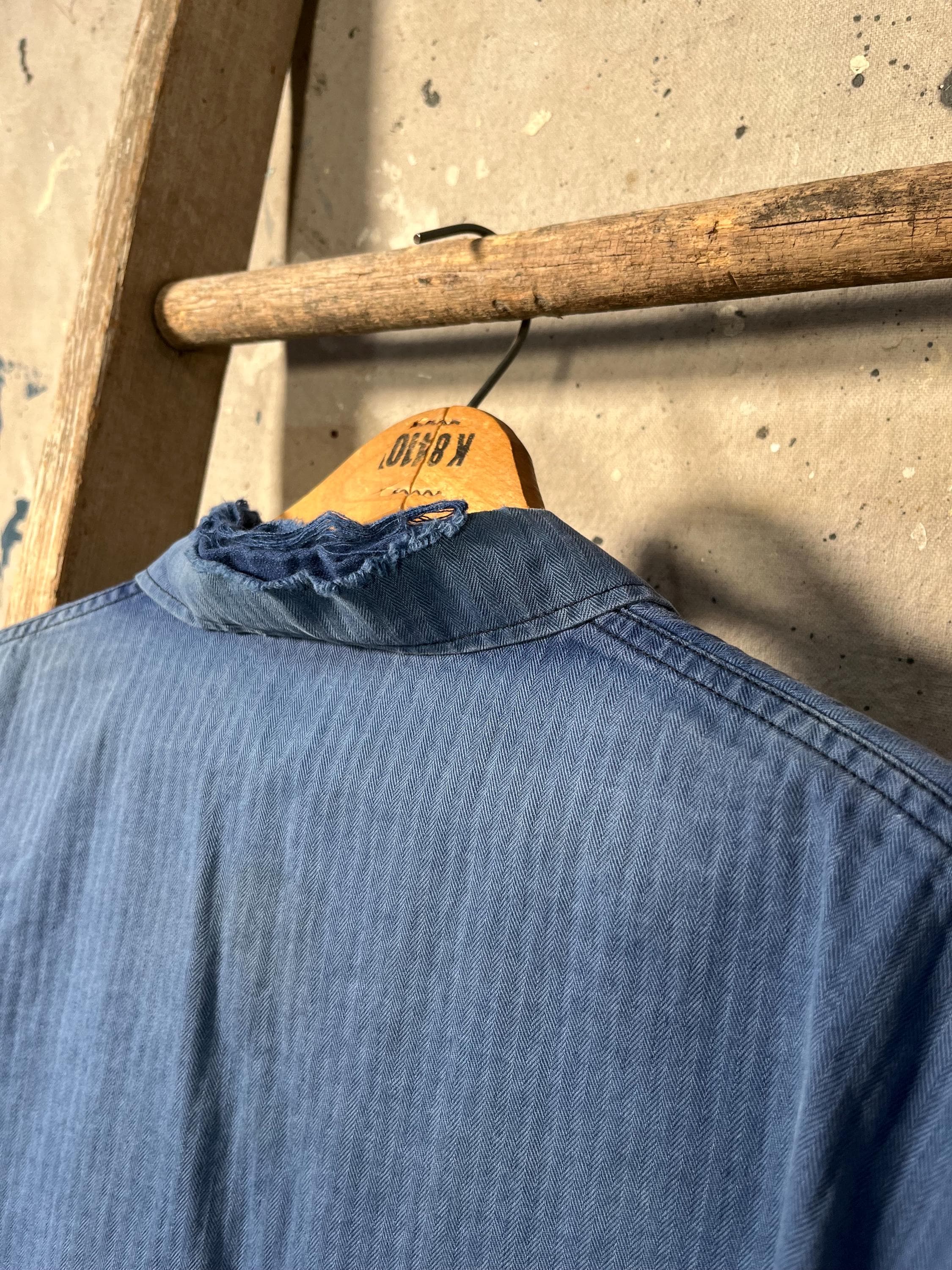 Uniquely Distressed blue herringbone chore jacket . Amazing natural distressed indigo color. Original sun fading throughout with ghost pocket, please see photos. Sold as is , Good condition.