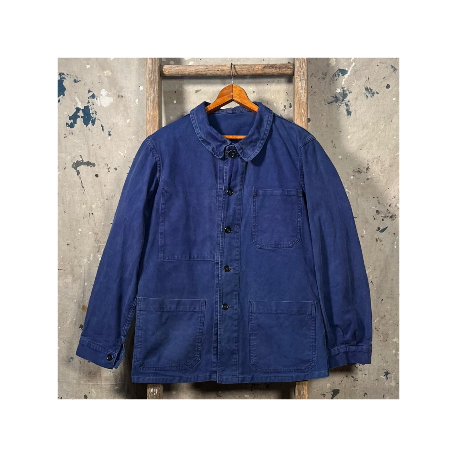 1960s Blue cotton twill chore coat . Heavy 10oz + all cotton 3 pocket jacket , with one interior pocket . Unique indigo color fade throughout . Original distressing throughout , see photos . Great condition