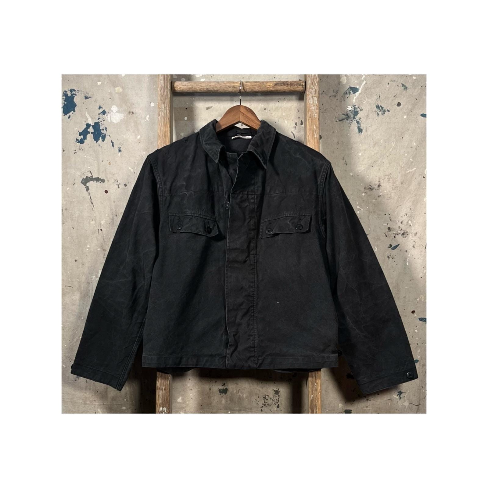 1970s Black cotton work jacket . Heavy 8oz + all cotton 2 pocket jacket. Unique cropped fit with cinch buttons at hem. Original distressing , see photos . Good condition