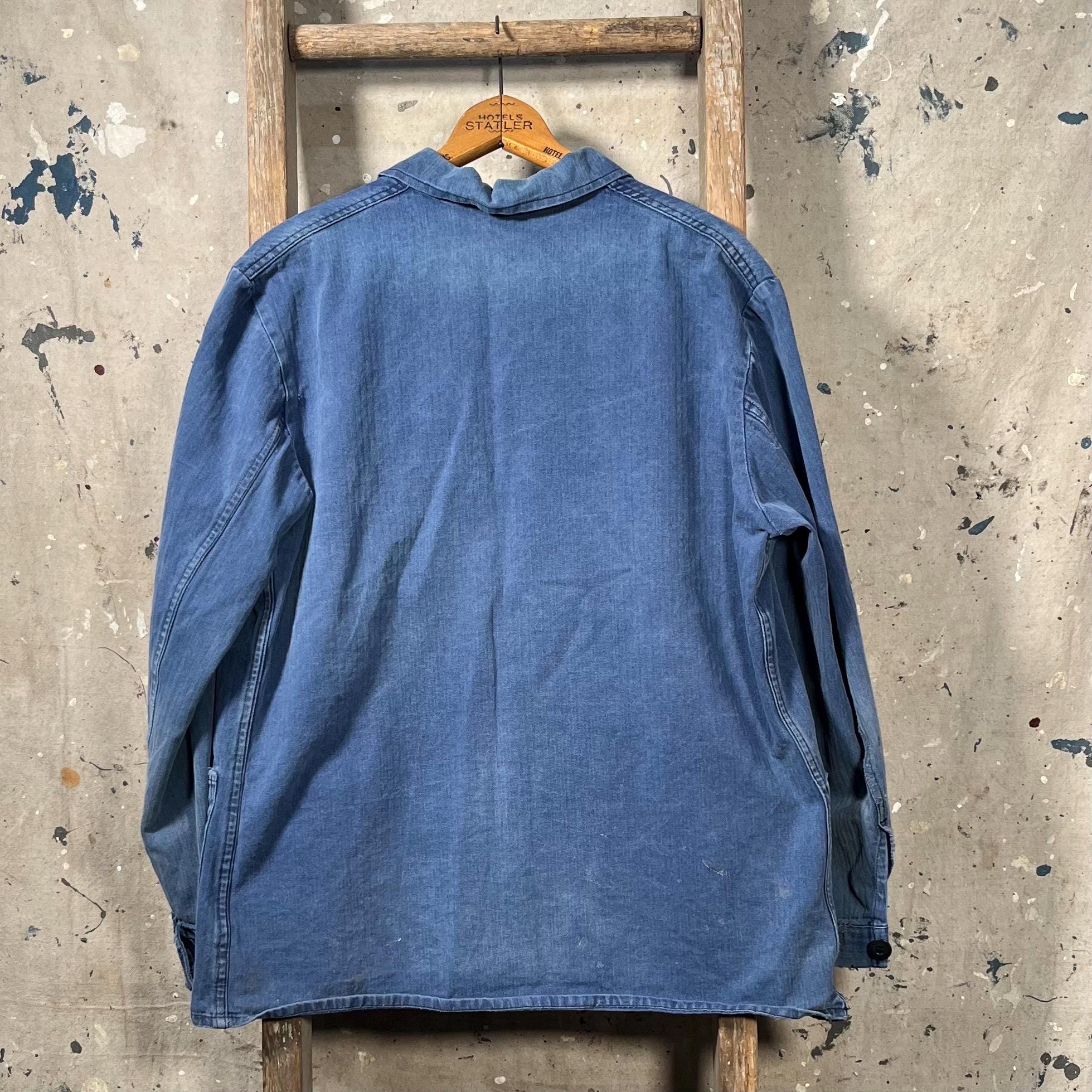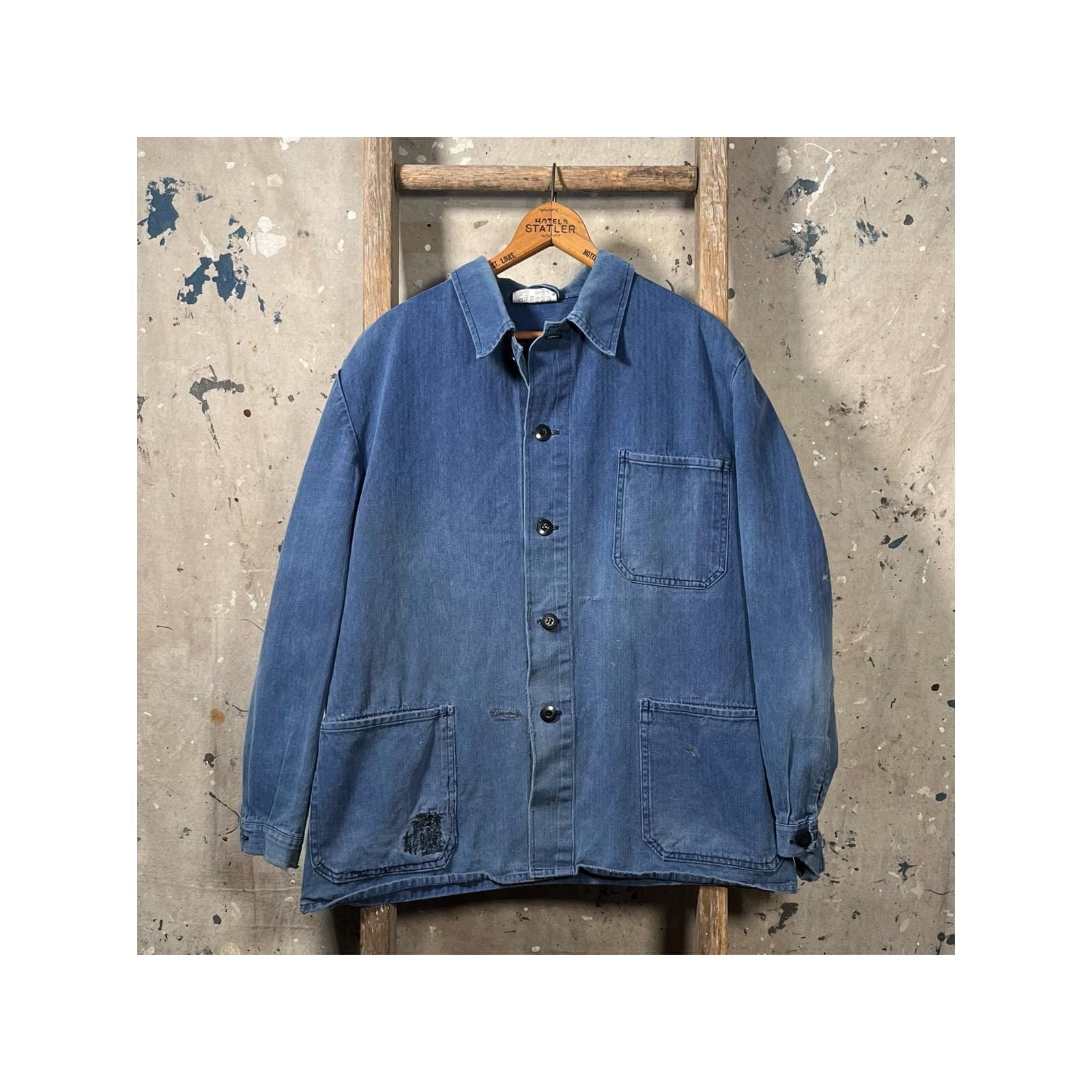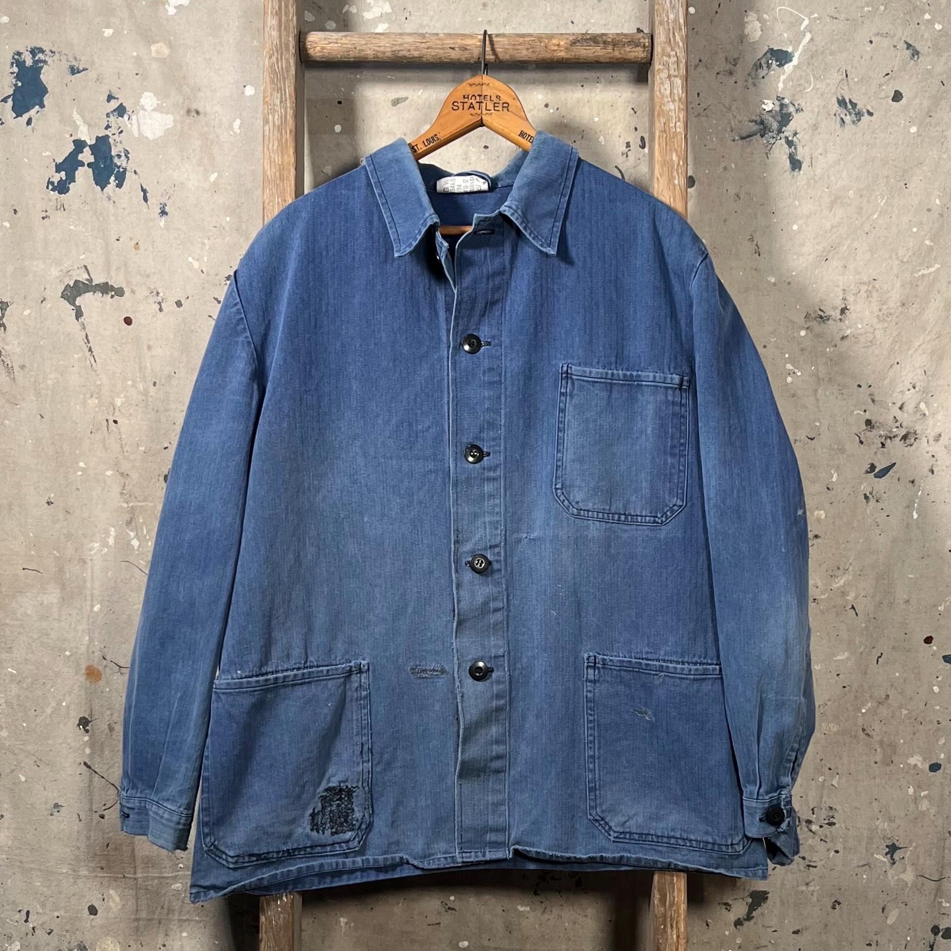 Uniquely Distressed blue herringbone chore jacket . Salty natural distressed indigo color. Natural sun fading throughout , misc holes and original darning repair. Please see photos. Sold as is , Good condition.