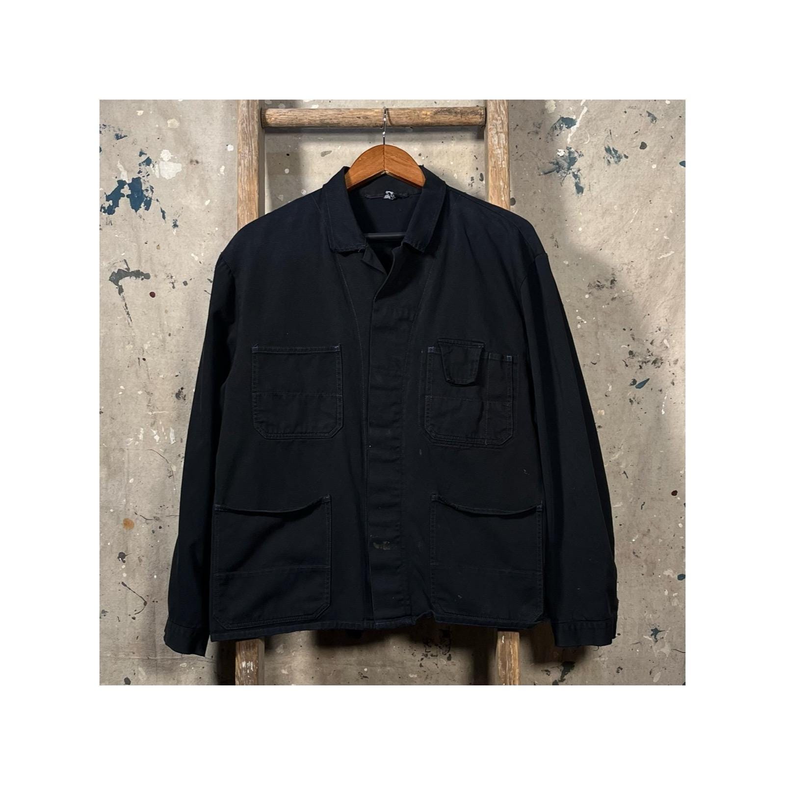 Black overdye cotton twill chore coat . All cotton 4 pocket Euro chore jacket . Original distressing throughout , see photos .