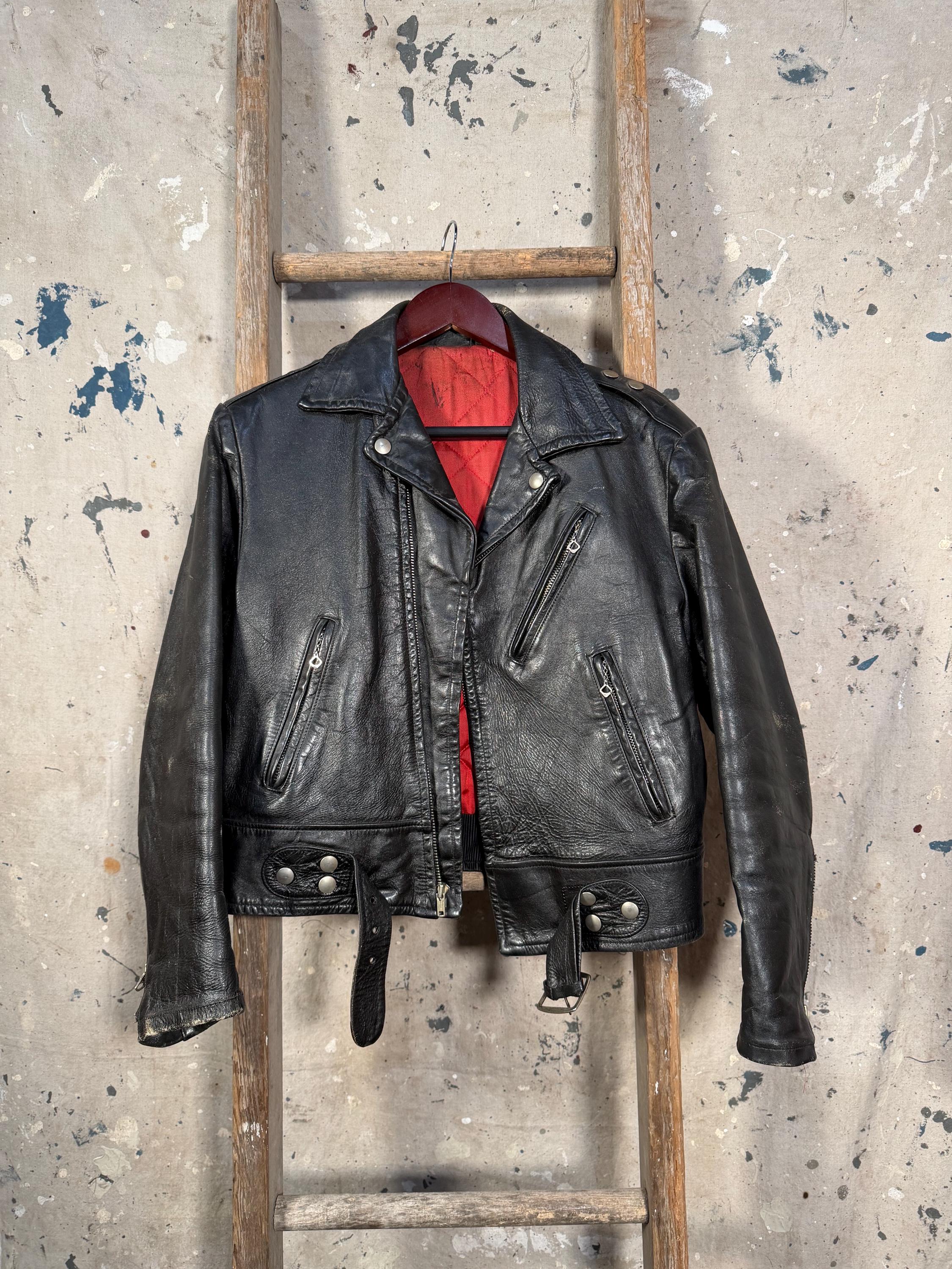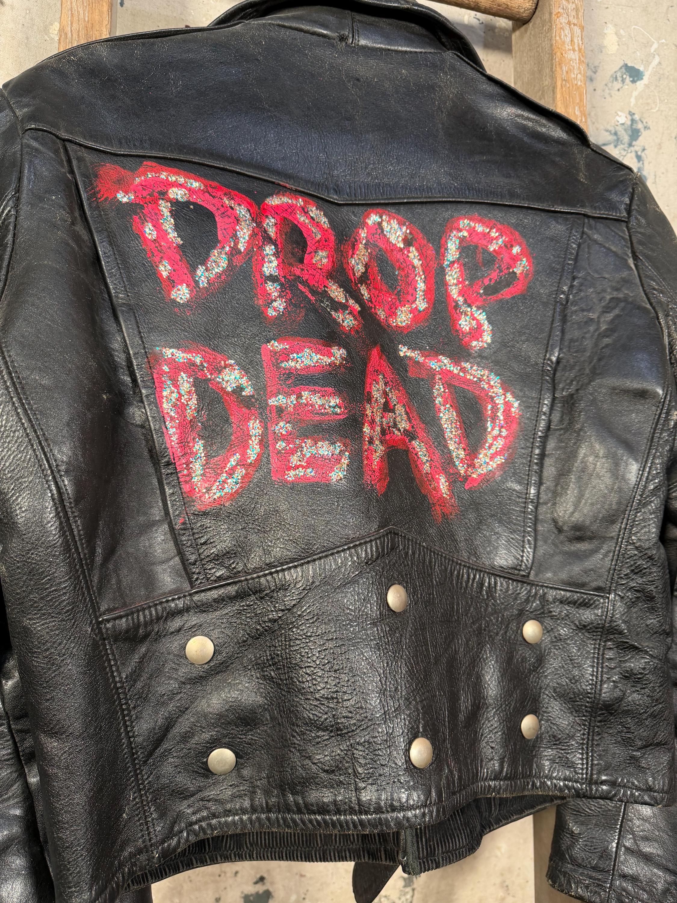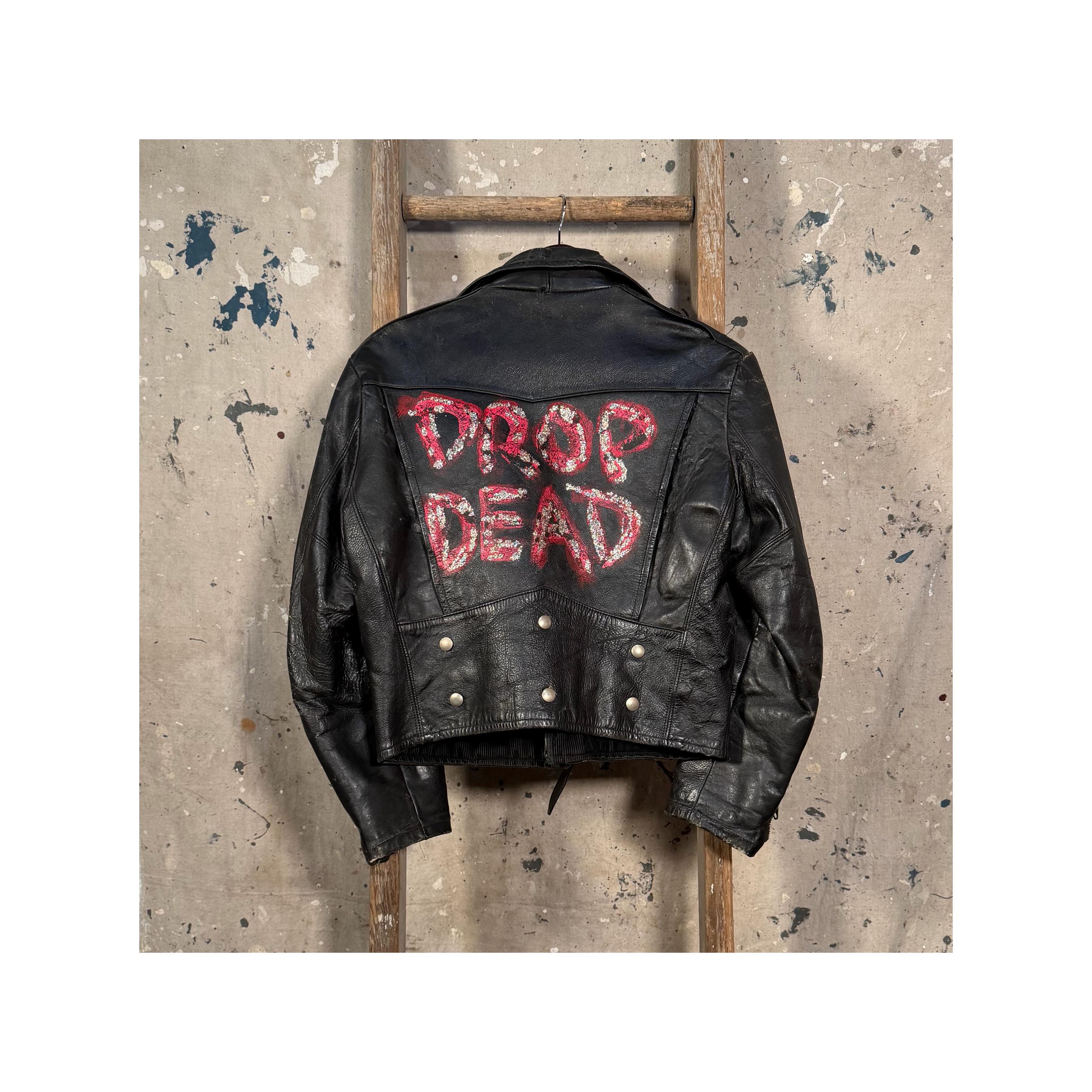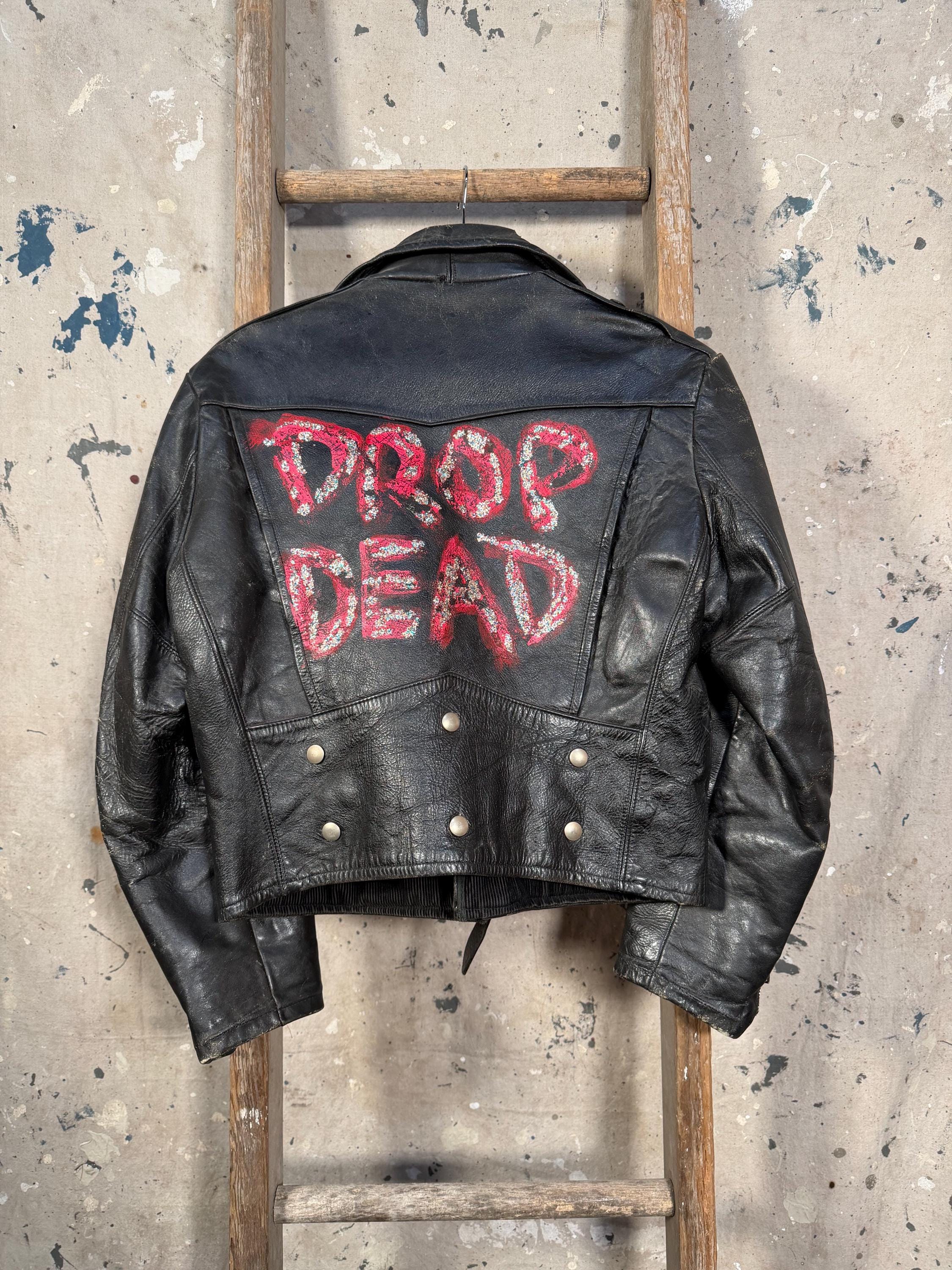 1960s Leather Motorcycle Jacket. Features 3 front zip pockets , heavily worn in leather with red nylon lining & belt. 'Drop Dead' Hand Painted on back. Good vintage condition with natural distressing throughout - see photos.