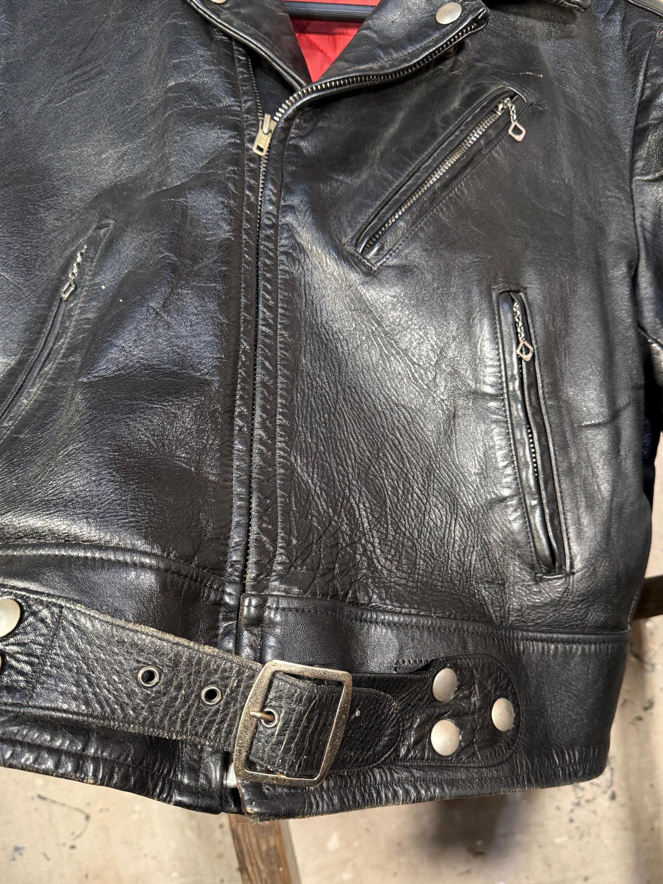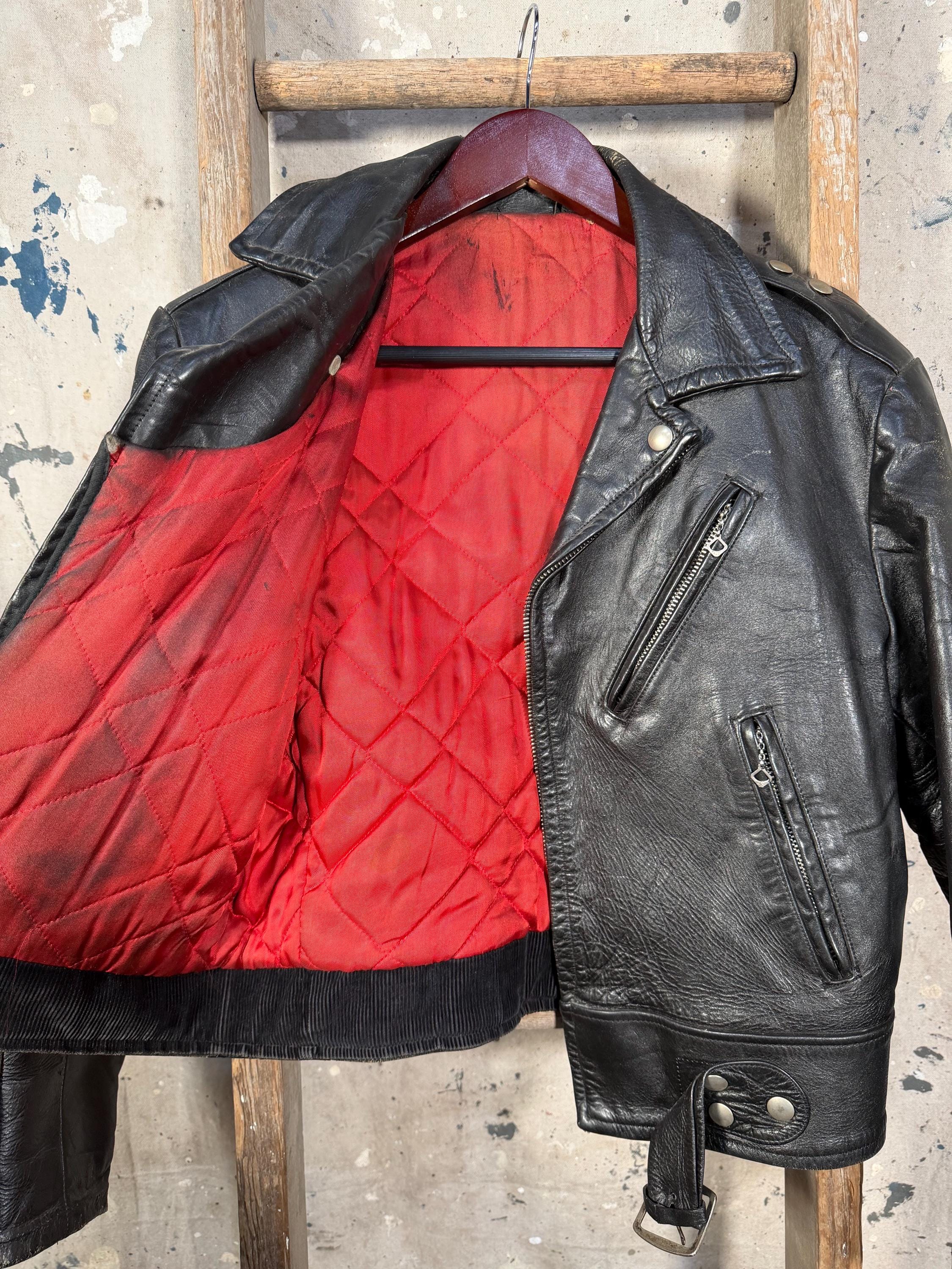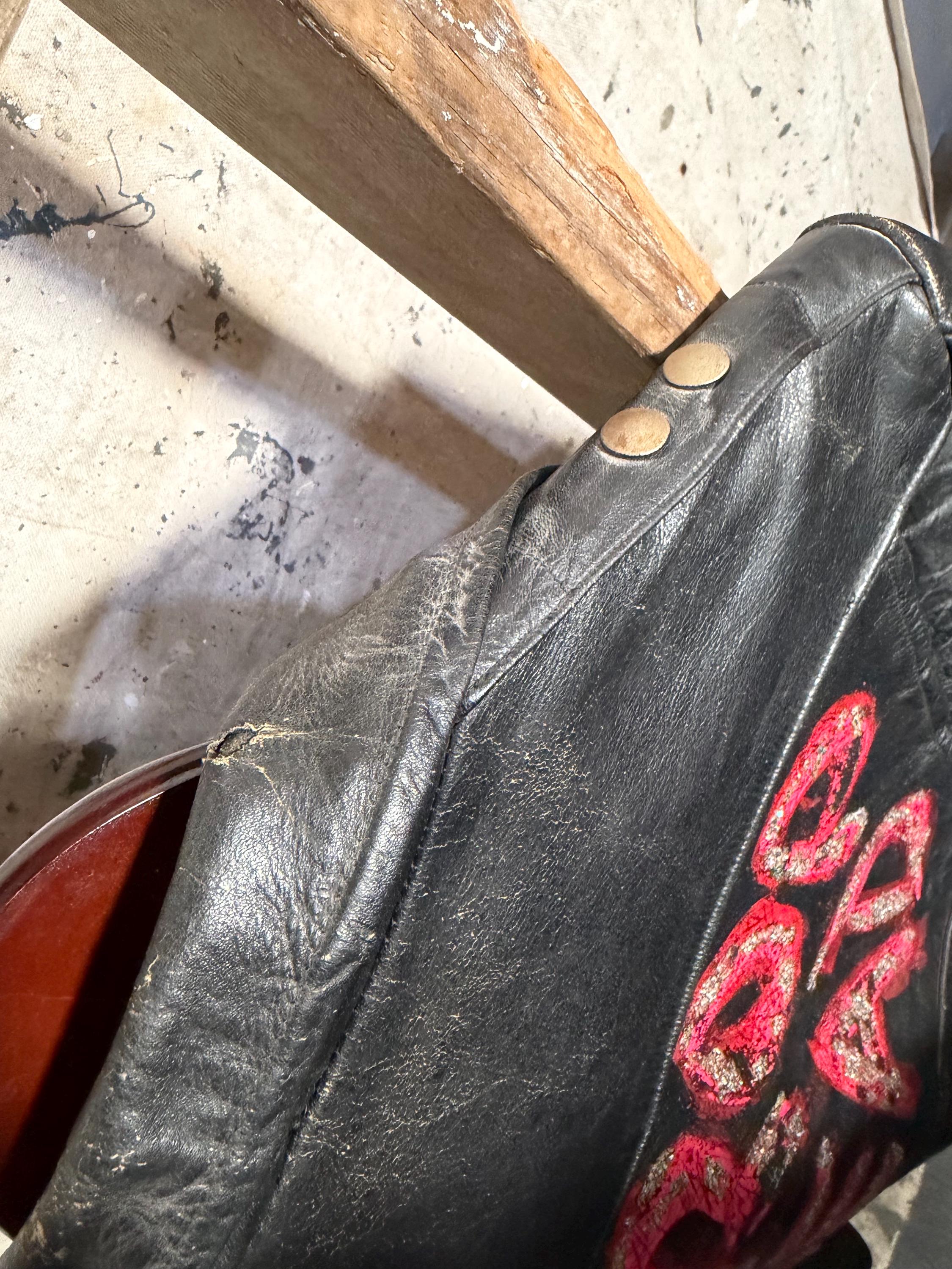 1960s Leather Motorcycle Jacket. Features 3 front zip pockets , heavily worn in leather with red nylon lining & belt. 'Drop Dead' Hand Painted on back. Good vintage condition with natural distressing throughout - see photos.