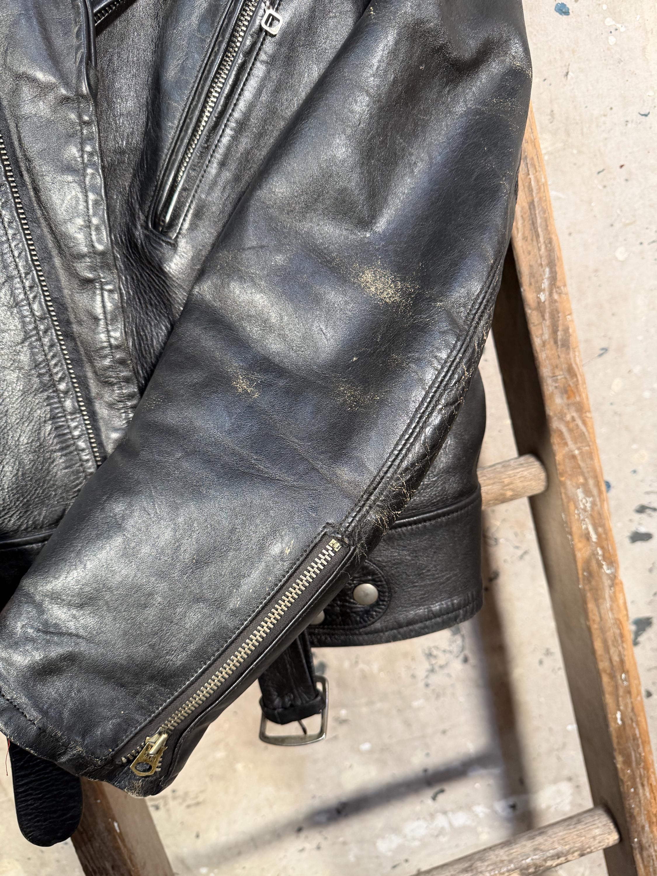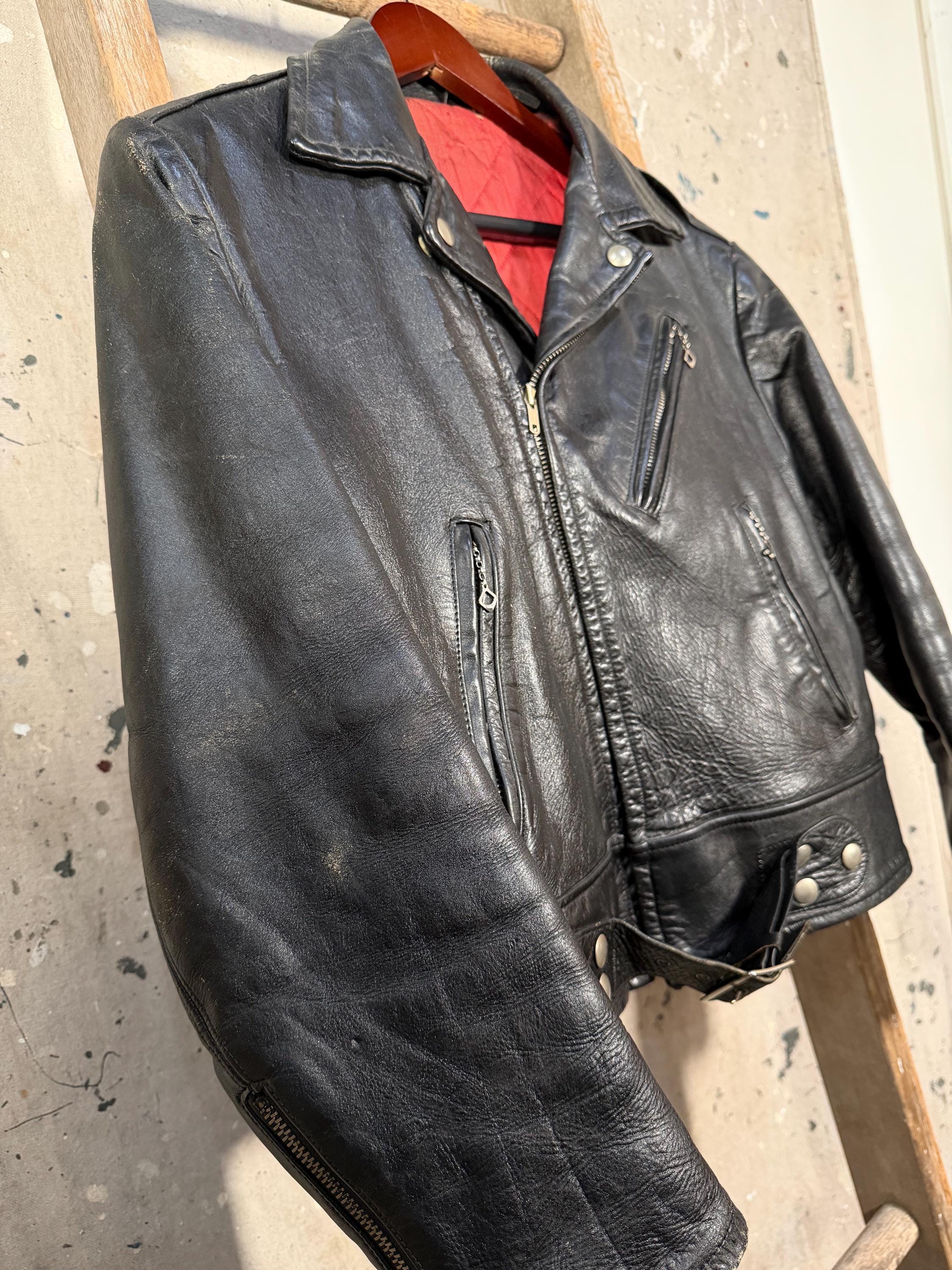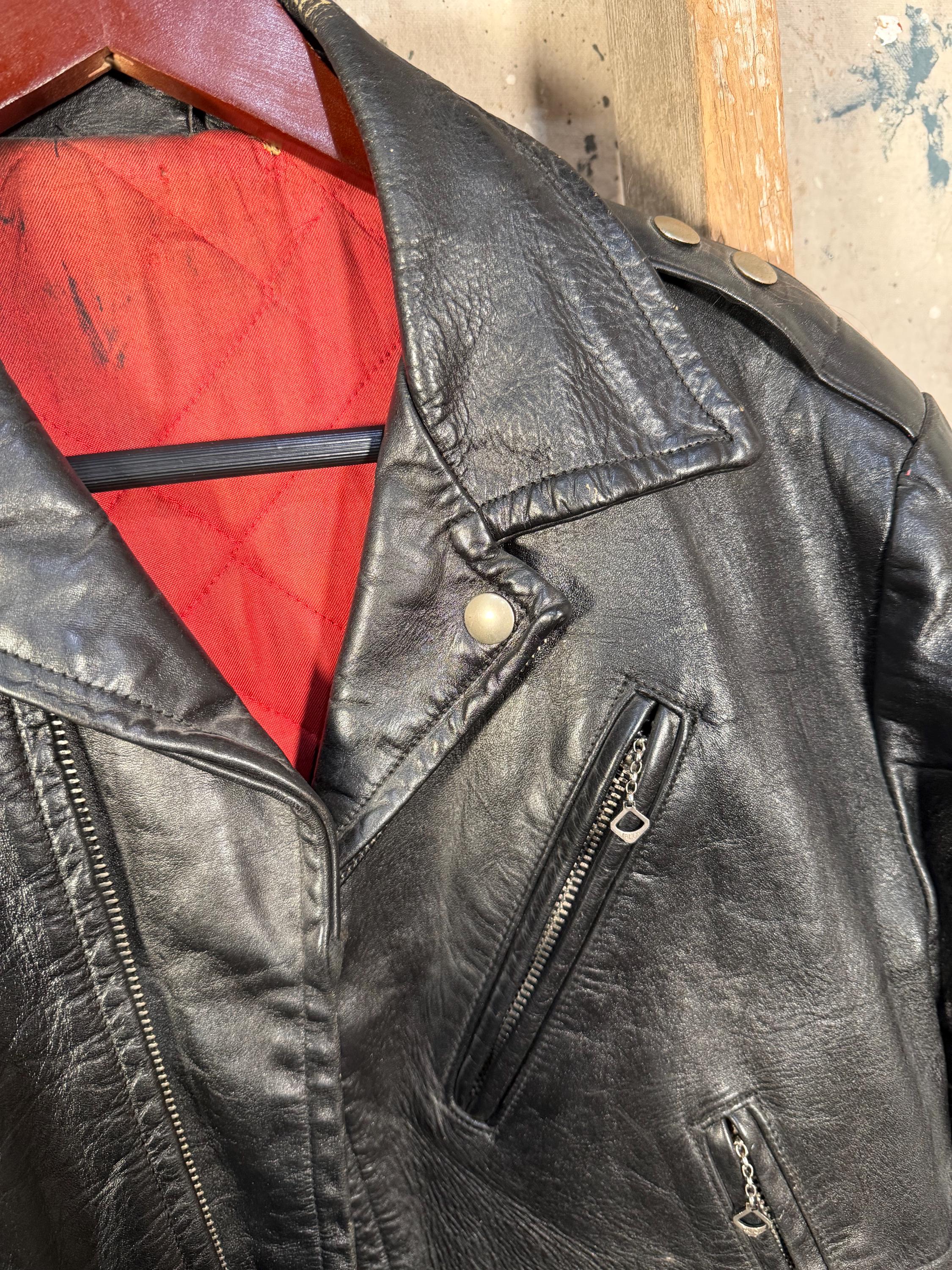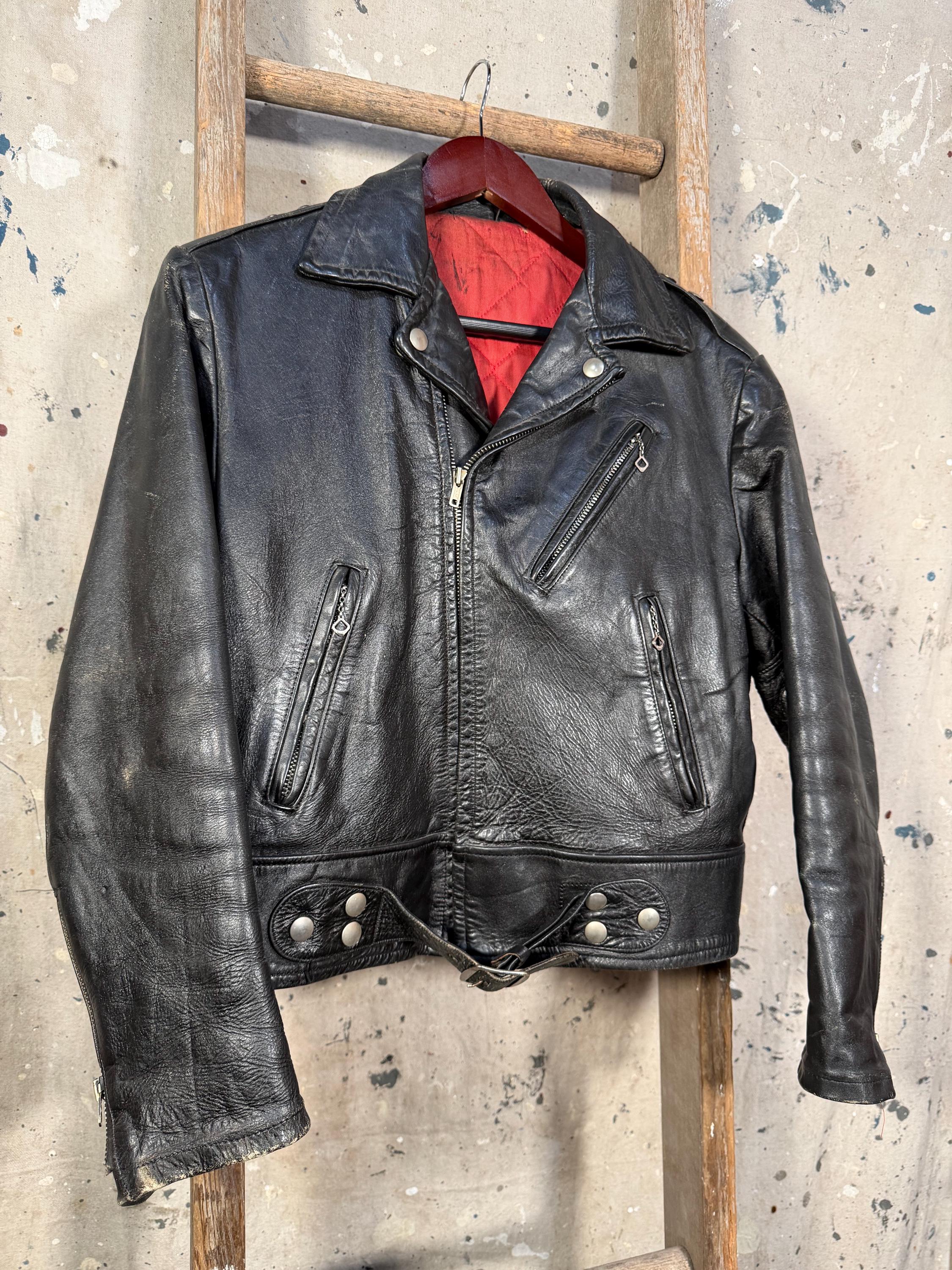1960s Leather Motorcycle Jacket. Features 3 front zip pockets , heavily worn in leather with red nylon lining & belt. 'Drop Dead' Hand Painted on back. Good vintage condition with natural distressing throughout - see photos.