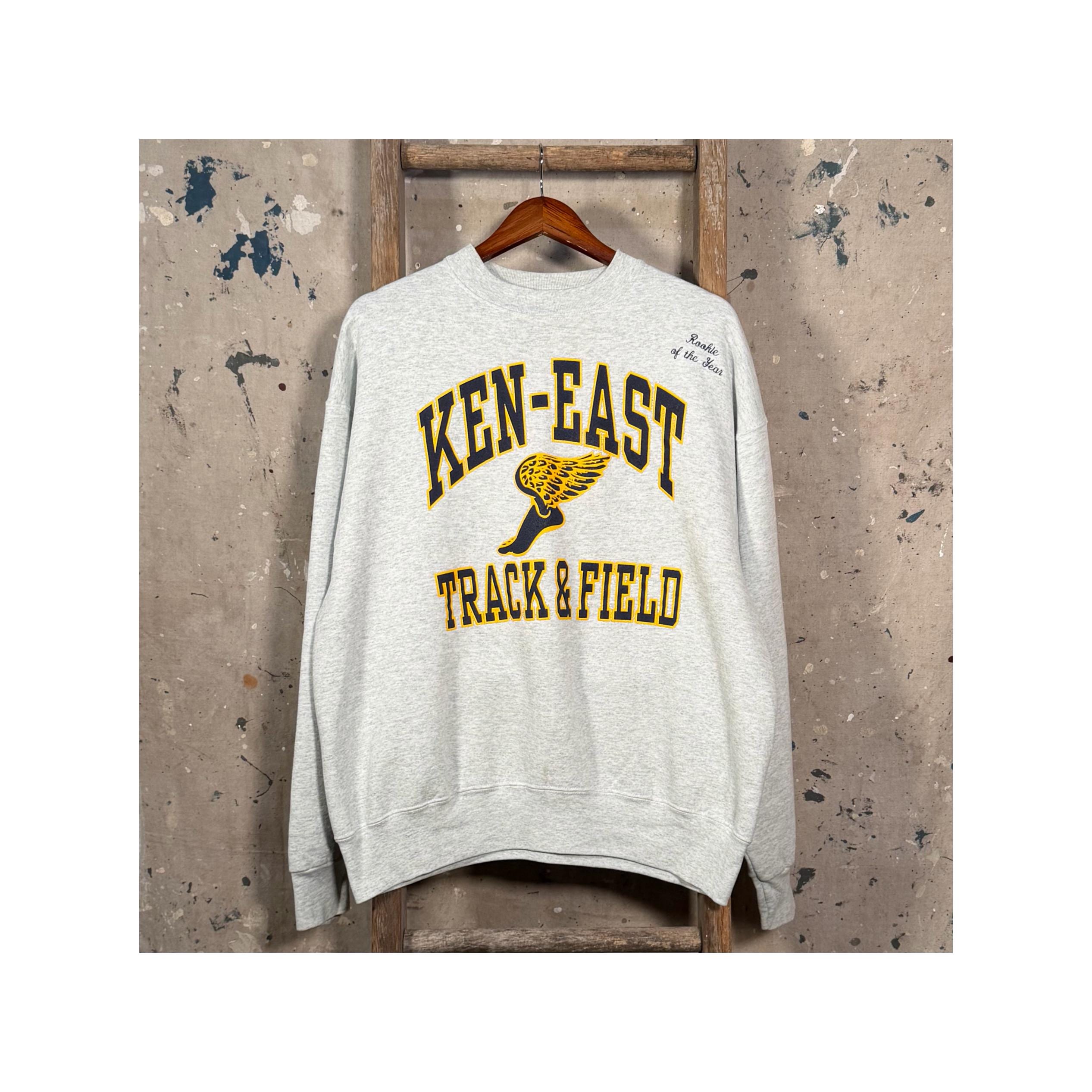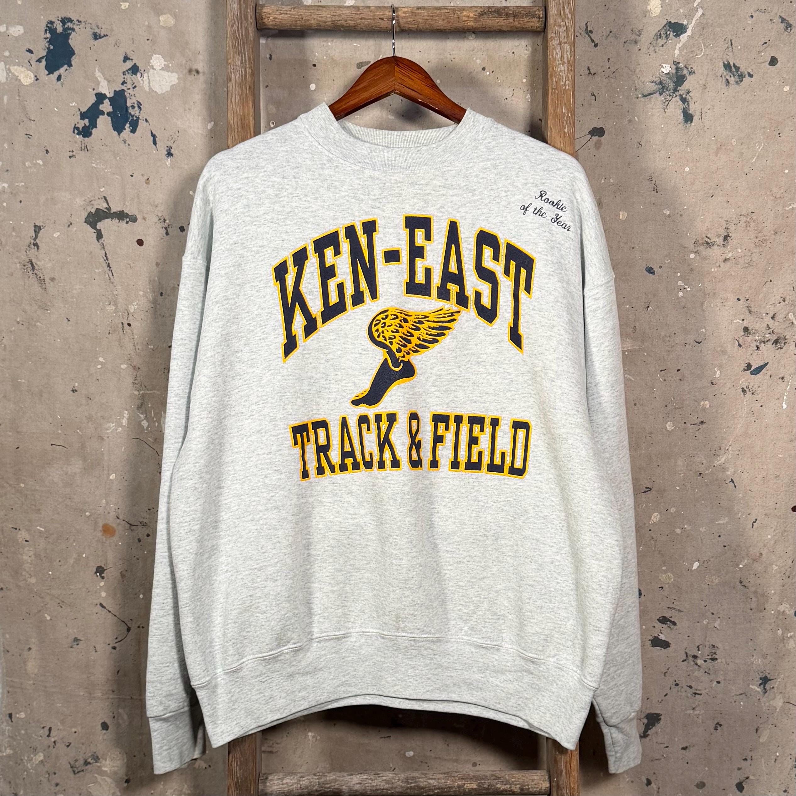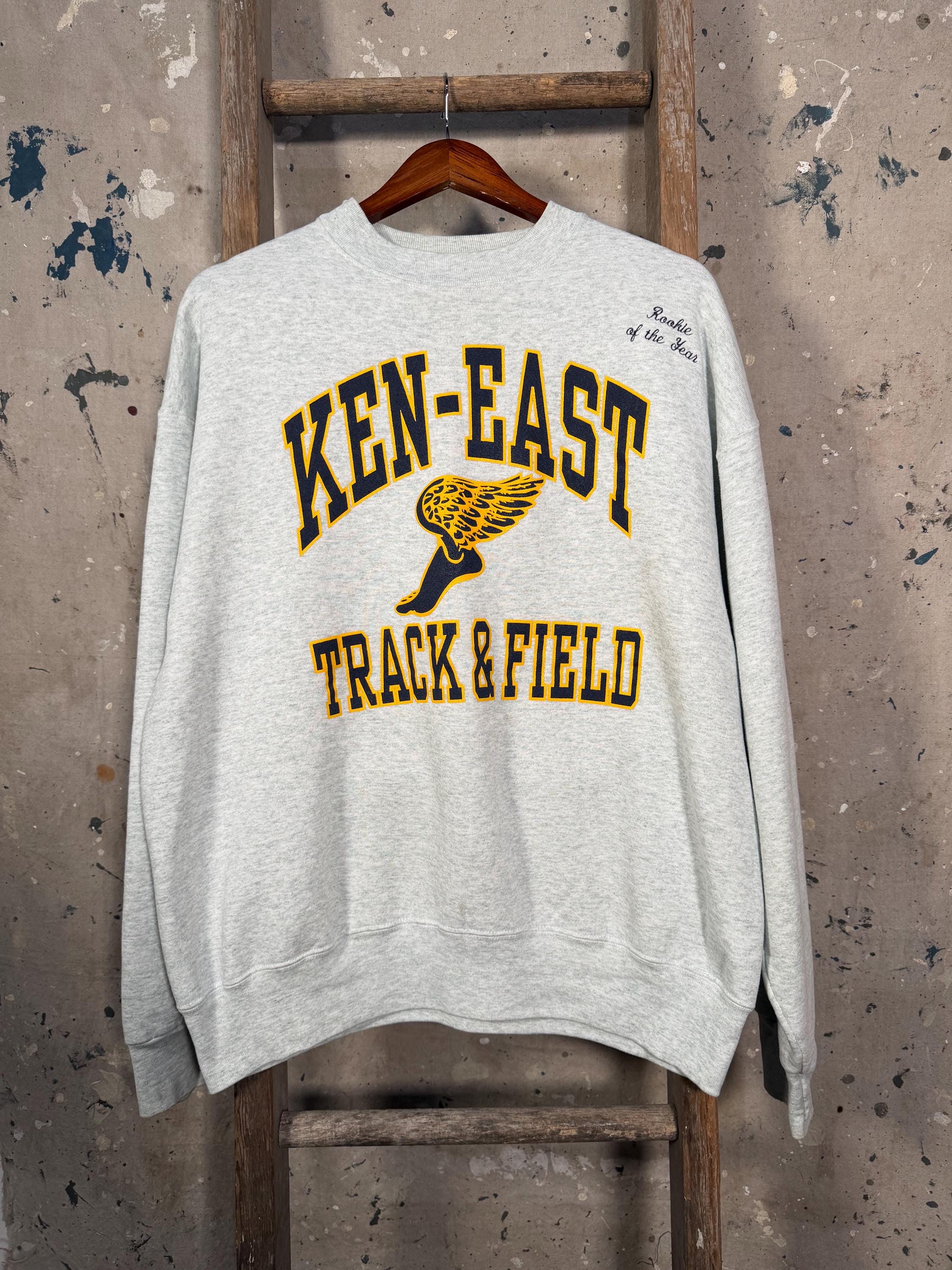 1990s Ken-East Track & Field Crewneck Sweatshirt by Fruit of The Loom. Heather Grey with Large 'Winged Foot' Track graphic on chest. 'Rookie Of The Year' embroidery at shoulder. Great condition - see photos .