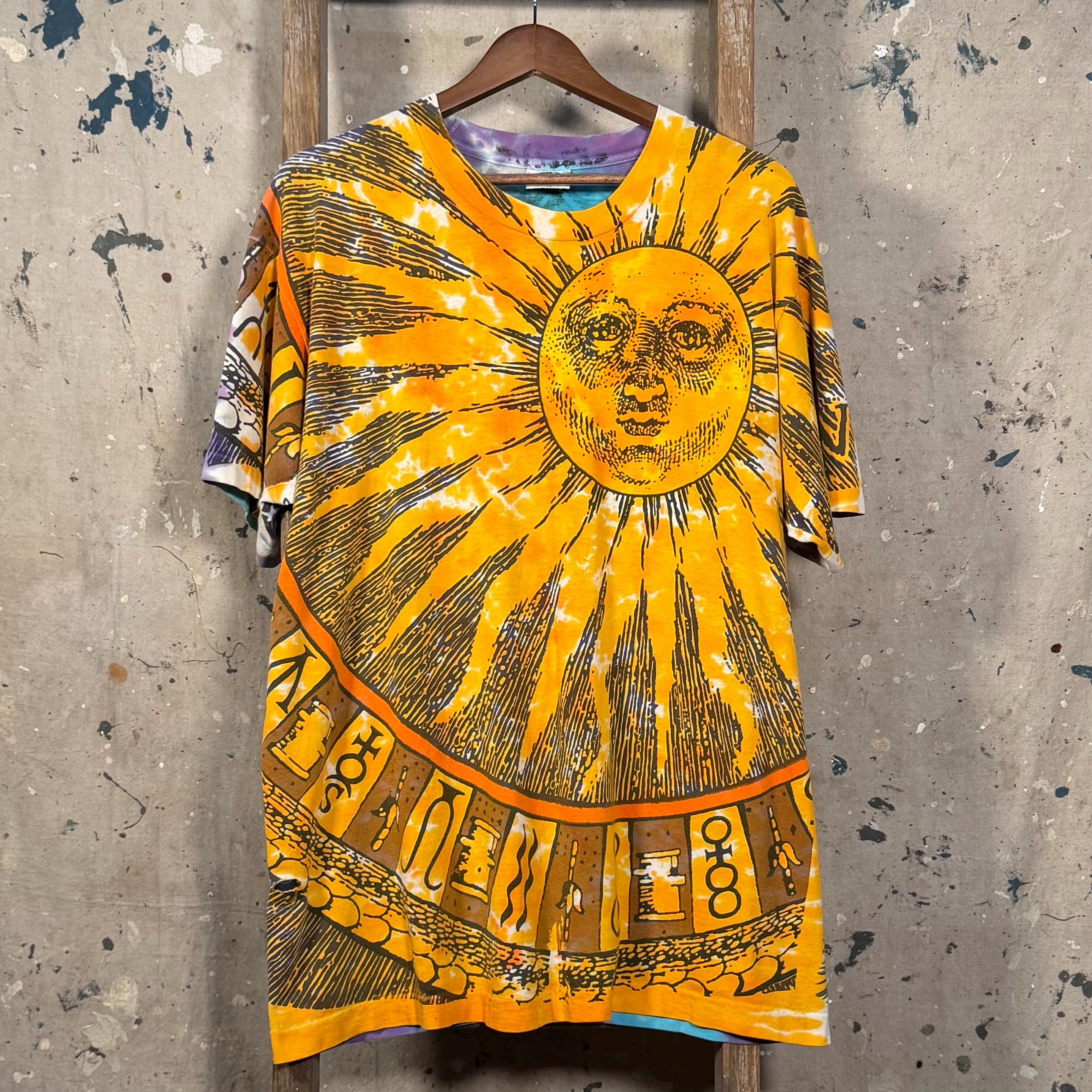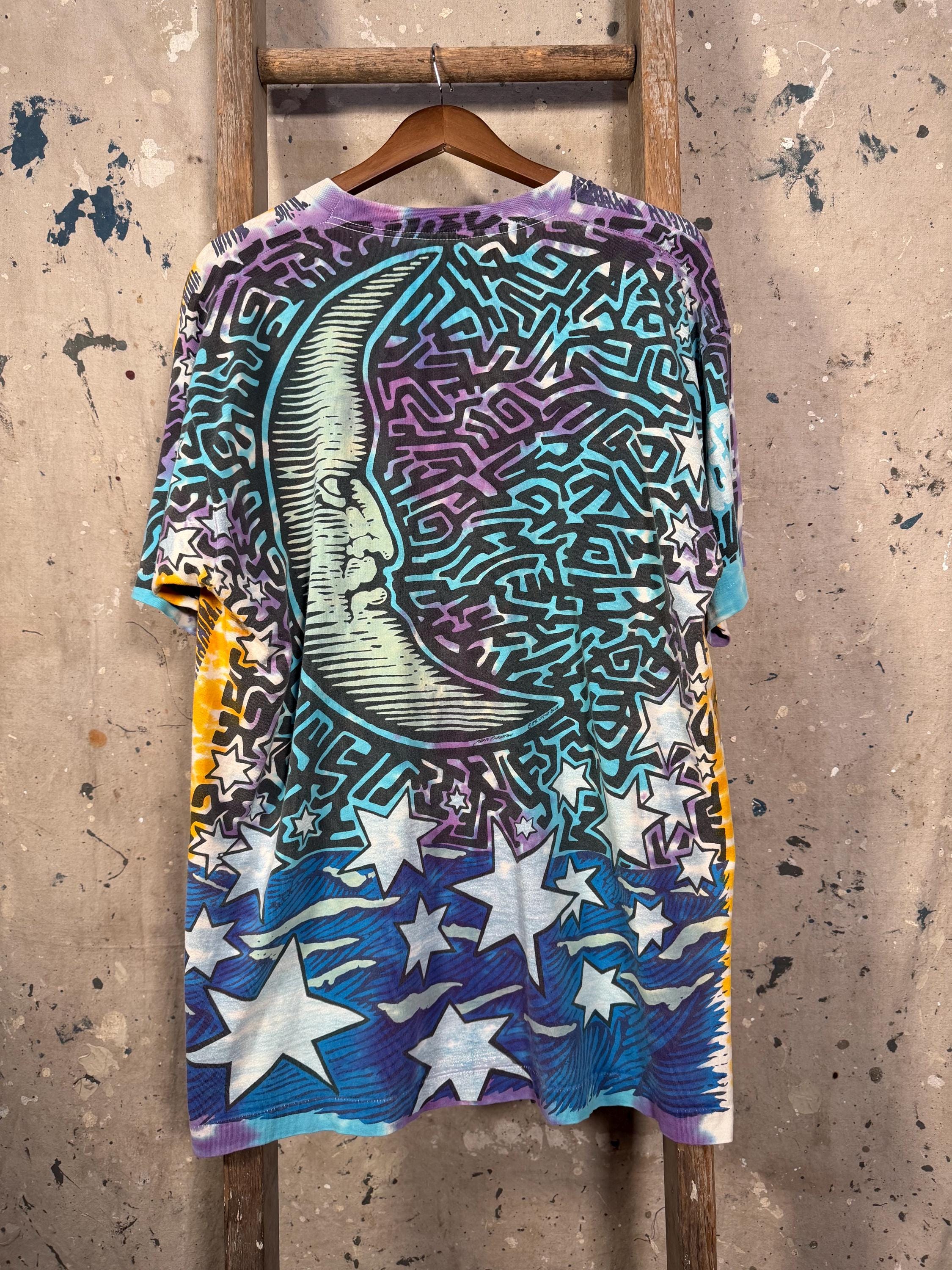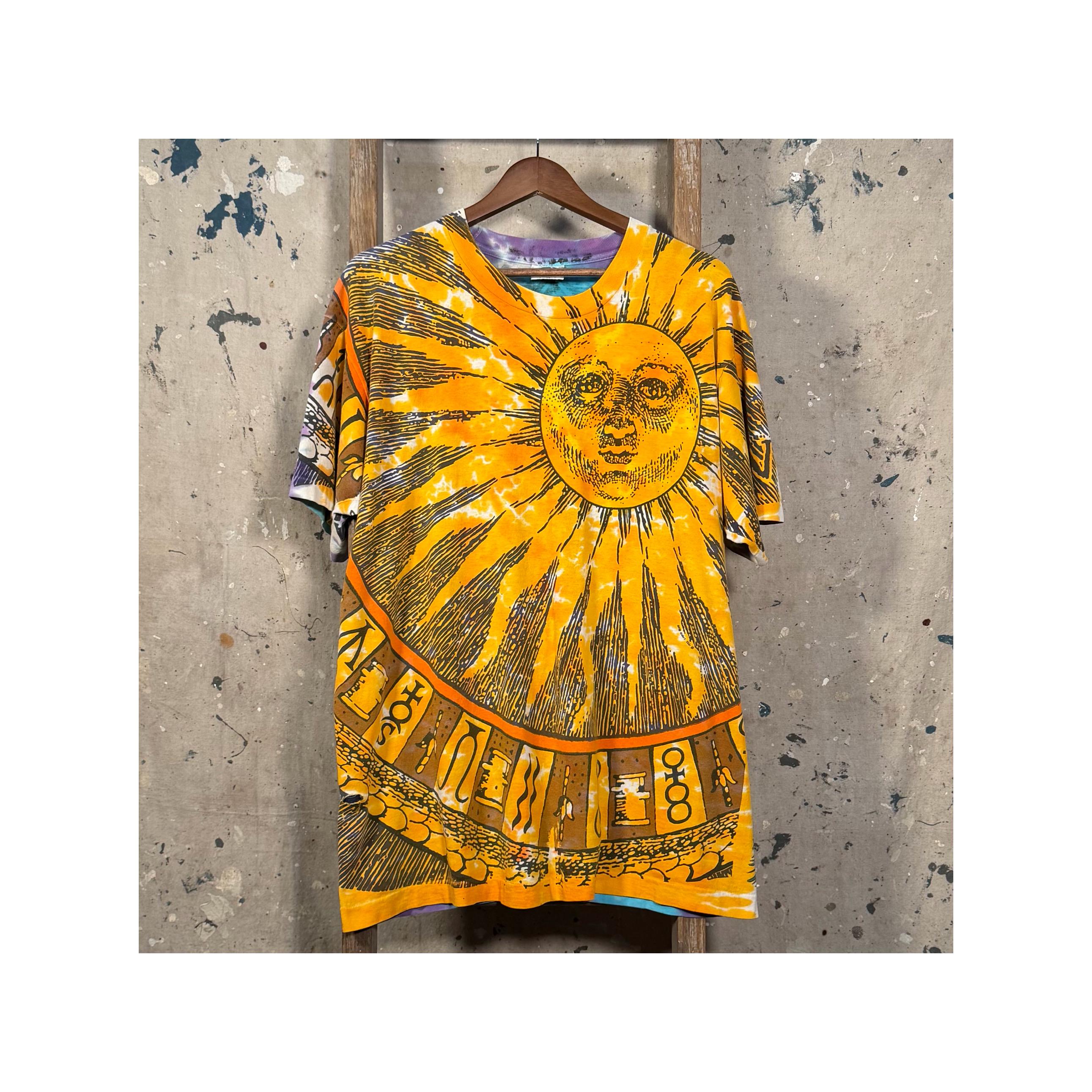 Original 1990s Sun & Moon All Over Print T-Shirt. Double sided , detailed graphic. Single stitch , liquid blue tee. Good condition , natural distressing , small hole as pictured - see photos.
