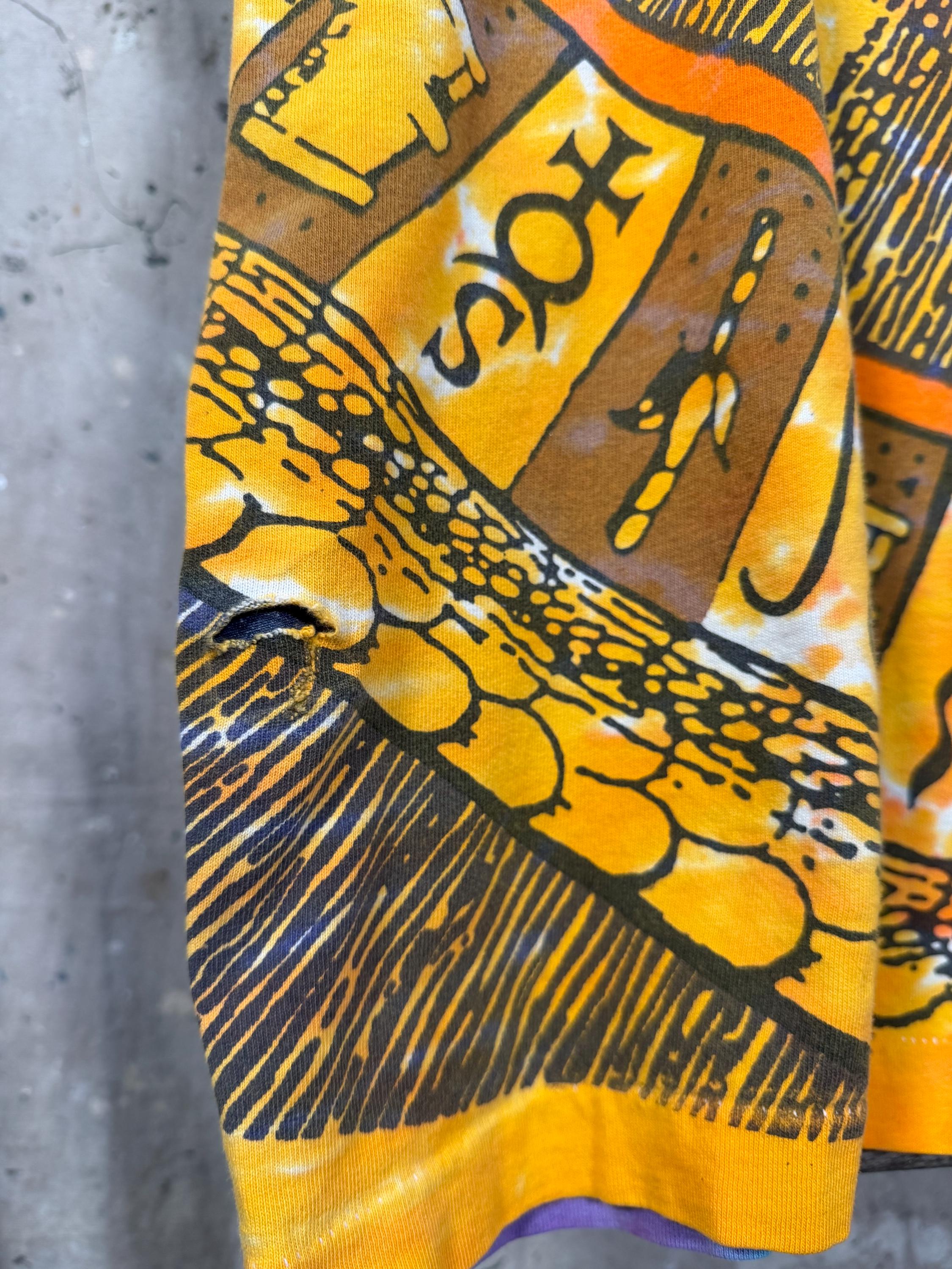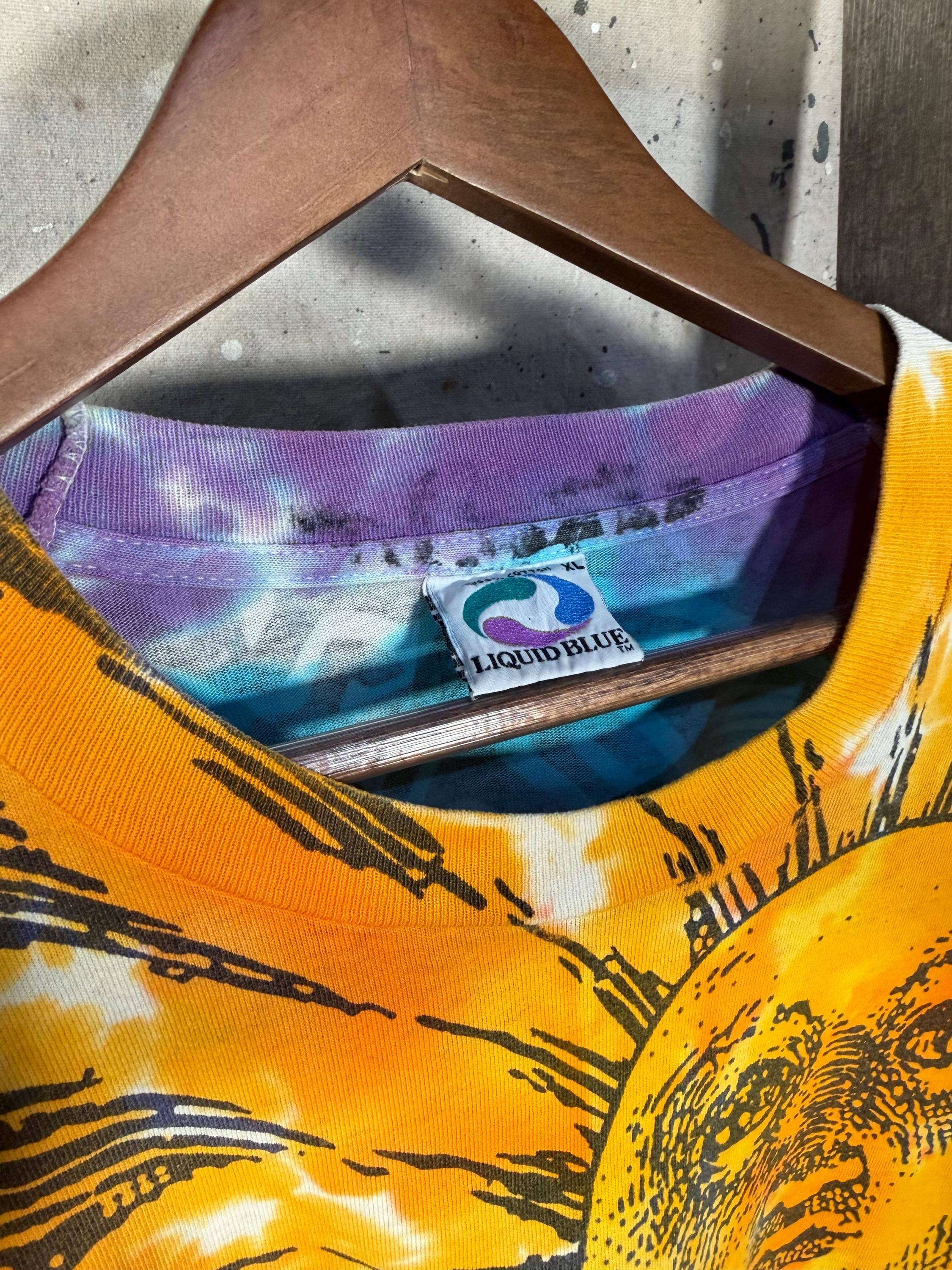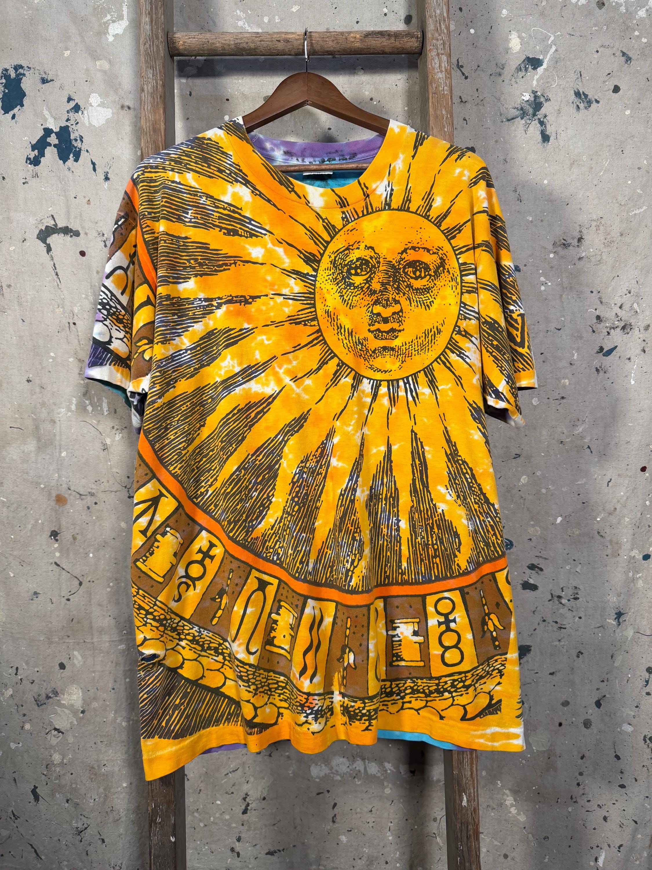 Original 1990s Sun & Moon All Over Print T-Shirt. Double sided , detailed graphic. Single stitch , liquid blue tee. Good condition , natural distressing , small hole as pictured - see photos.
