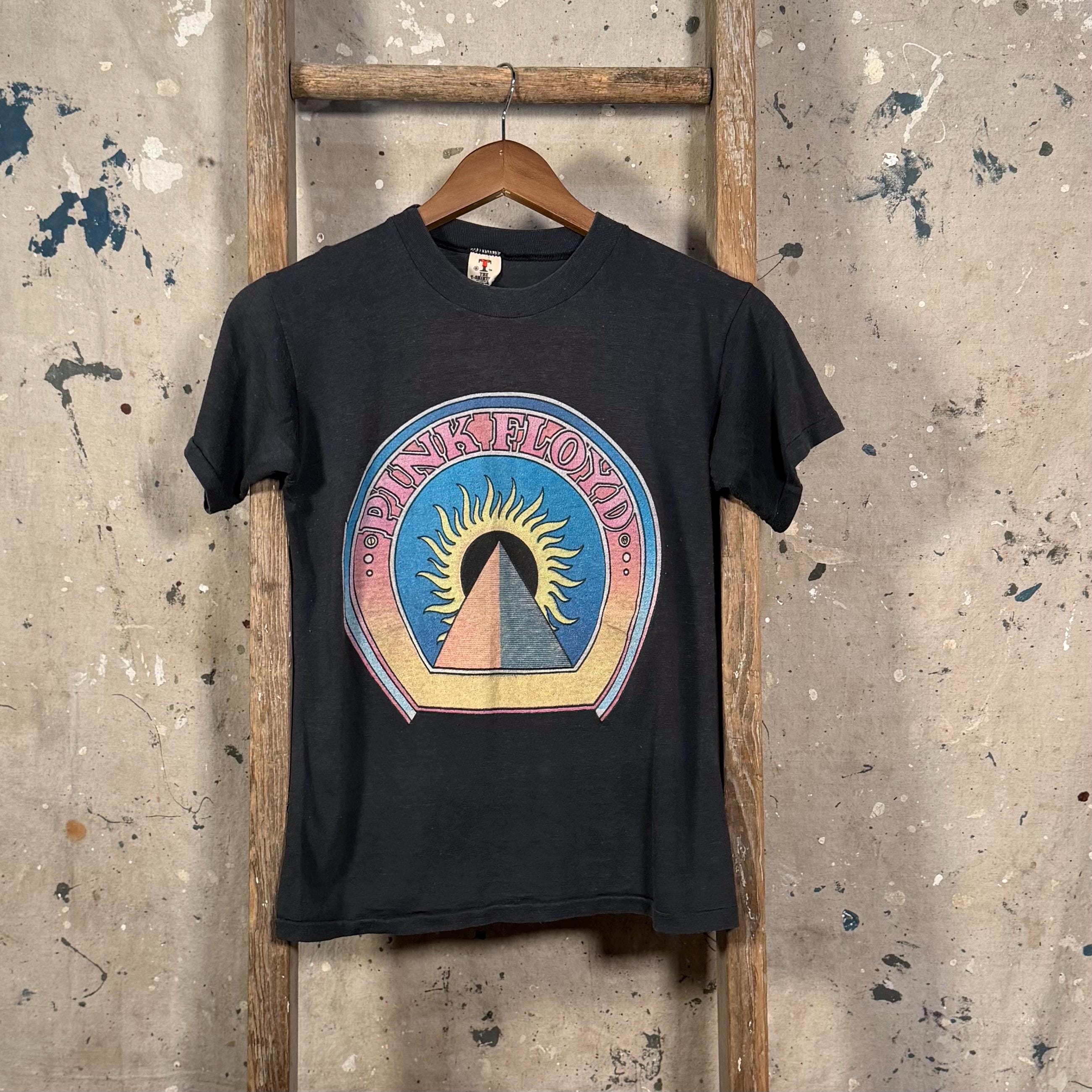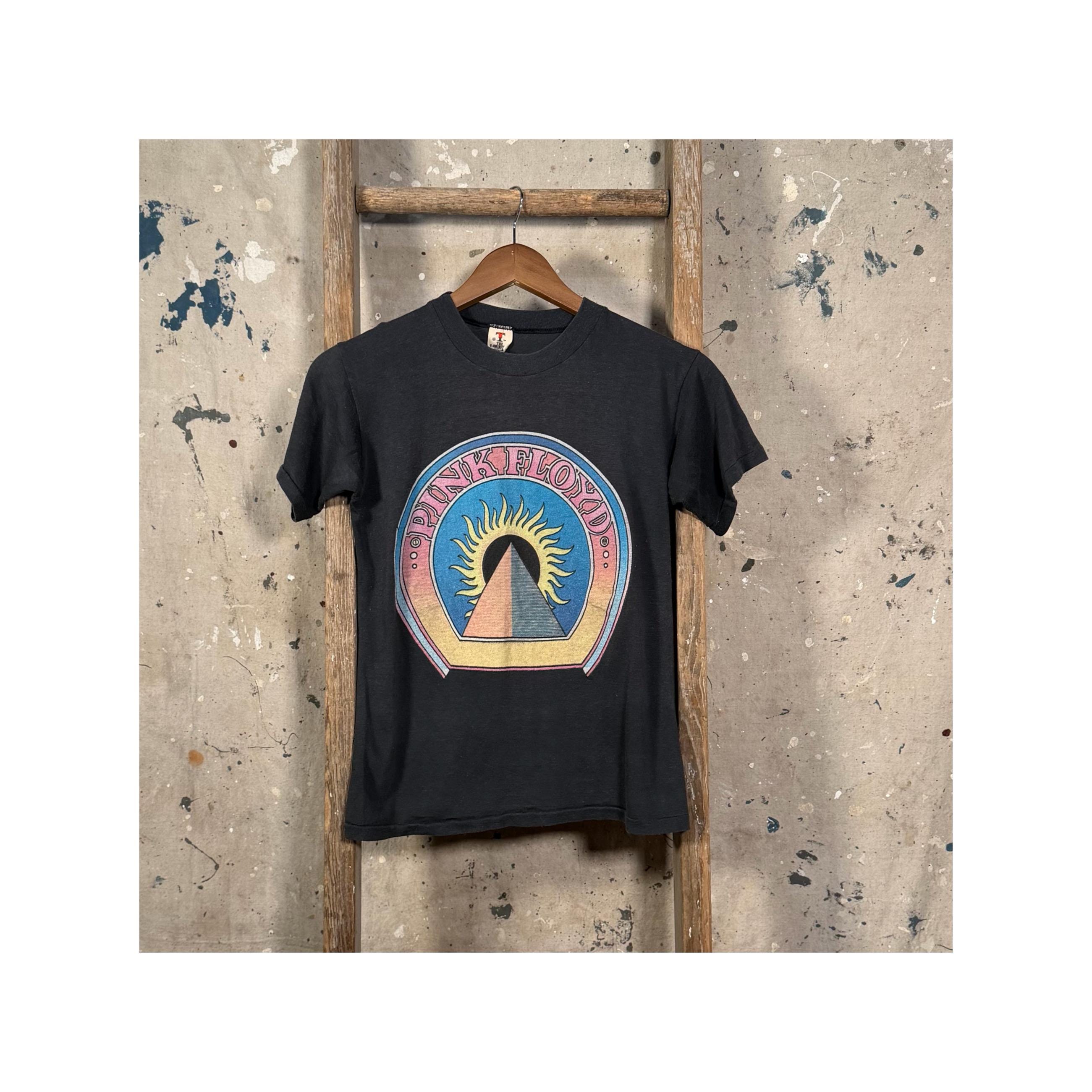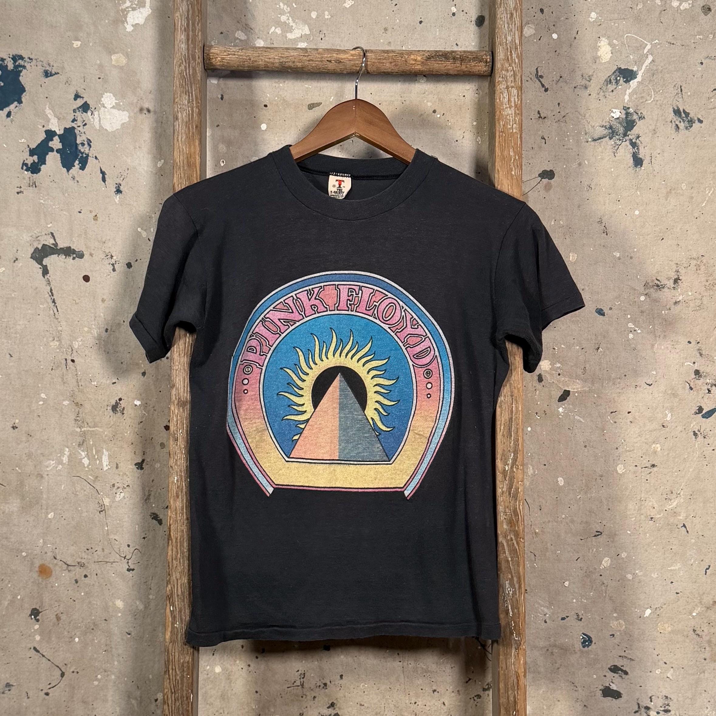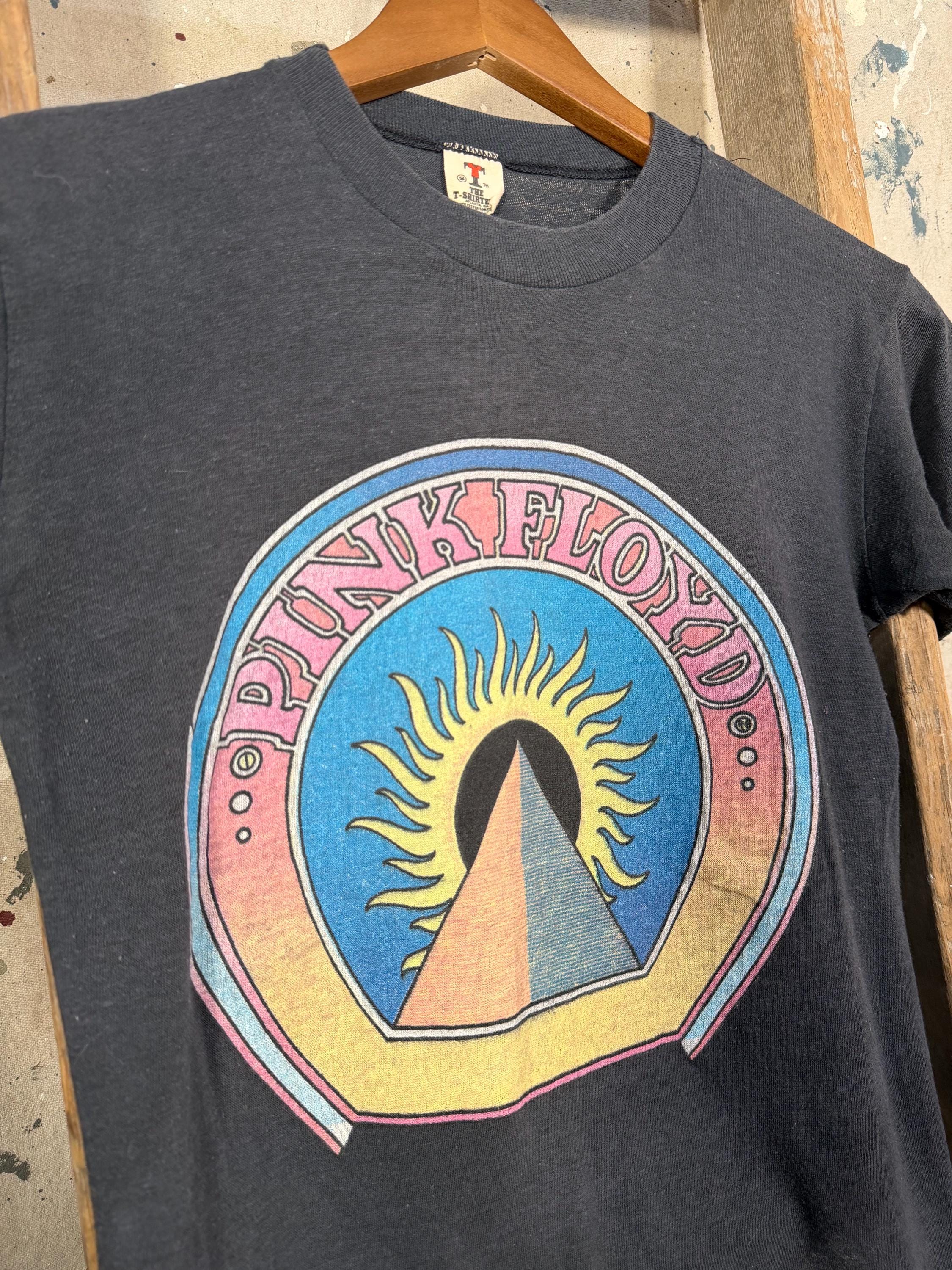1970s Pink Floyd T-Shirt. Features chest graphic of pyramid , sun & eclipse on faded black t-shirt. Great condition, desirable fades & distressing throughout - see photos.