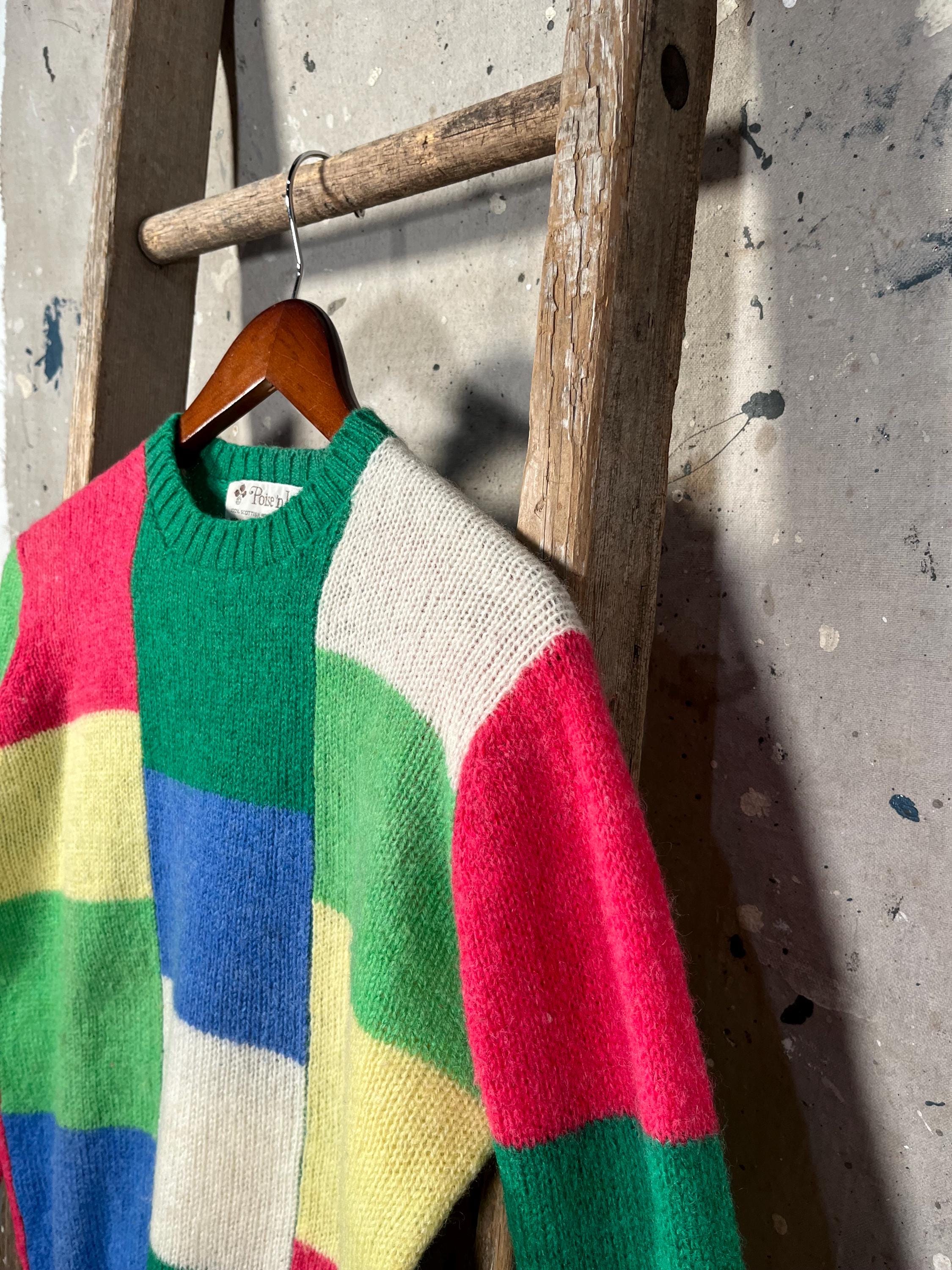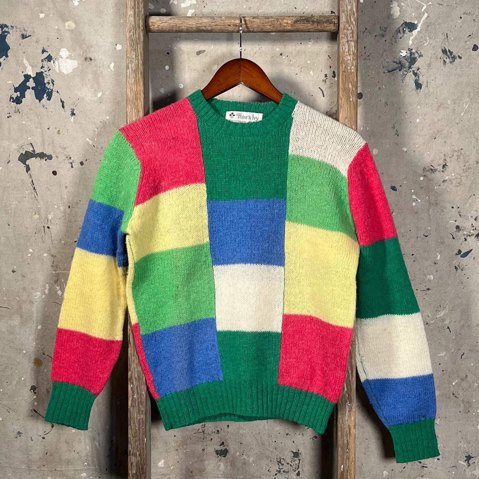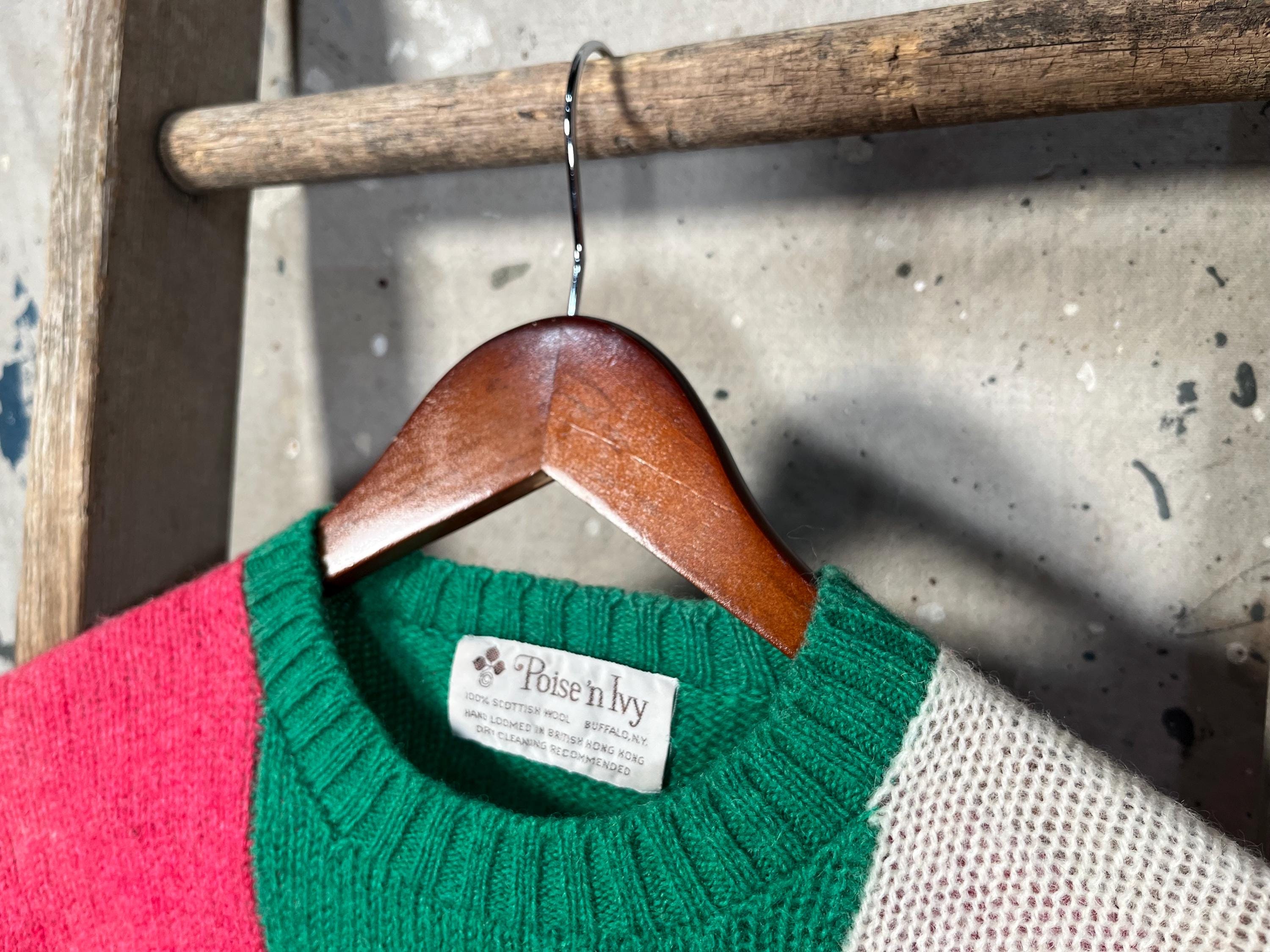 Amazing 1970s Color Block Sweater by Poise'n Ivy. 100% Scottish wool , hand loomed w/ vibrant blues , yellows & greens . Timeless , preppy ivy league style Good condition - see photos.