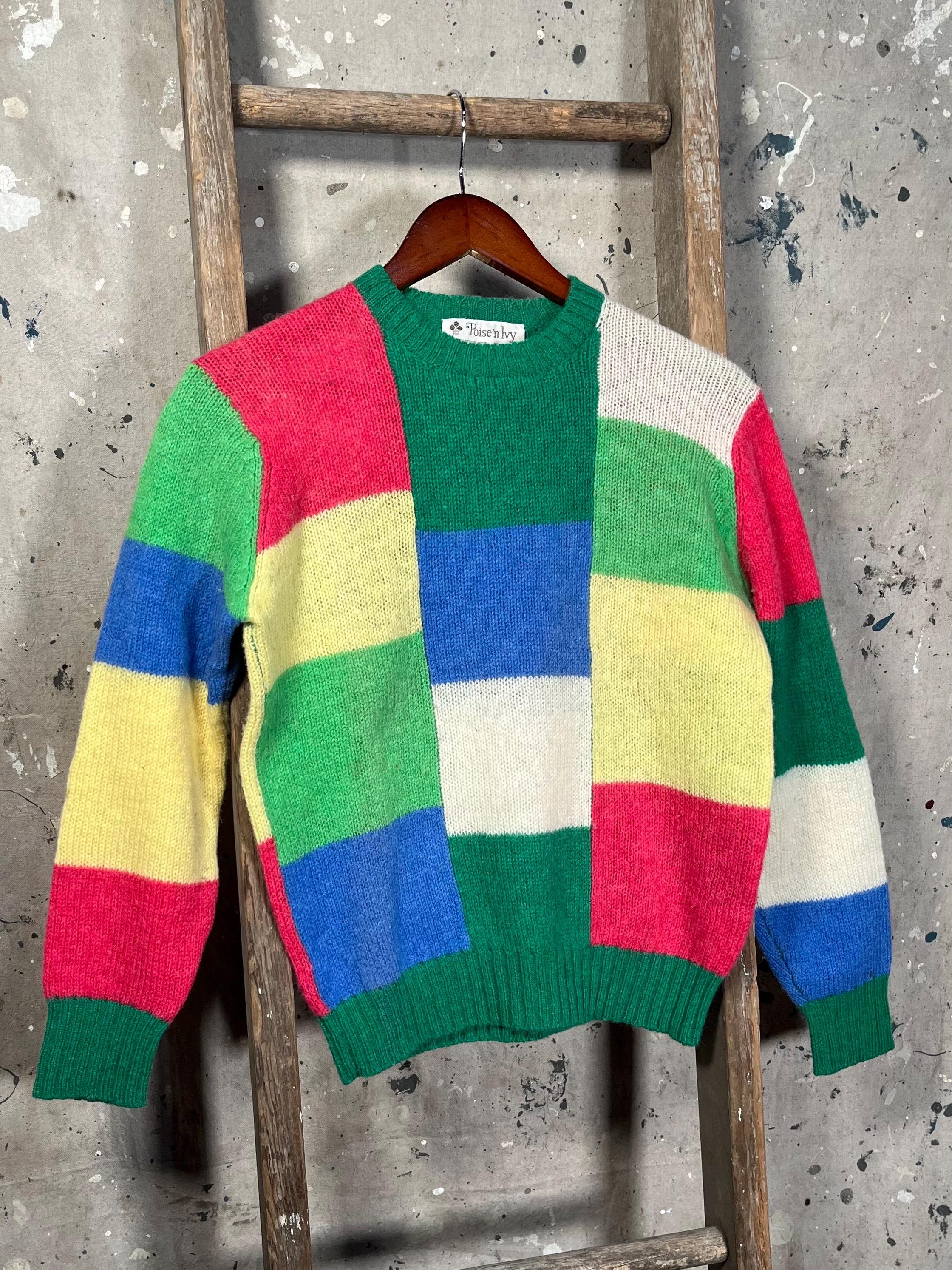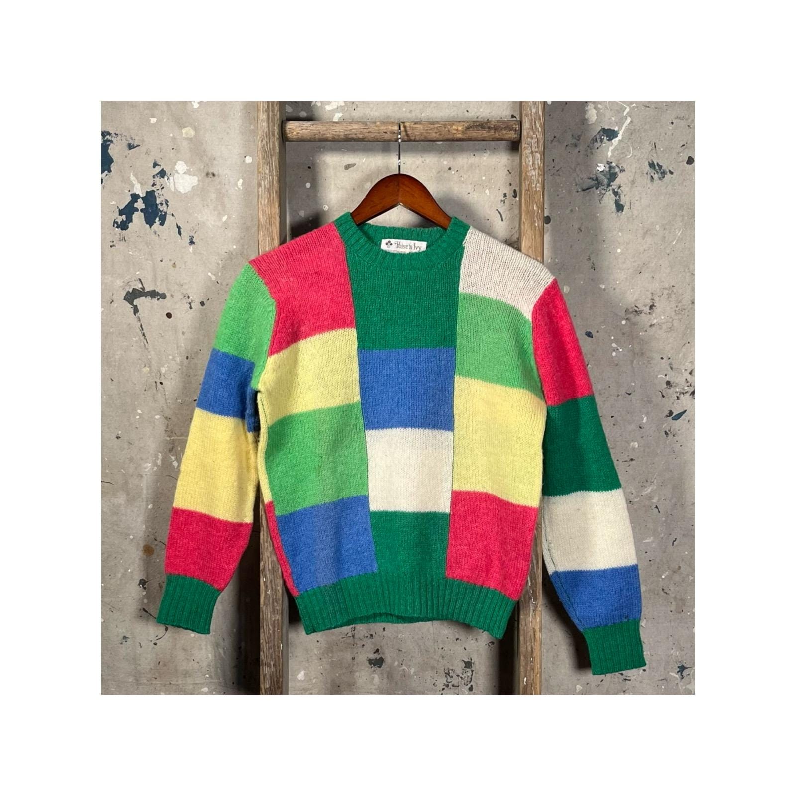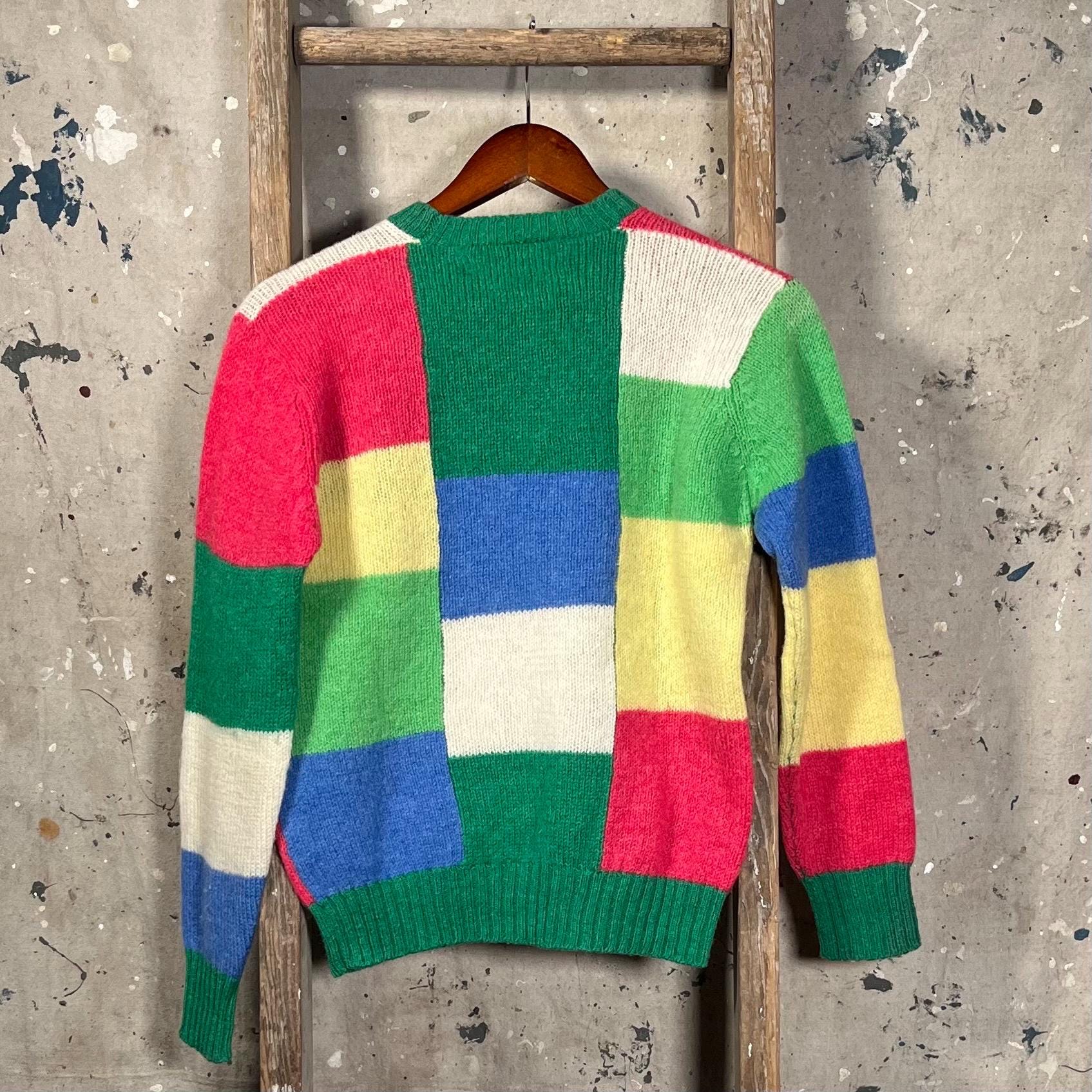 Amazing 1970s Color Block Sweater by Poise'n Ivy. 100% Scottish wool , hand loomed w/ vibrant blues , yellows & greens . Timeless , preppy ivy league style Good condition - see photos.