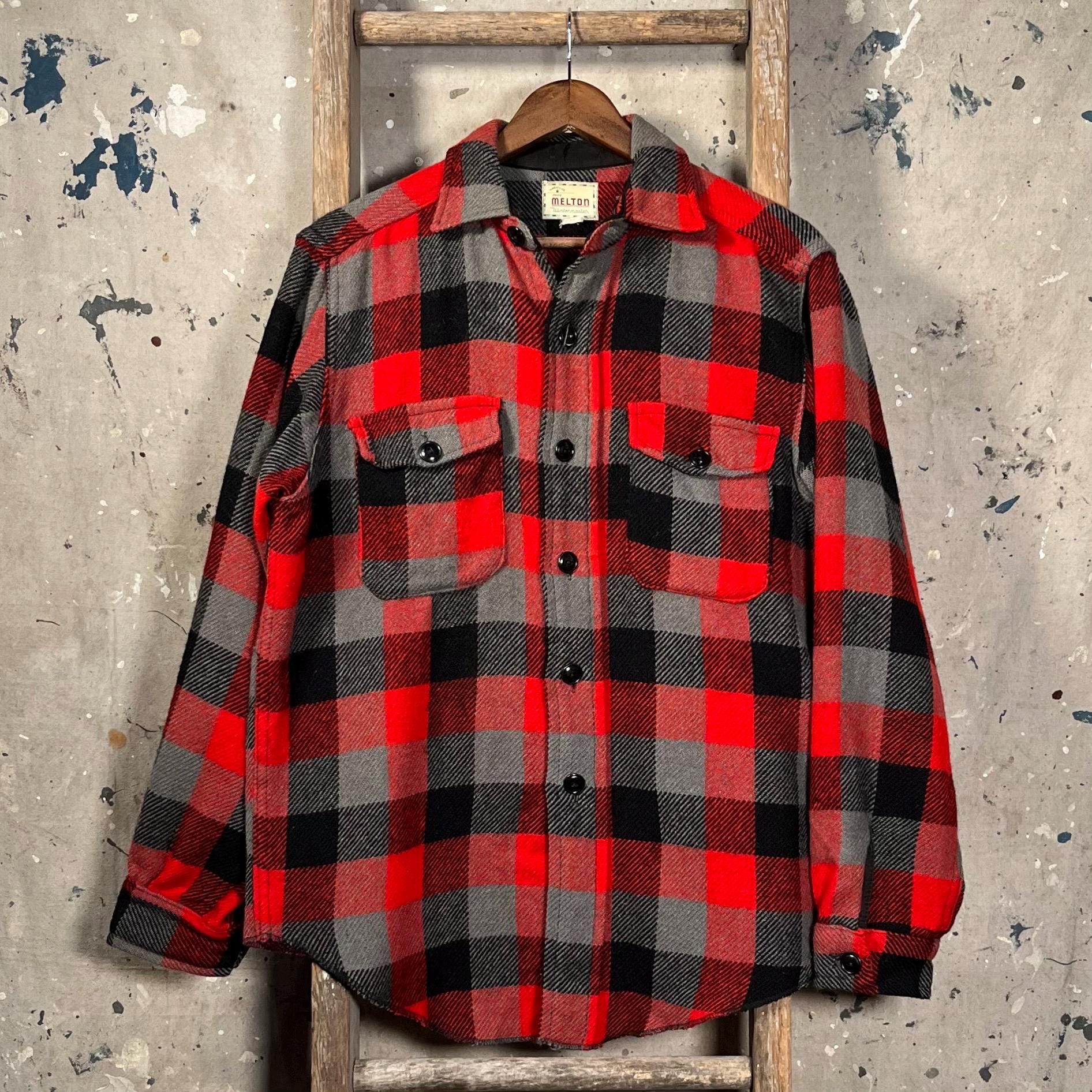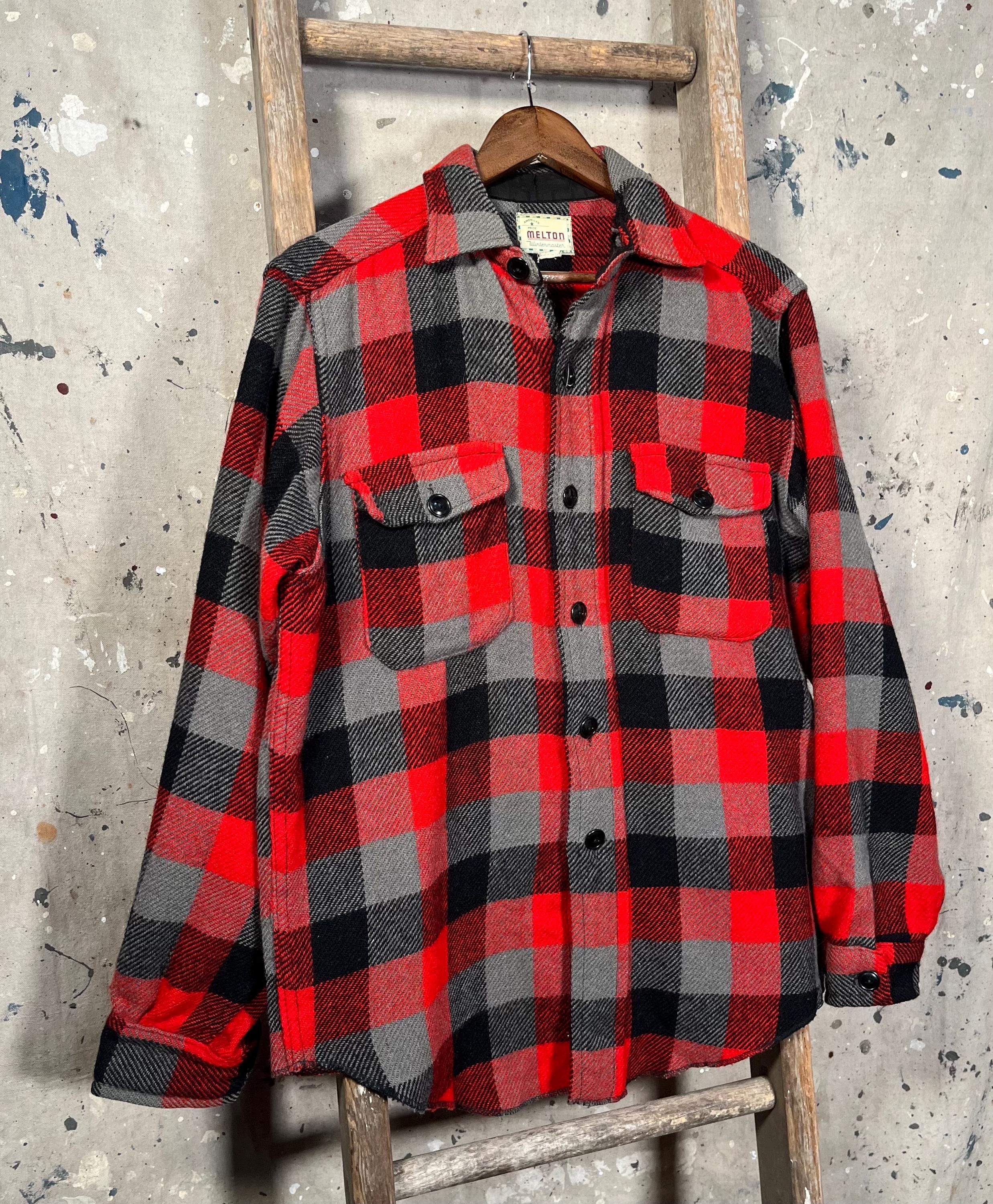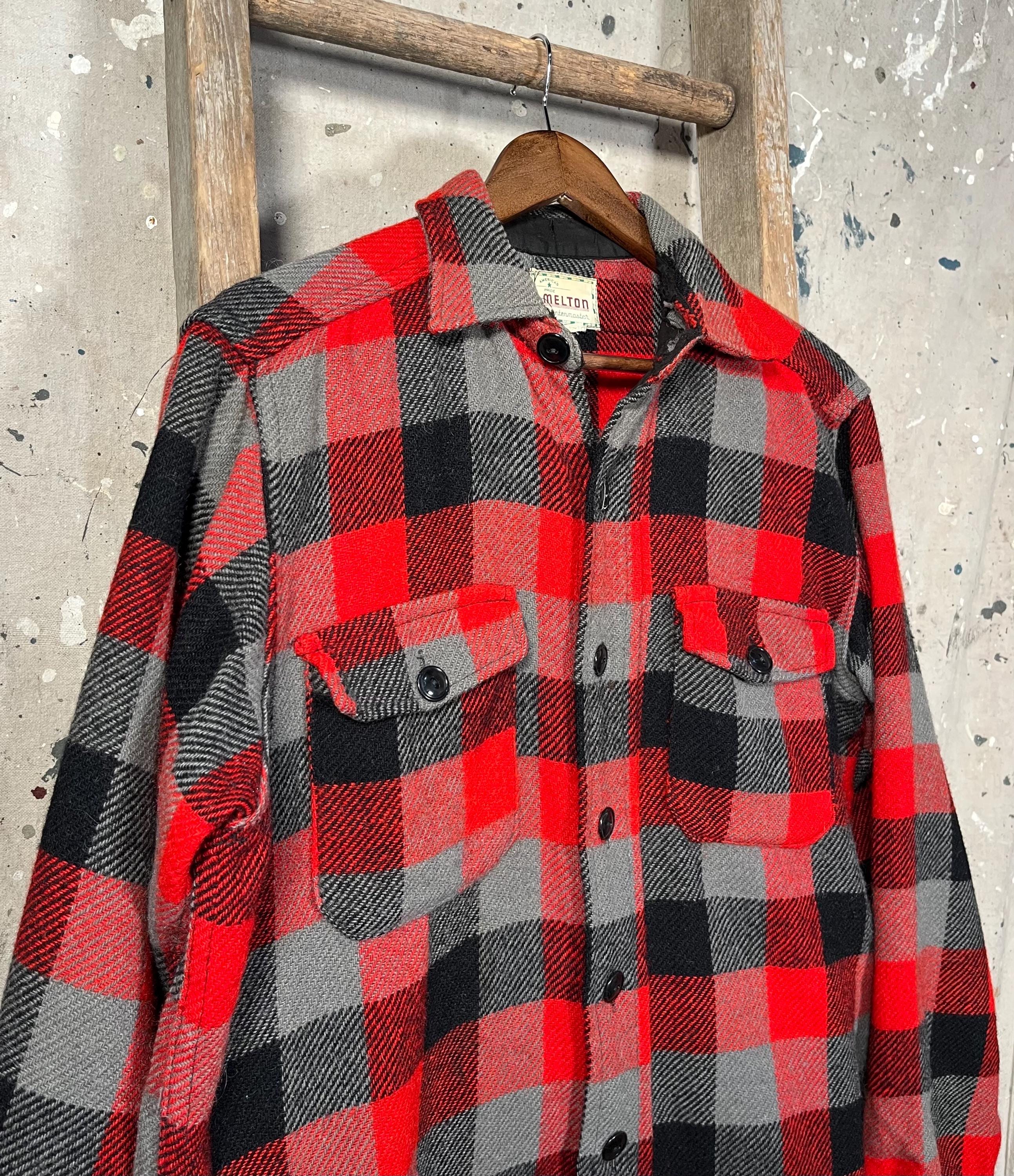 1960s / 70s Melton wool shirt. Heavy wool , black / gray plaid button down. Features two chest pockets . Natural distressing throughout, see photos . Good condition