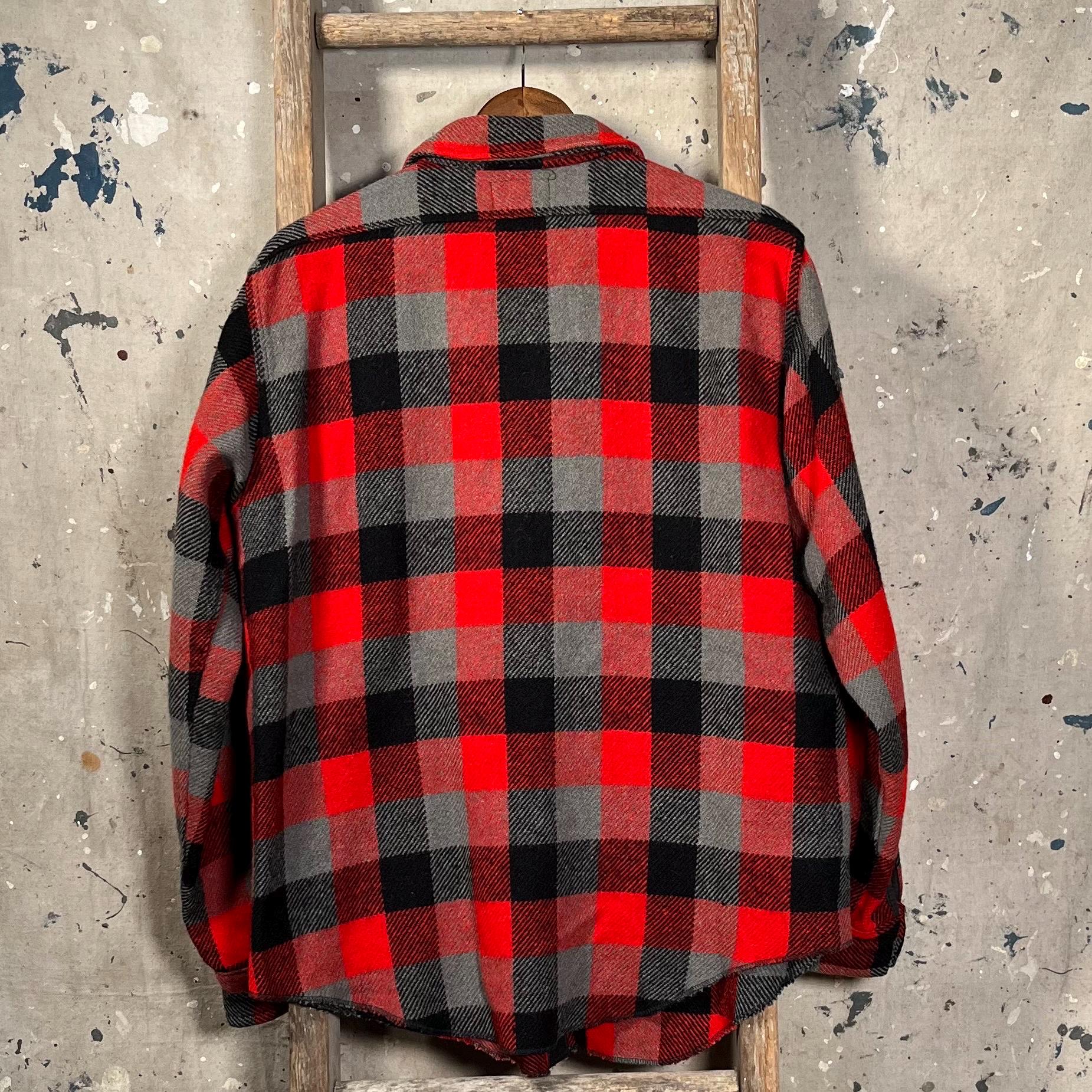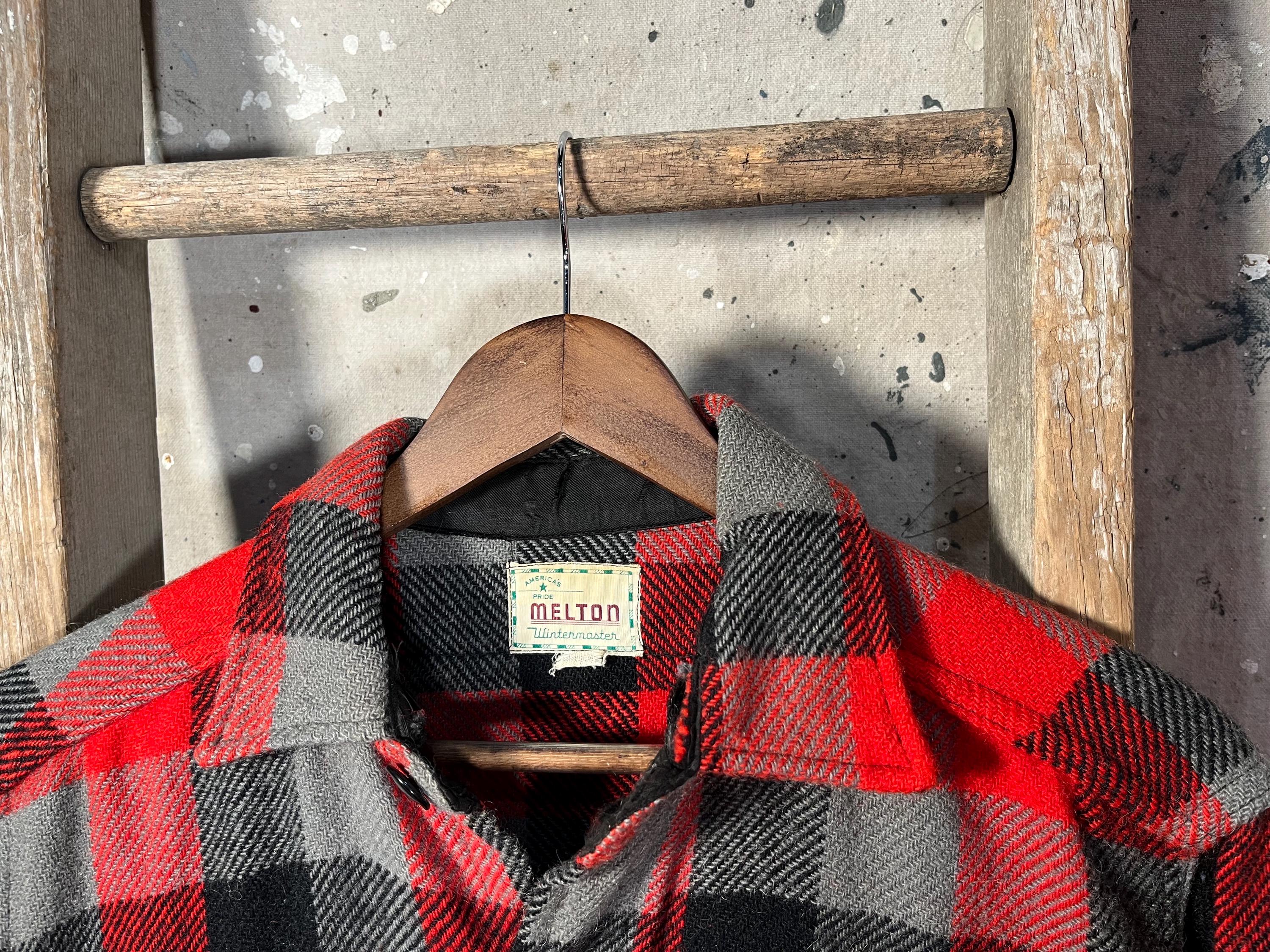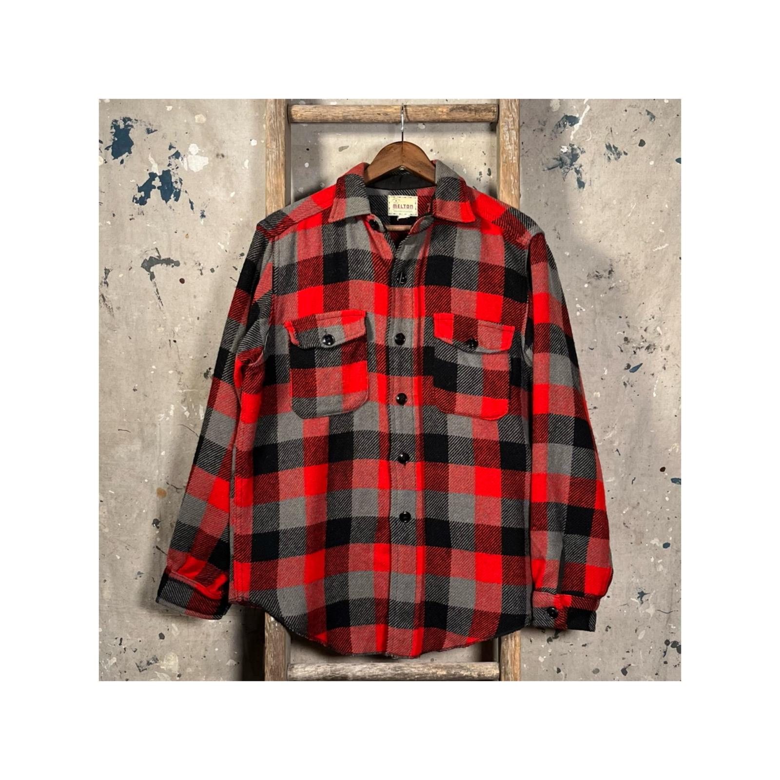 1960s / 70s Melton wool shirt. Heavy wool , black / gray plaid button down. Features two chest pockets . Natural distressing throughout, see photos . Good condition
