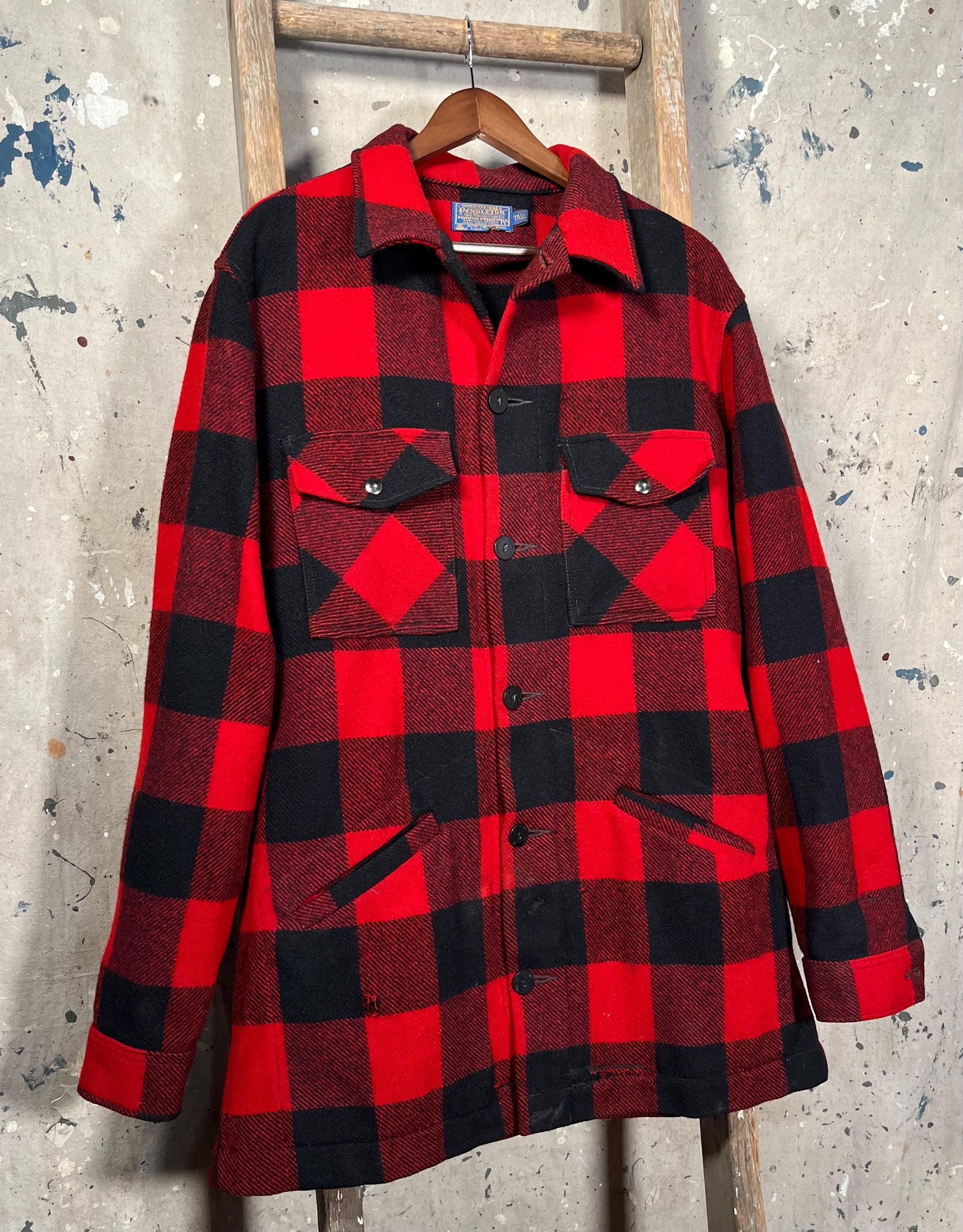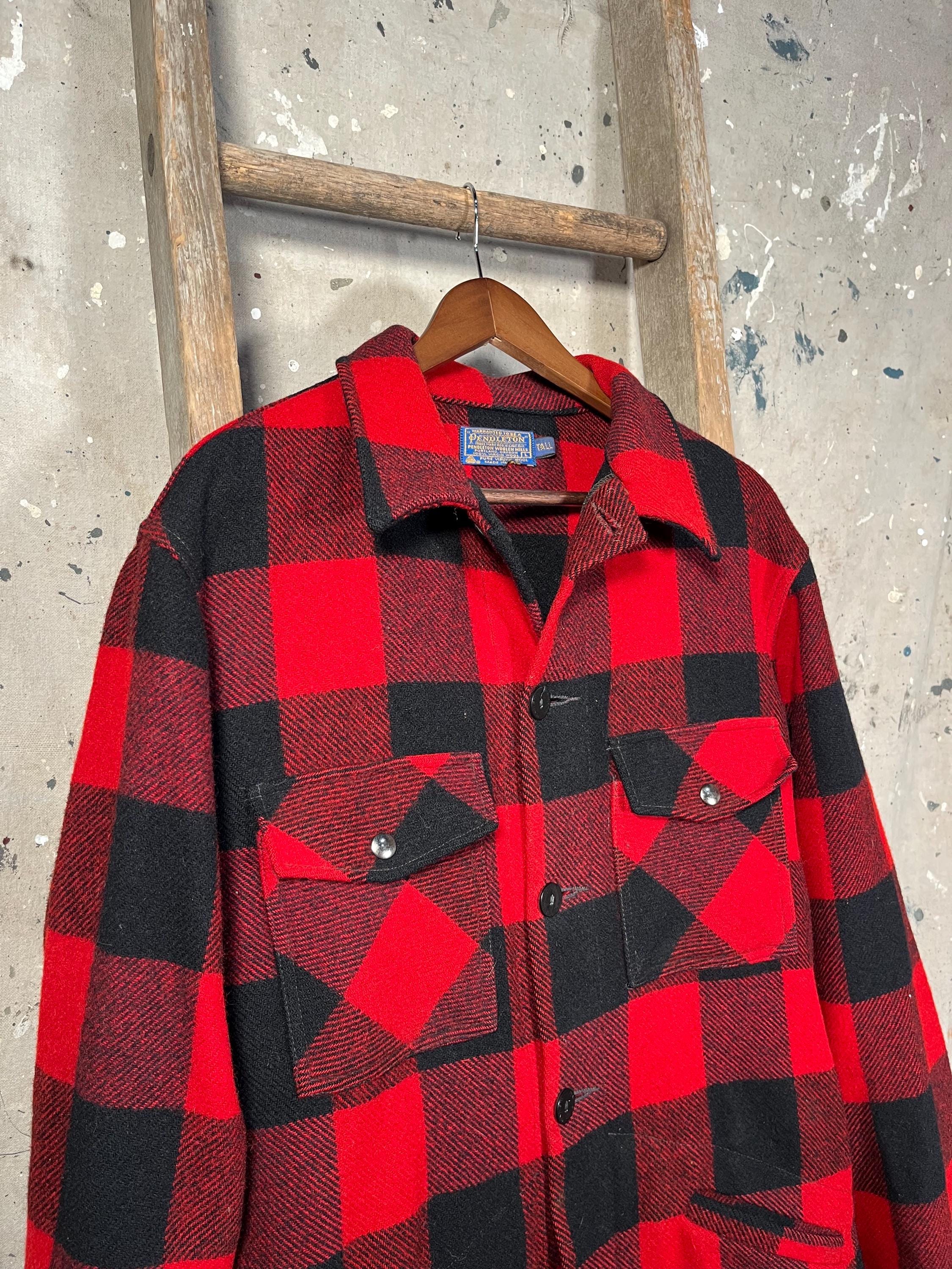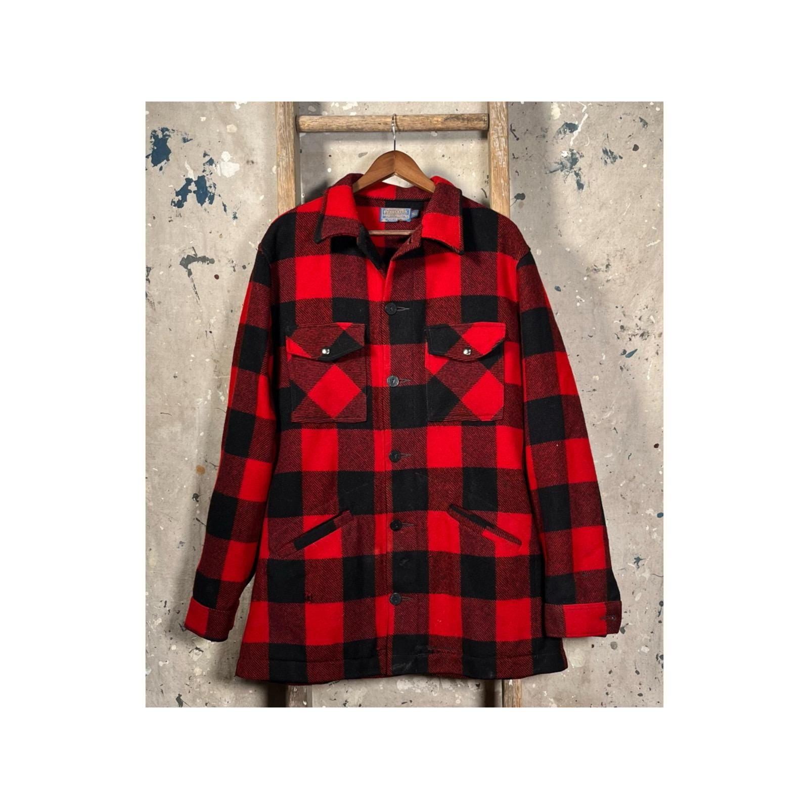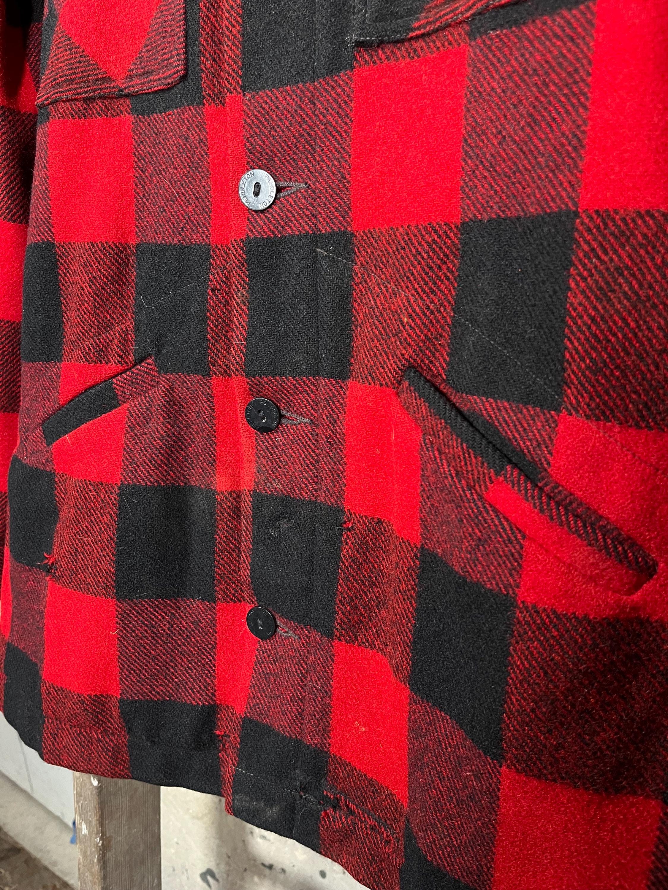 1970s Pendleton Wool shirt jacket. Tough as nails , Timeless Red & Black Buffalo plaid. Heavy wool, full button closure , two chest and hand warmer pockets . Good condition , some natural wear throughout. See Photos.