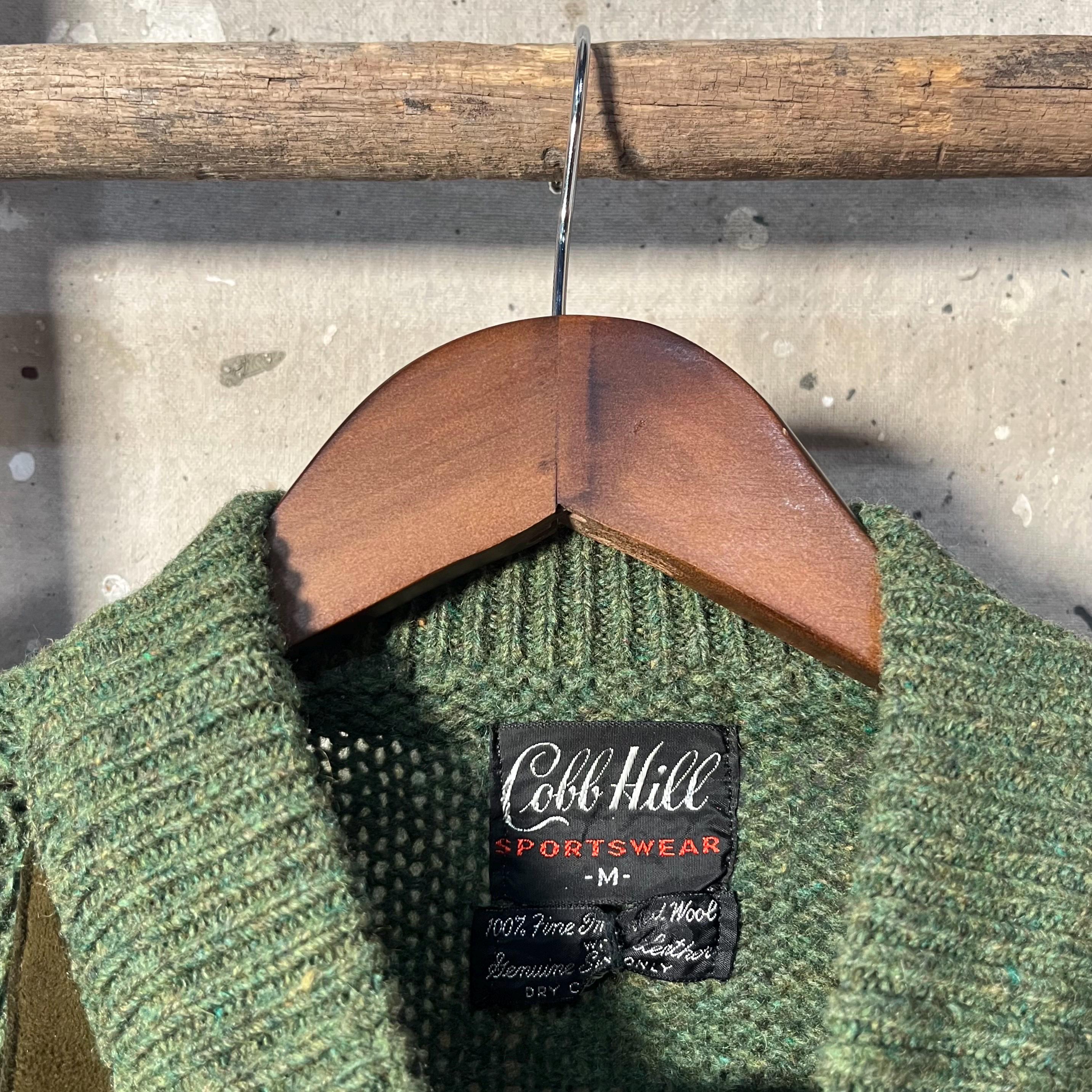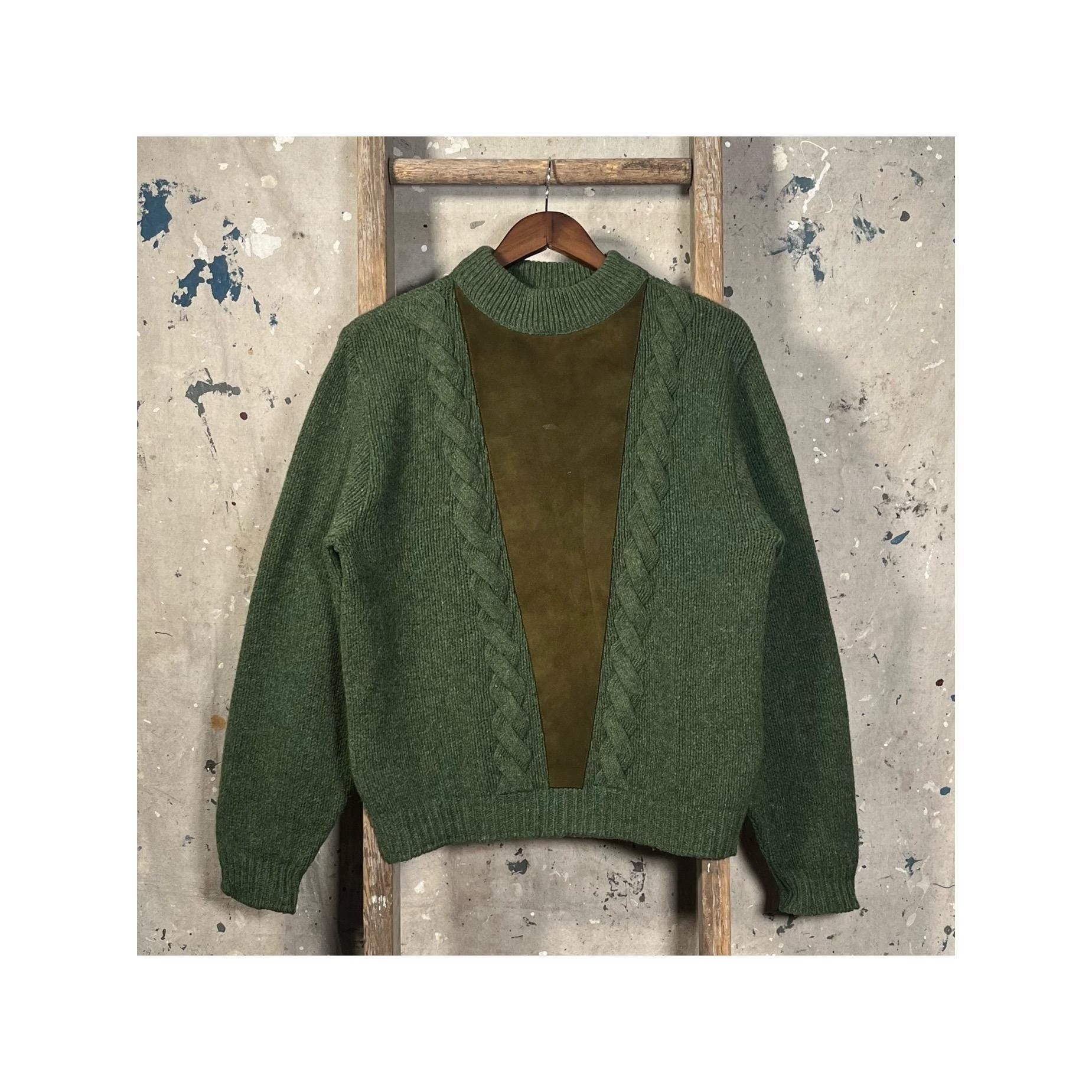 1950s Wool sweater w/ leather panel . All Wool , cableknit around leather . New old stock , never worn condition with natural distressing from storage - see photos.