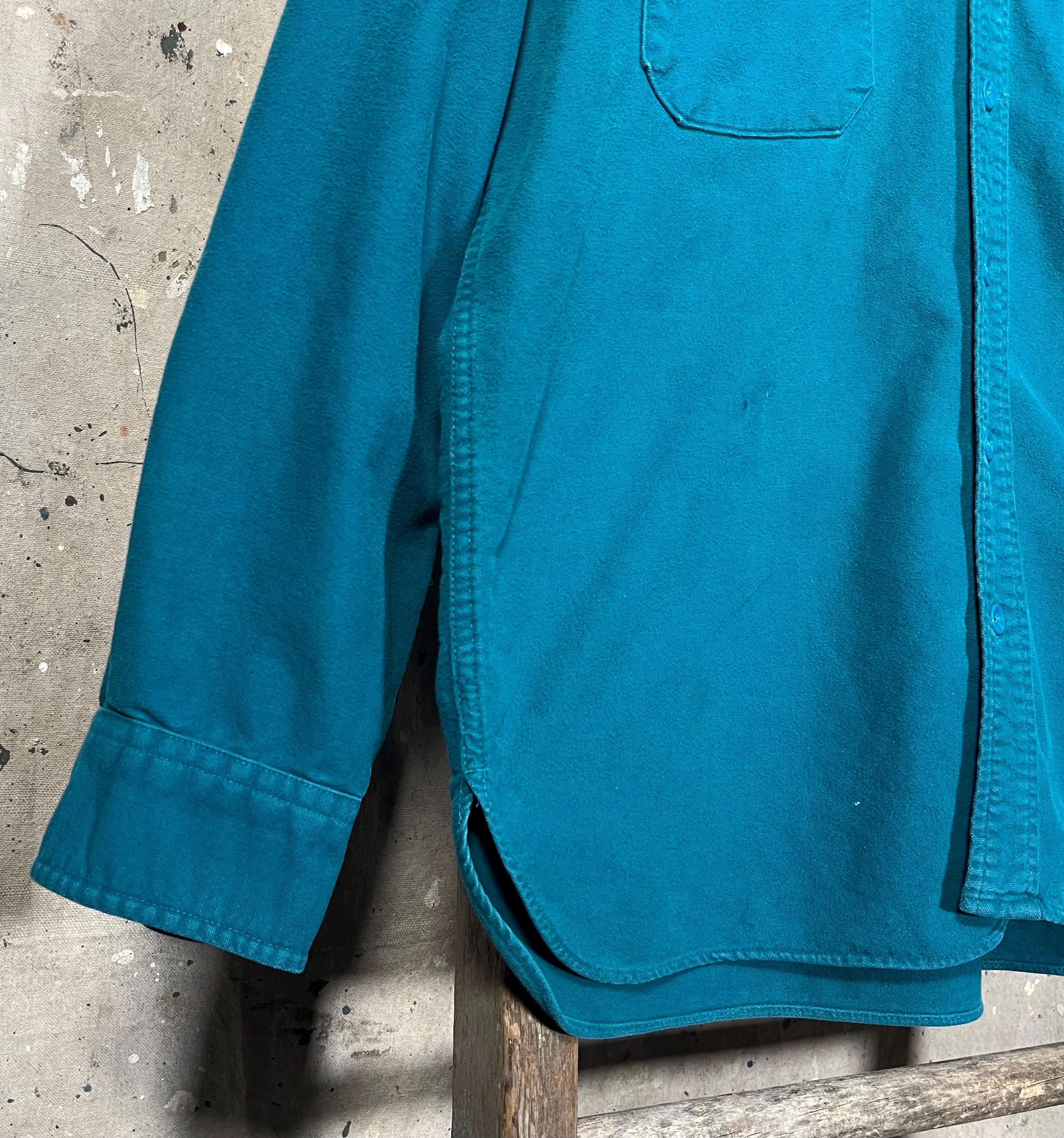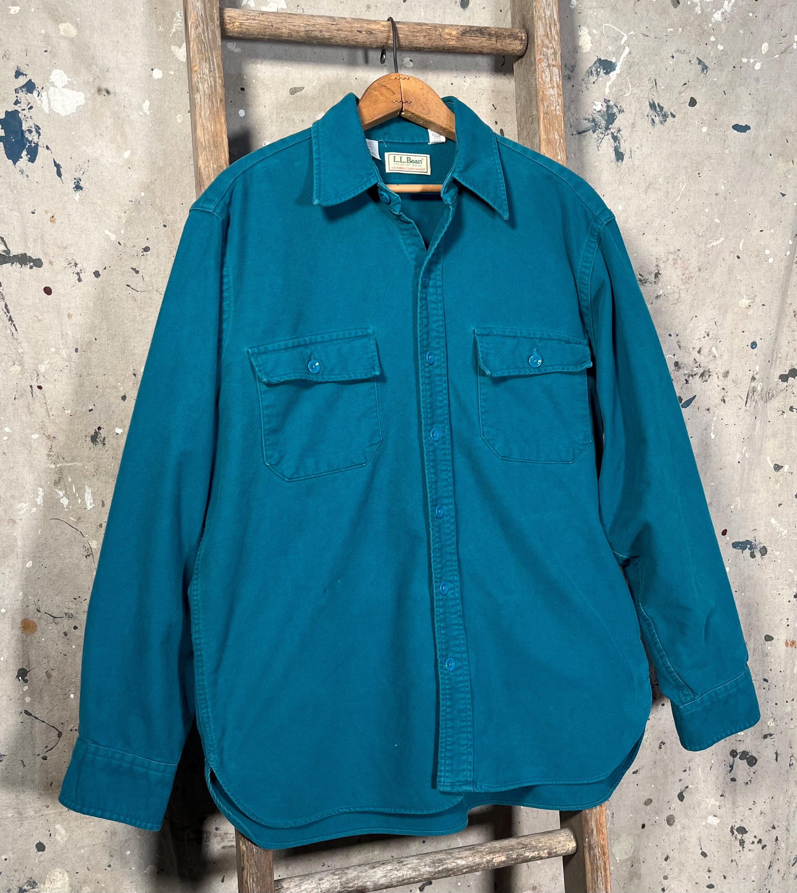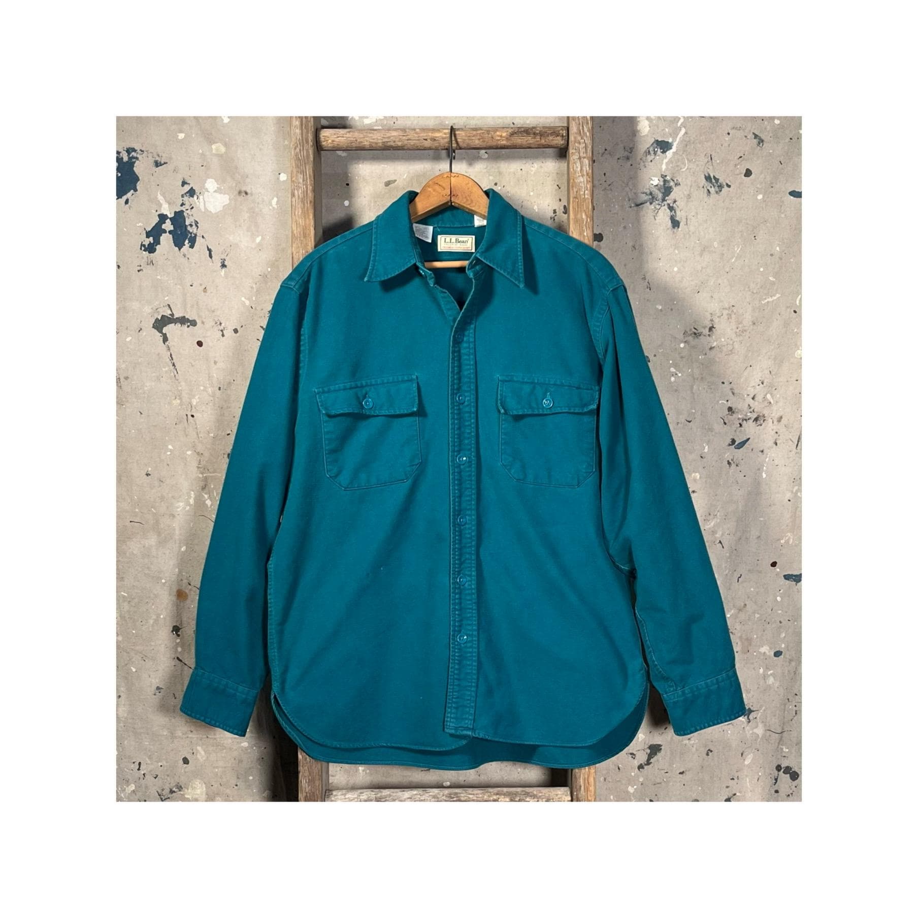 1980s LL Bean Chamois Cloth shirt. Super soft , heavy weight cotton button down. Full button closure , two chest pockets . Great teal color. Good condition , very light natural distressing - see photos .