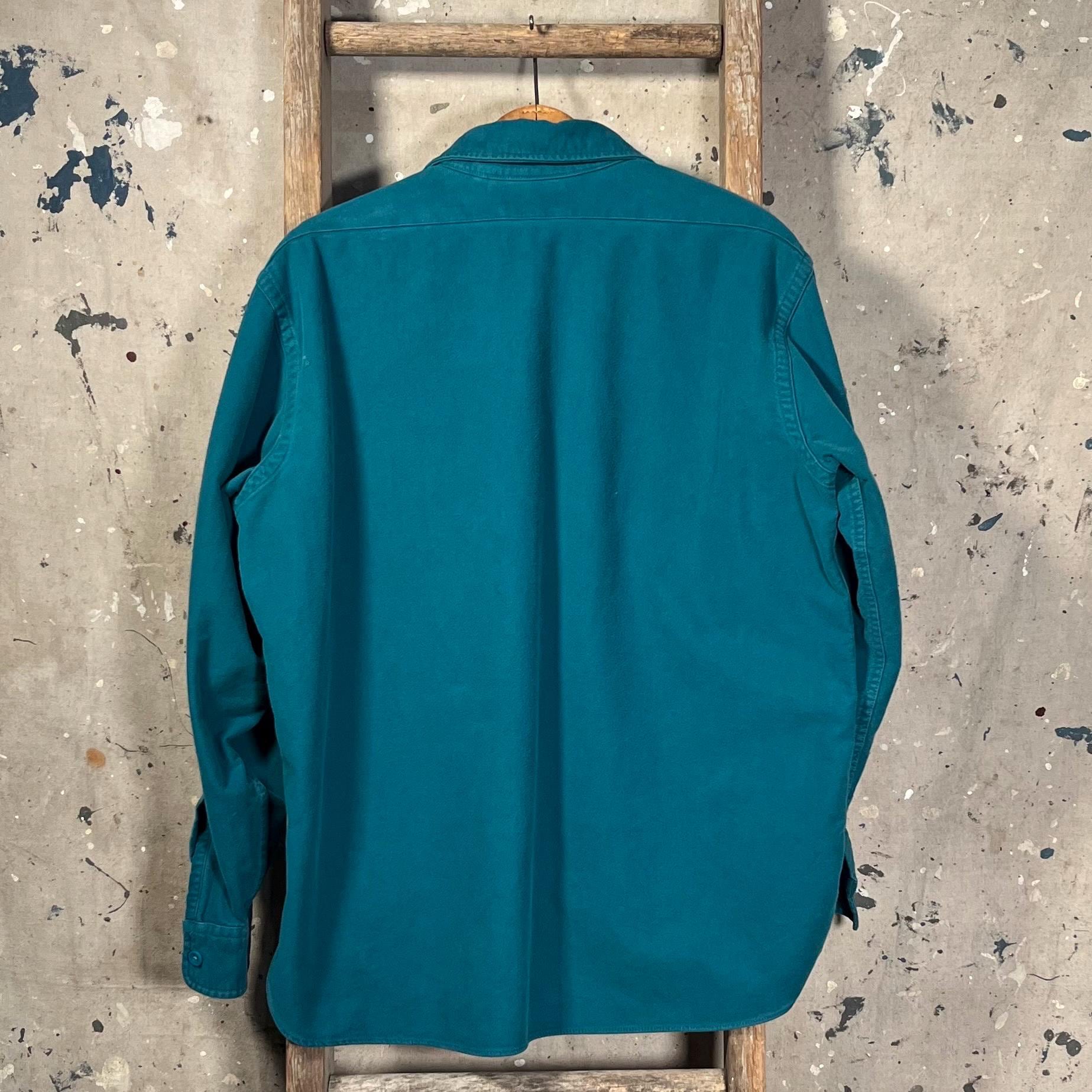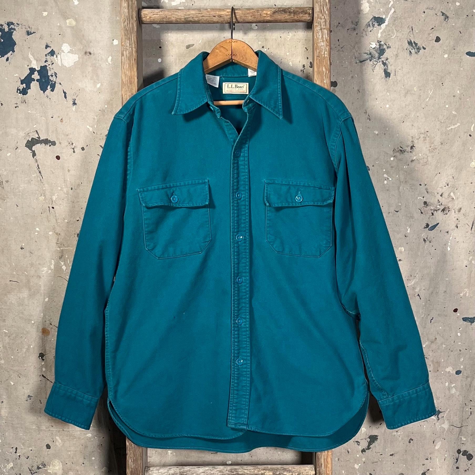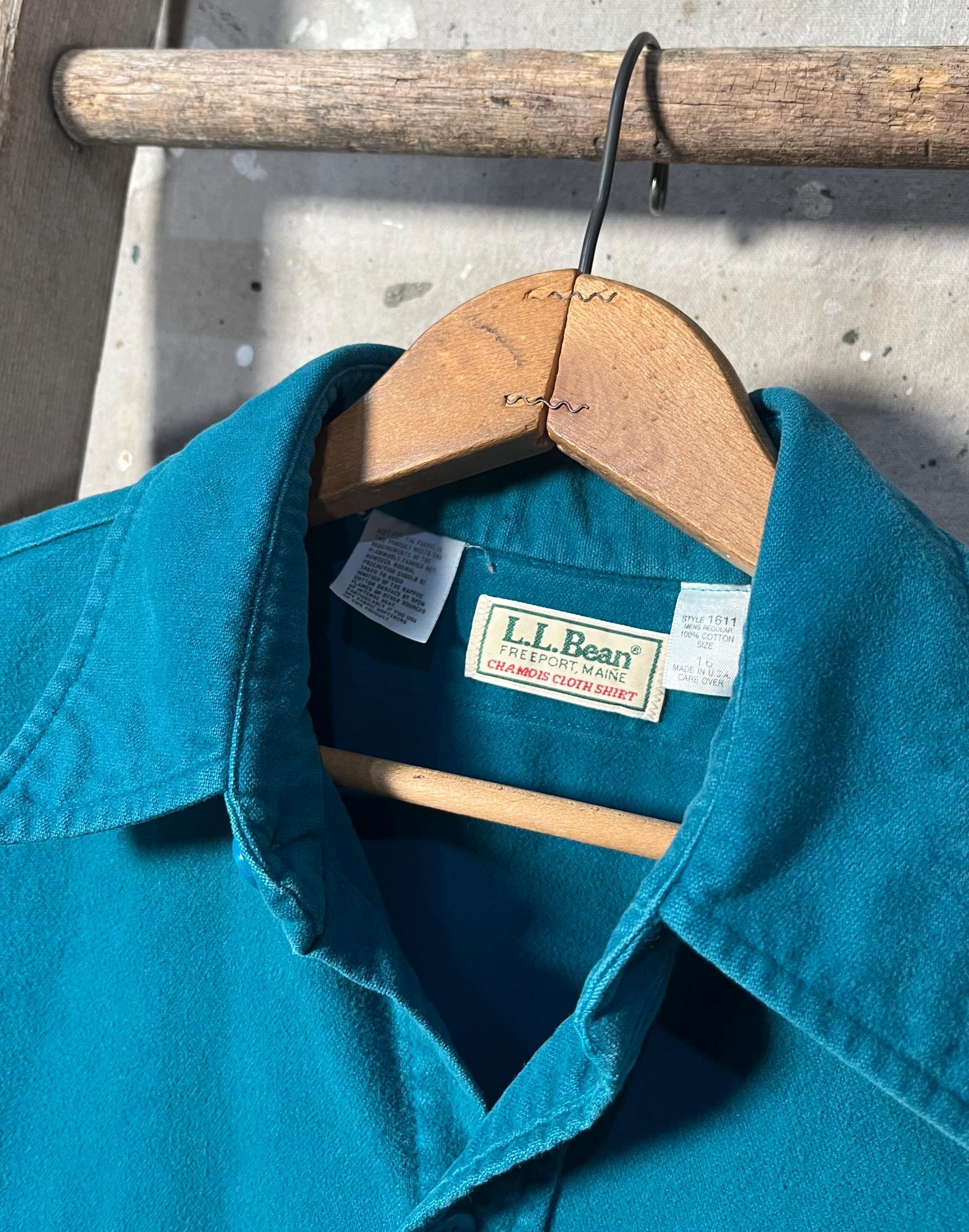 1980s LL Bean Chamois Cloth shirt. Super soft , heavy weight cotton button down. Full button closure , two chest pockets . Great teal color. Good condition , very light natural distressing - see photos .