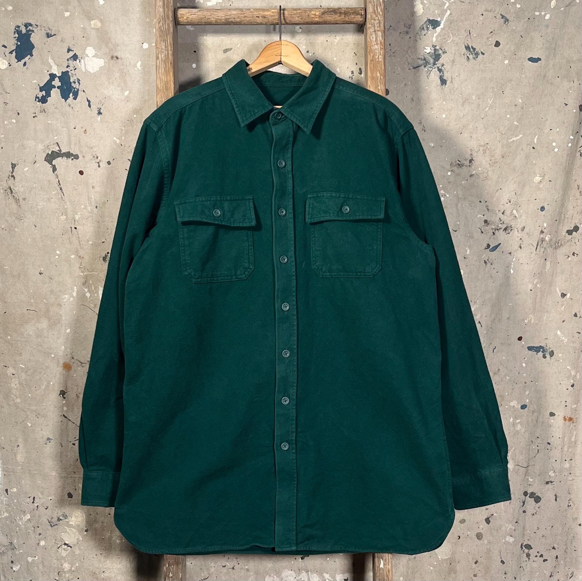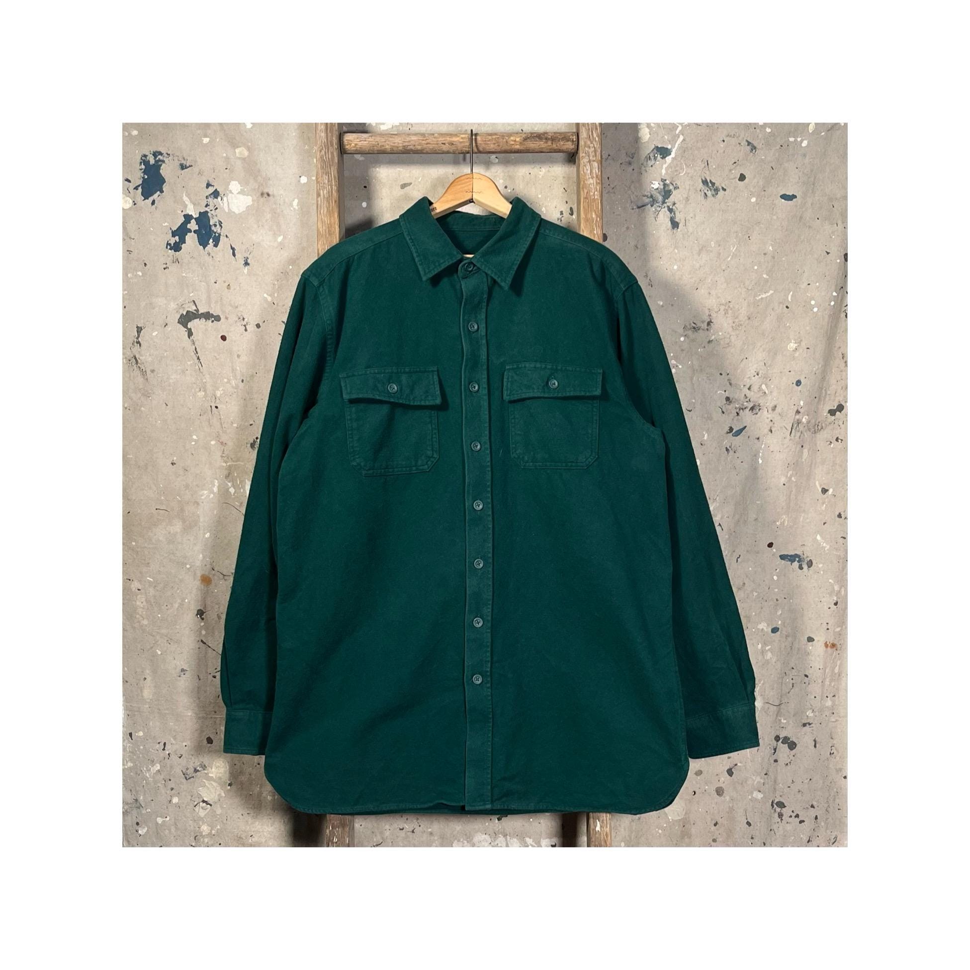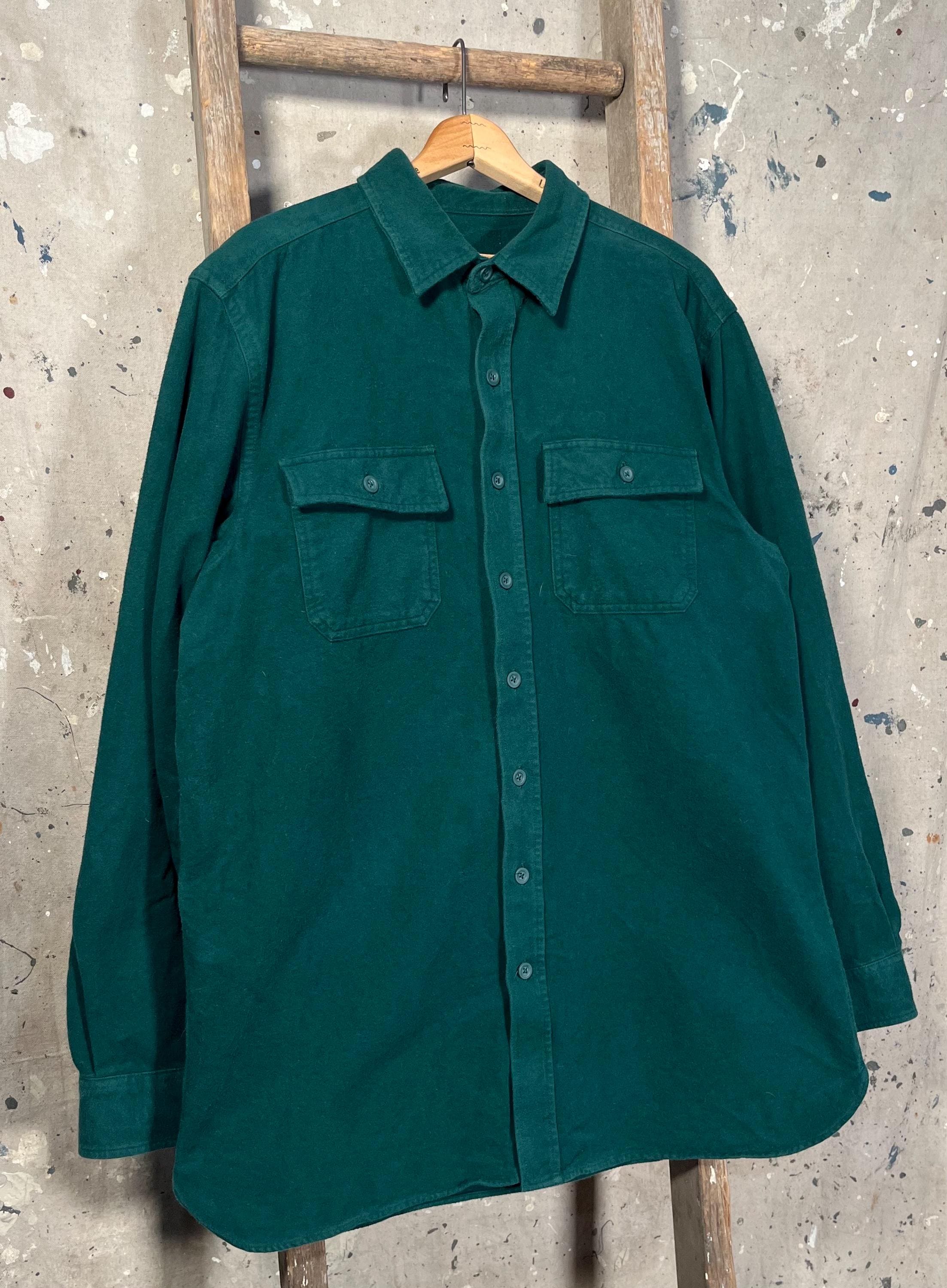 1980s LL Bean chamois shirt. Label has been removed. Super soft , Forest Green heavy weight cotton button down. Full button closure , two chest pockets. Good condition , light natural distressing - see photos .
