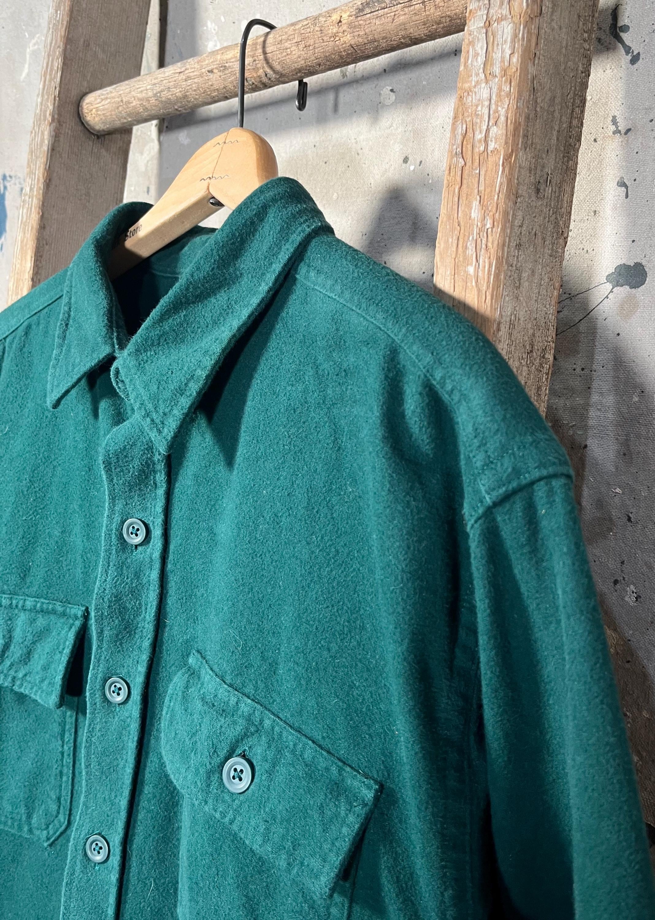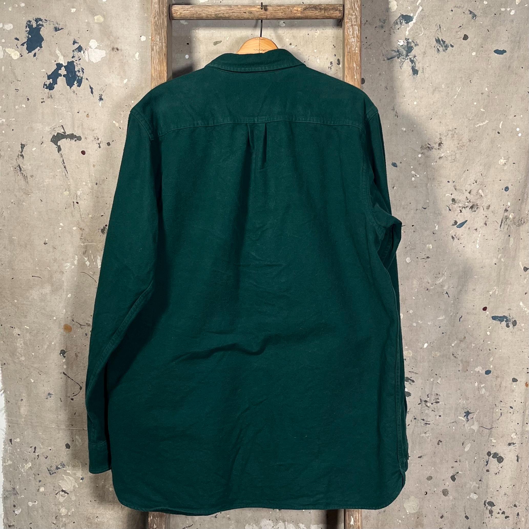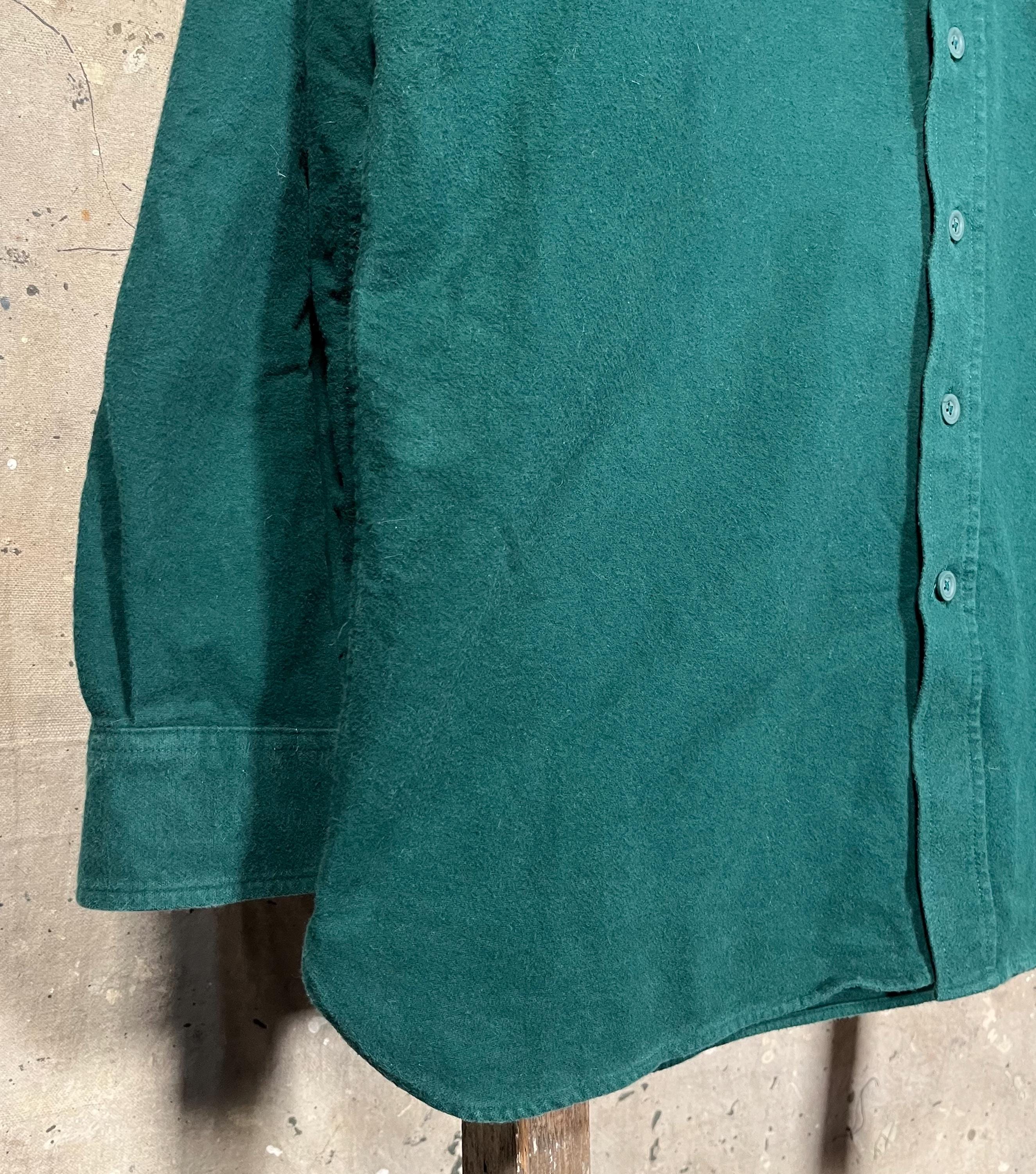 1980s LL Bean chamois shirt. Label has been removed. Super soft , Forest Green heavy weight cotton button down. Full button closure , two chest pockets. Good condition , light natural distressing - see photos .