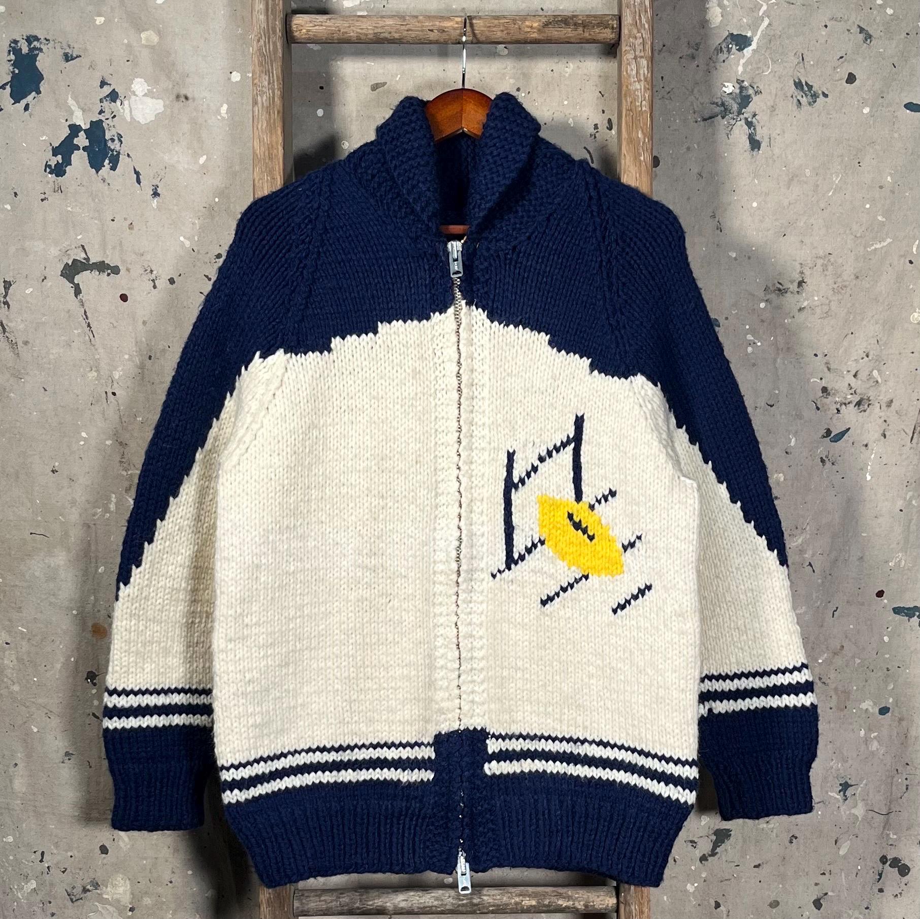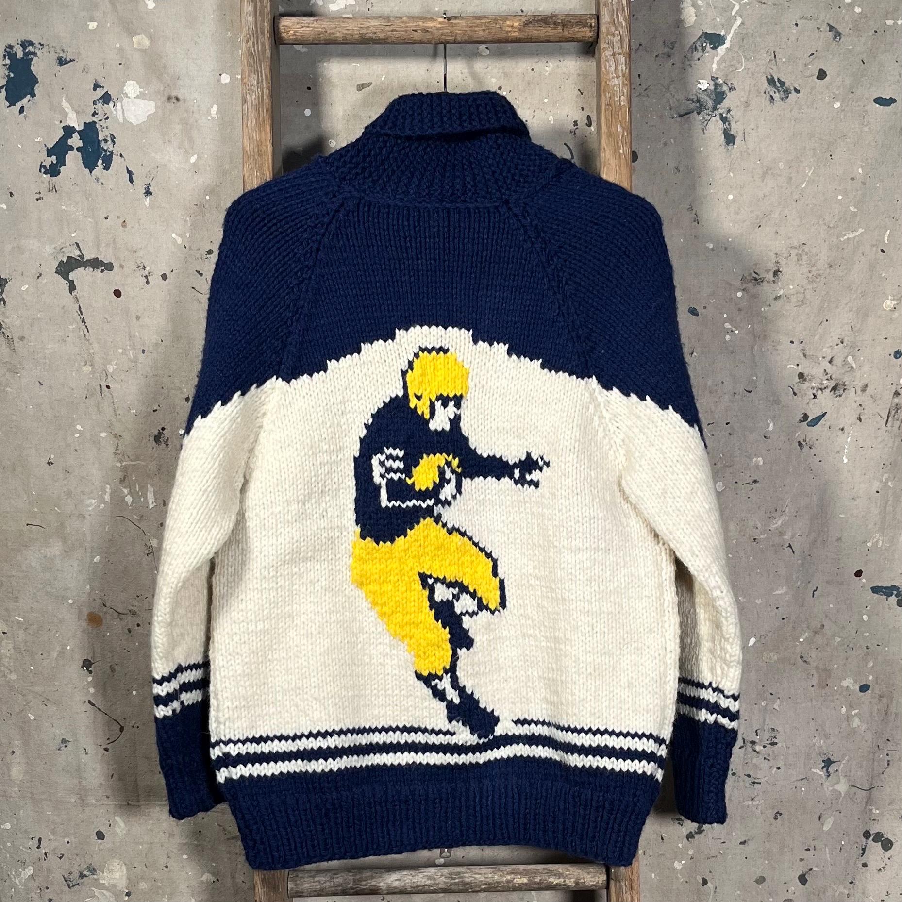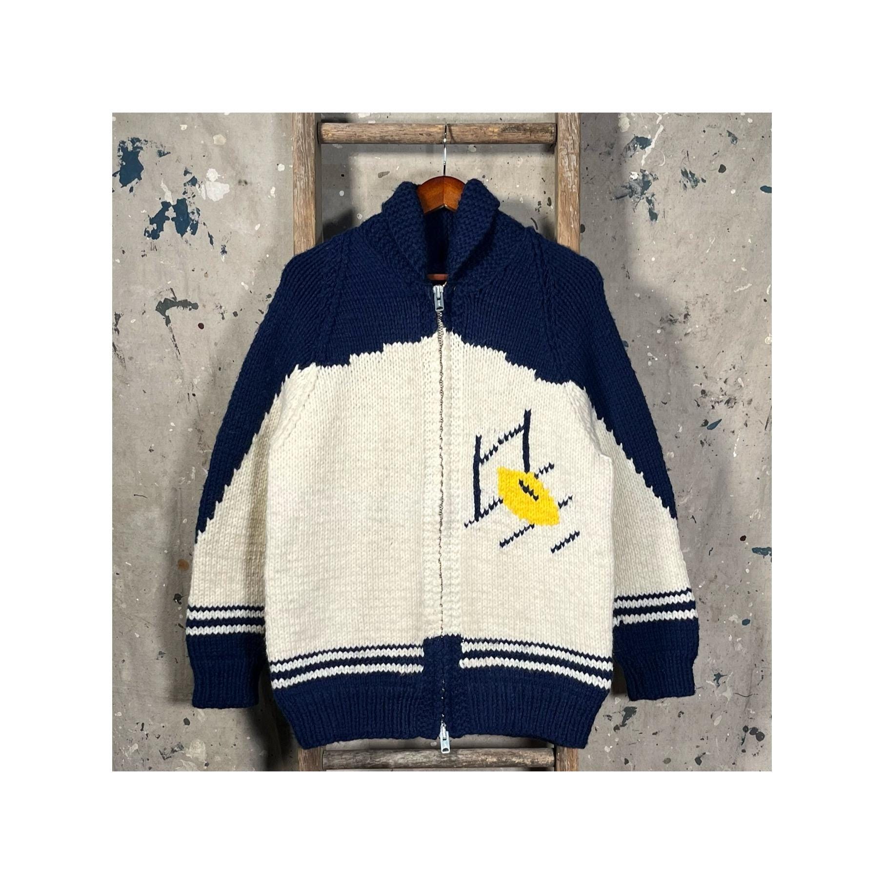 1970s Cowichan Knit Wool Sweater. Hand knit Football Pattern in Blue , Yellow & White. Full zip closure. Good vintage condition , natural distressing - see photos.