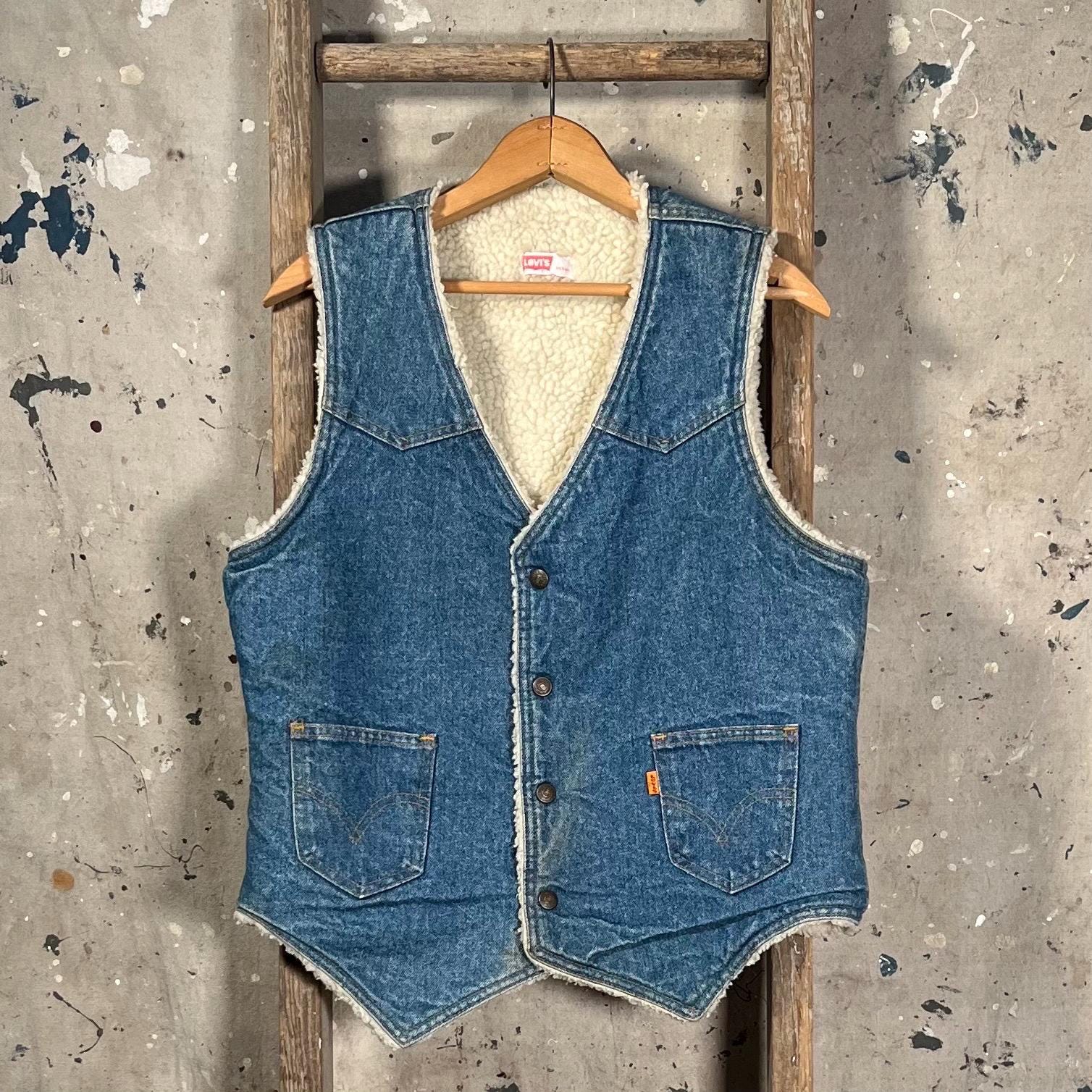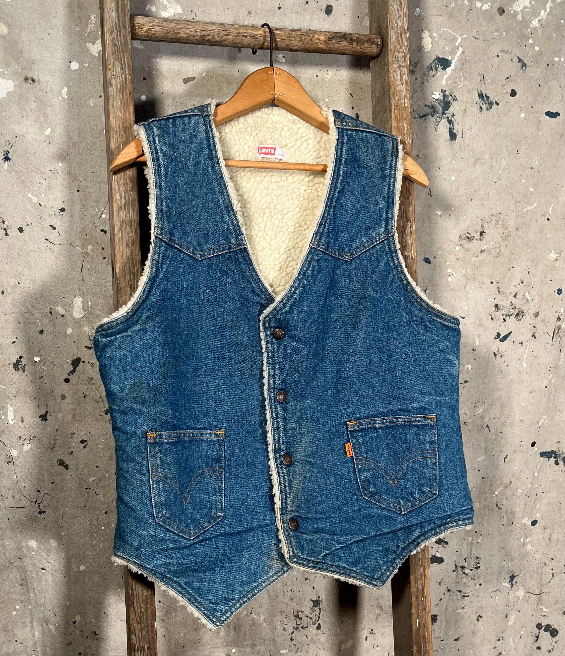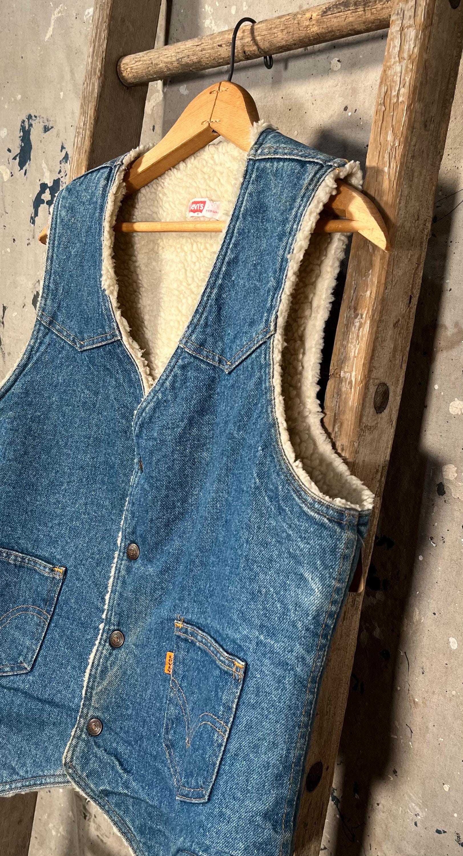 1970s Levi's denim vest. Features sherpa lining & 2 lower pockets w/ Orange Tab. Medium wash denim , perfectly worn in. Great vintage condition , natural distressing throughout - see photos