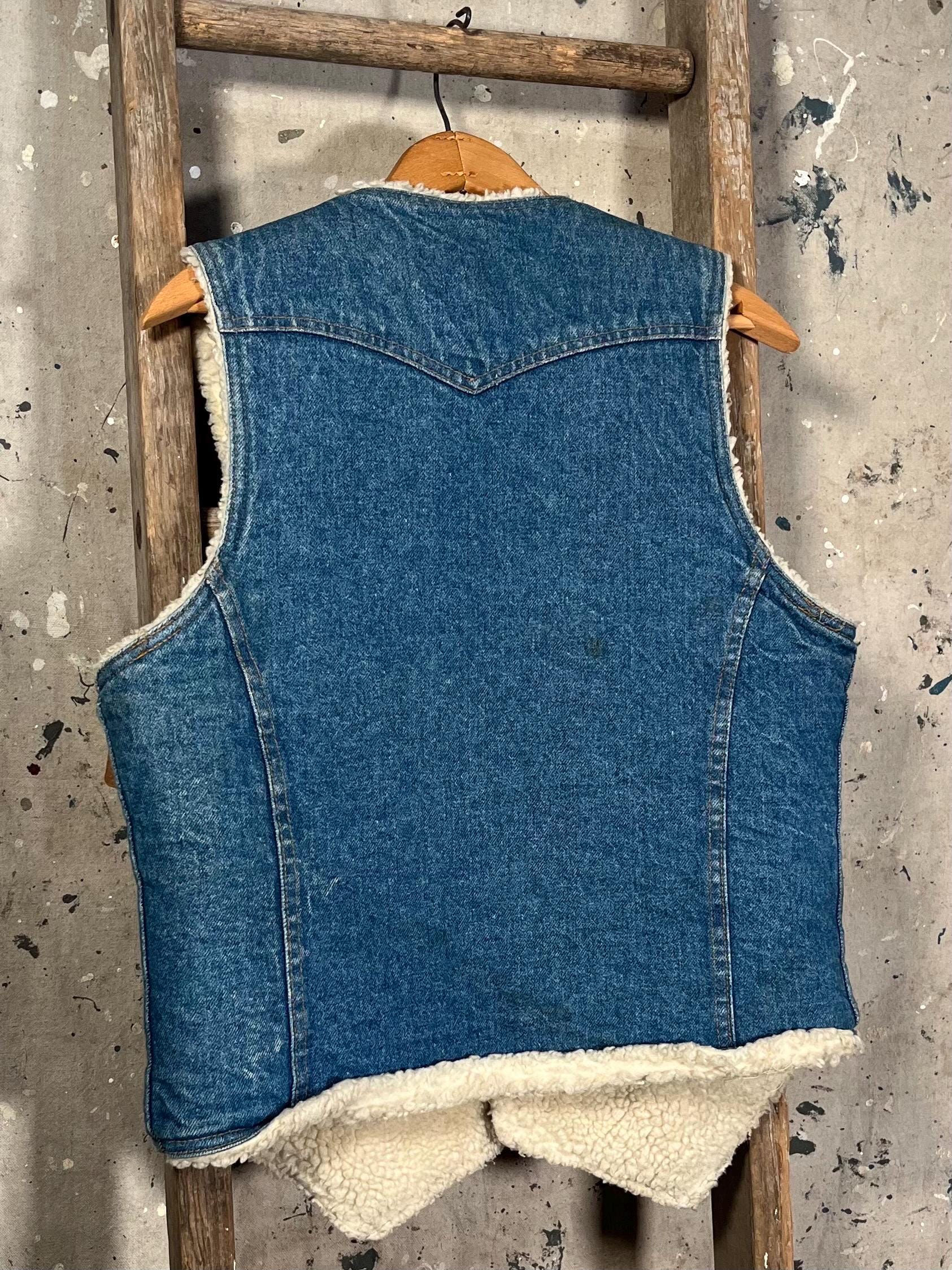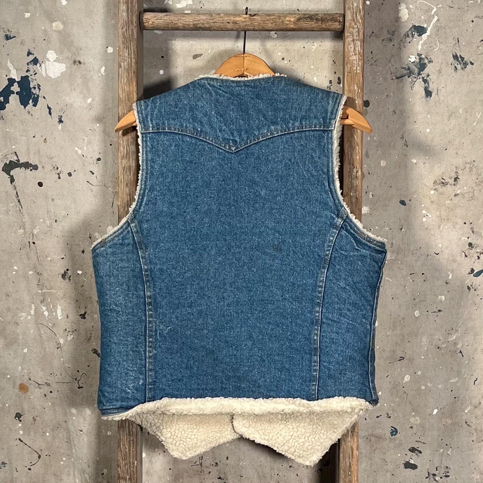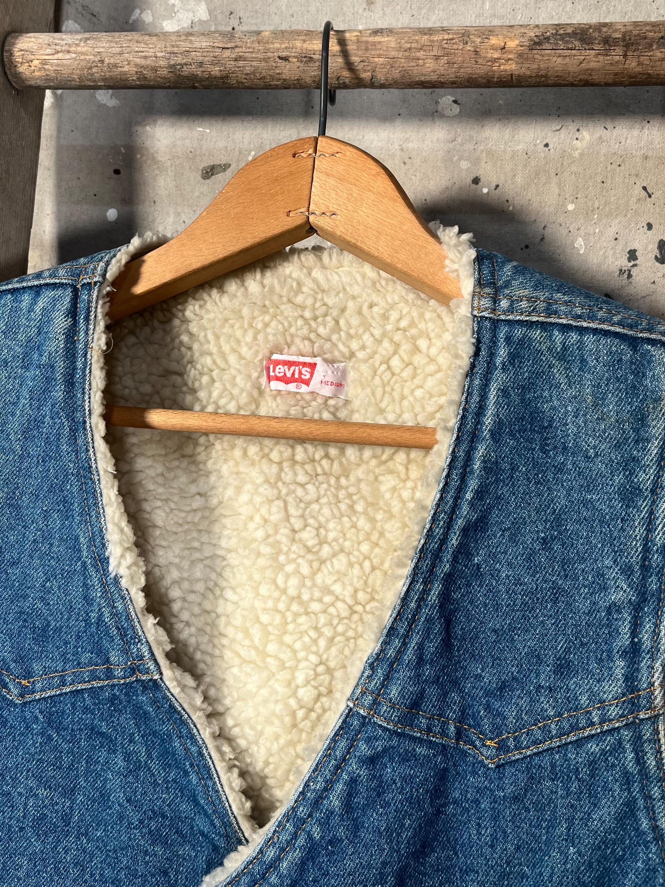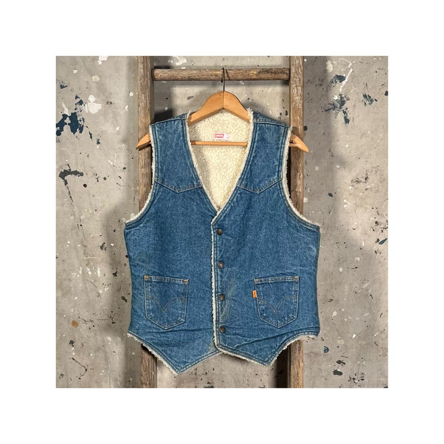 1970s Levi's denim vest. Features sherpa lining & 2 lower pockets w/ Orange Tab. Medium wash denim , perfectly worn in. Great vintage condition , natural distressing throughout - see photos