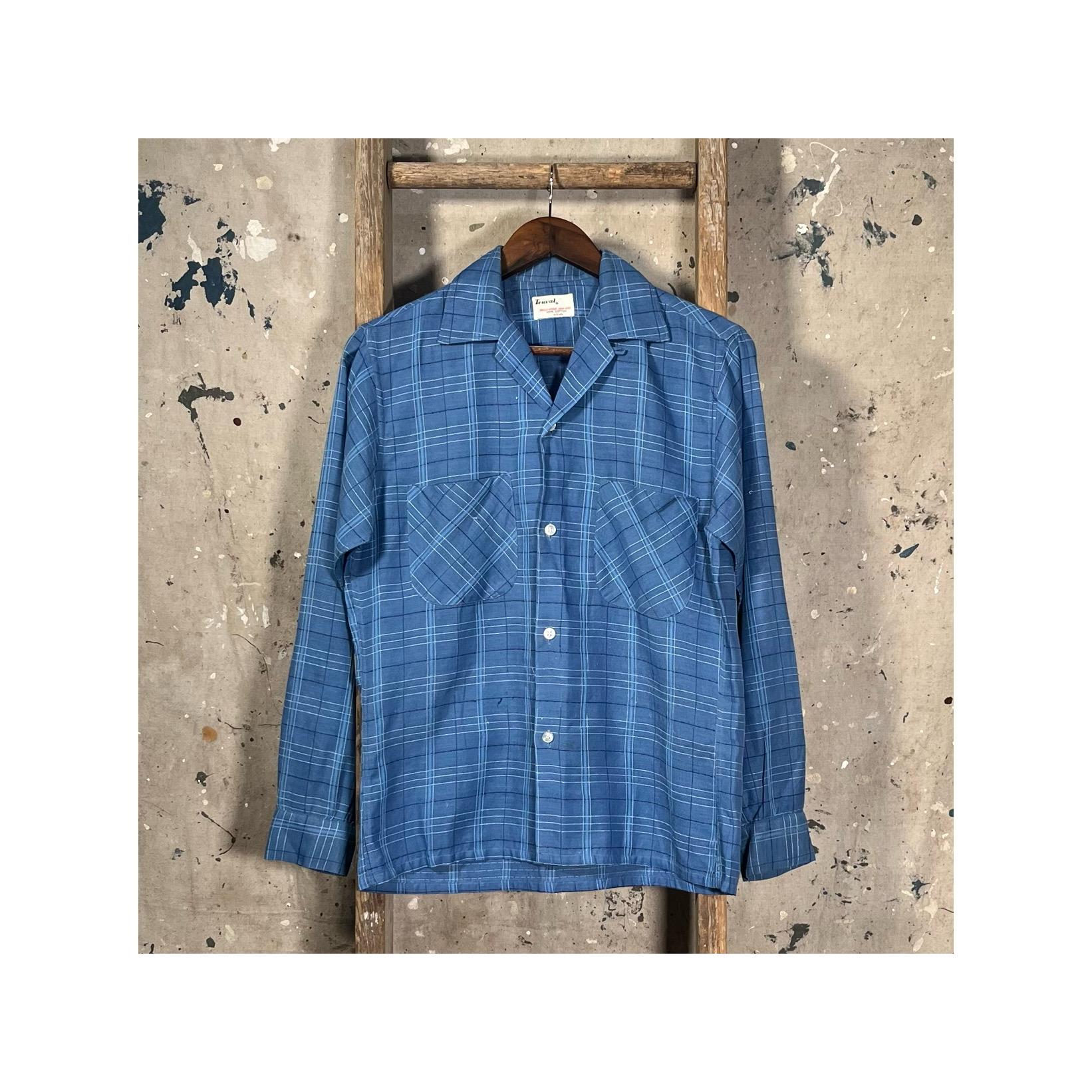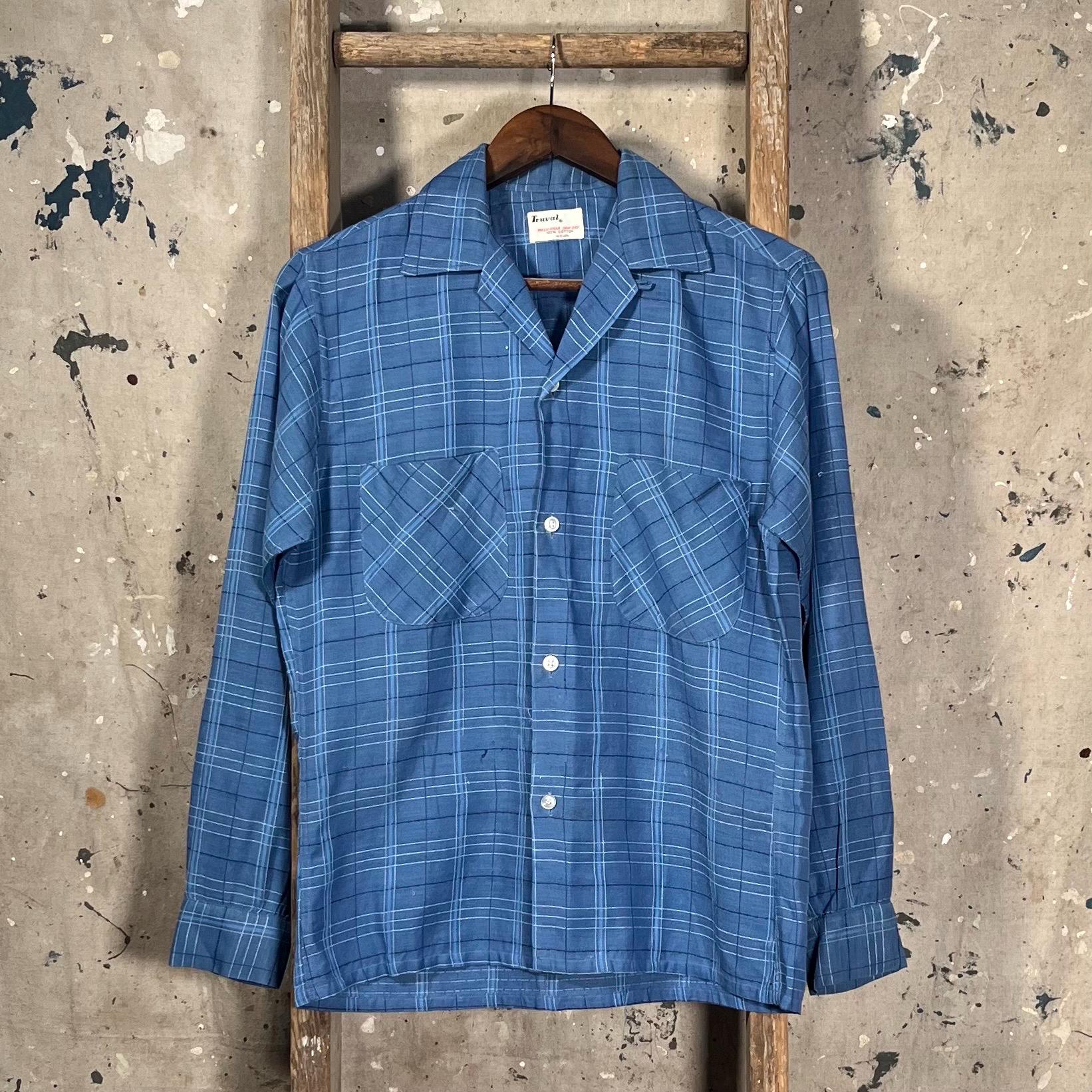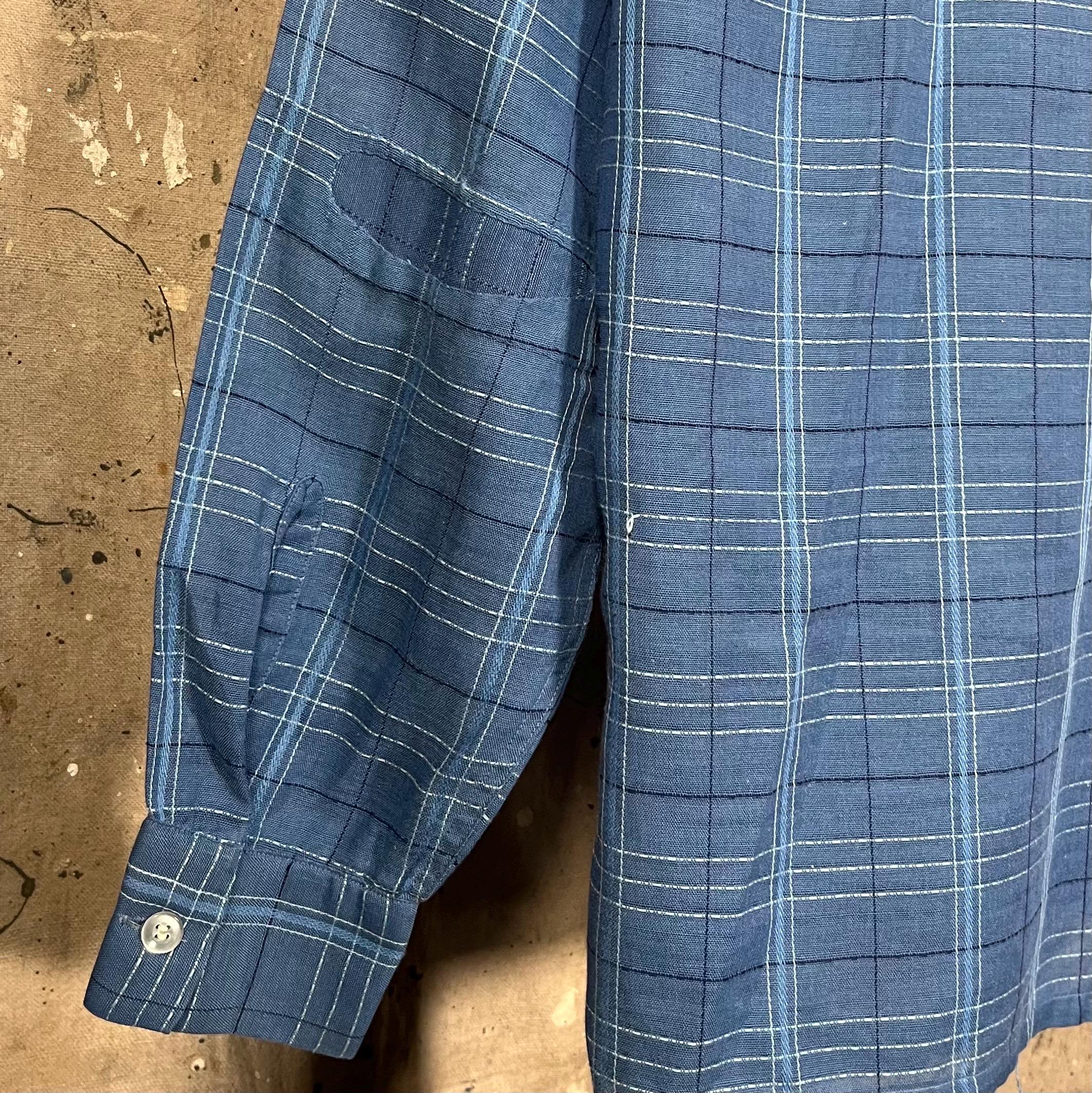 1950s All Cotton loop collar shirt by Truval. Blue shirt with w unique textured plaid pattern. Well done , original repairs at elbow, almost unnoticeable. Natural distressing throughout with a couple pulls. No holes or discoloration , great vintage condition - see photos.