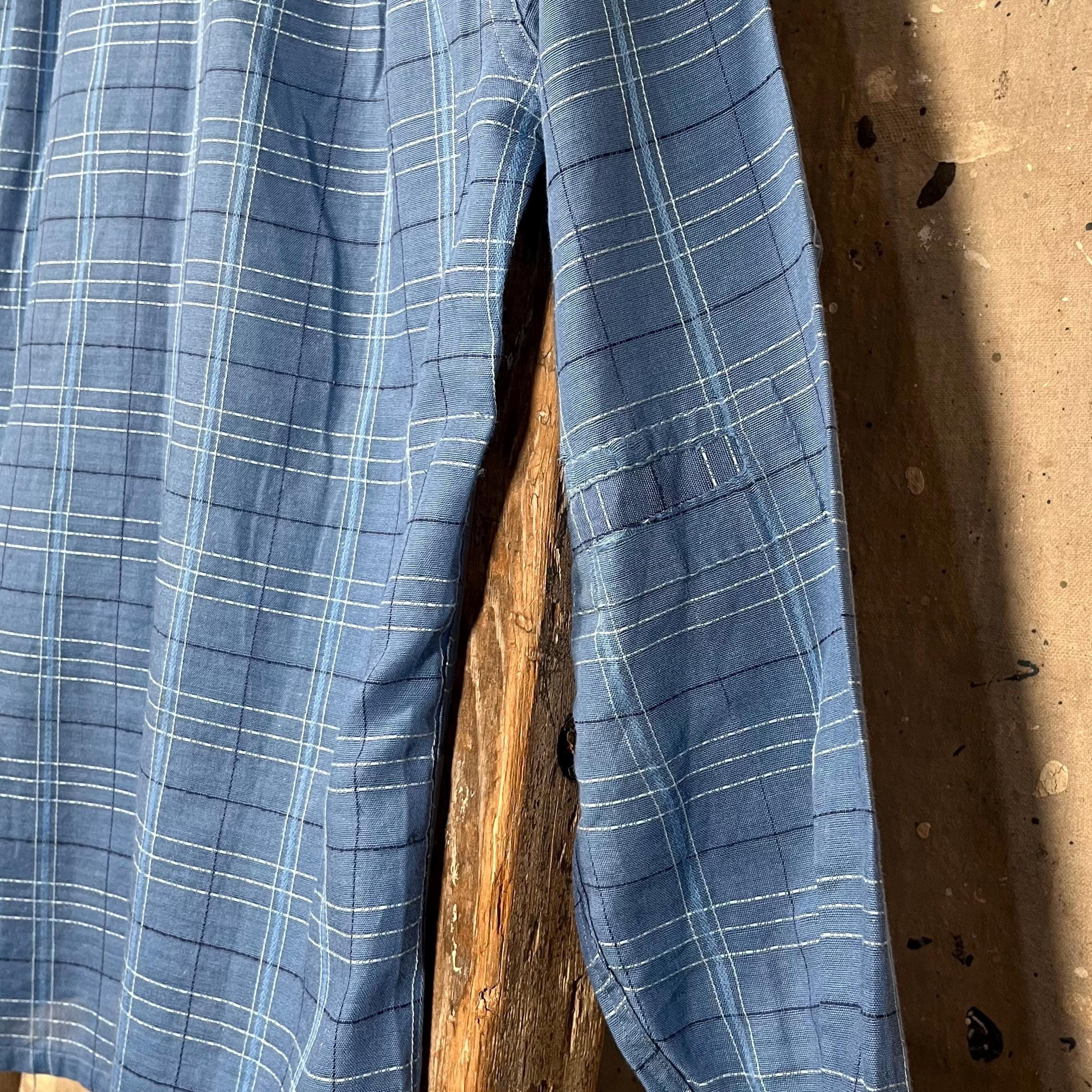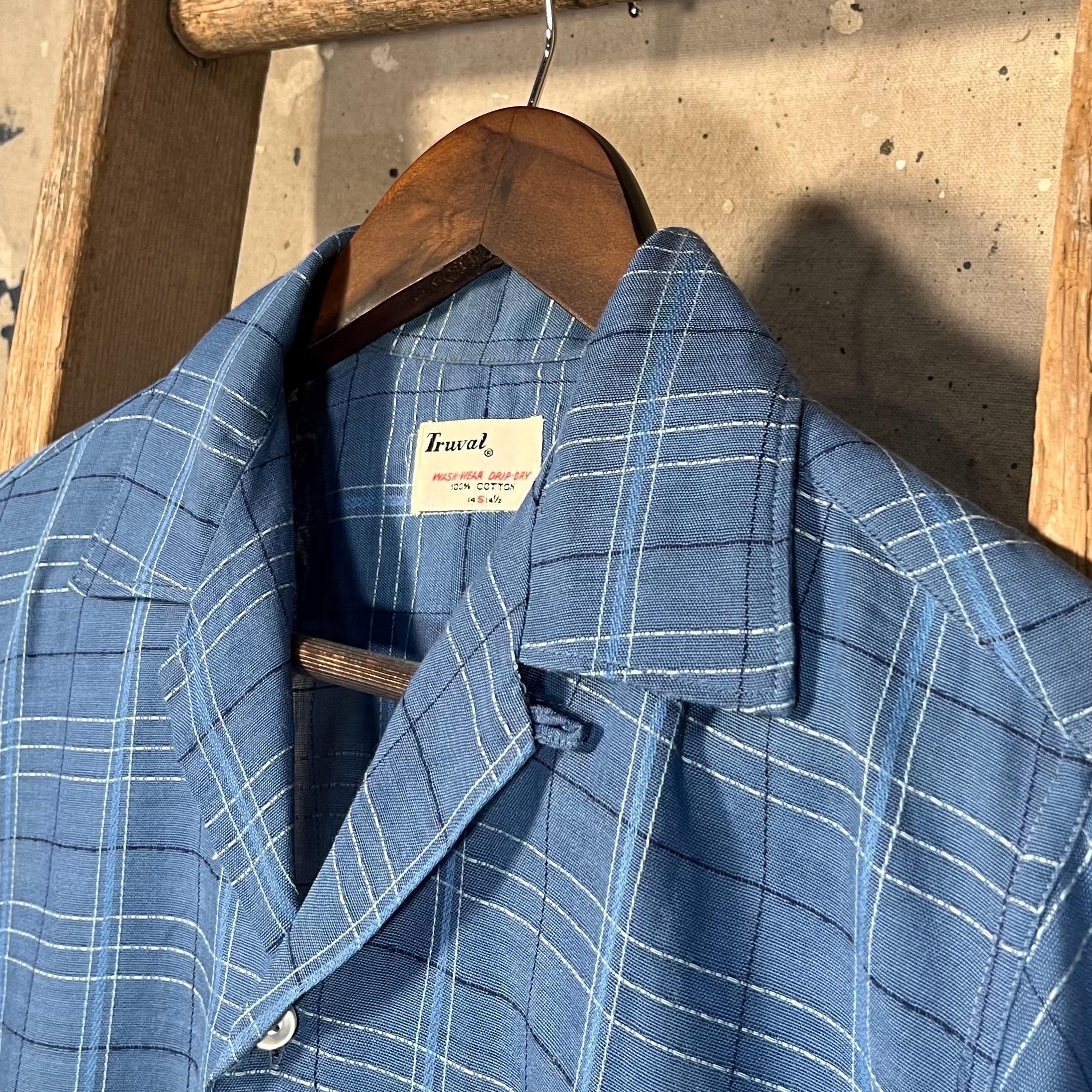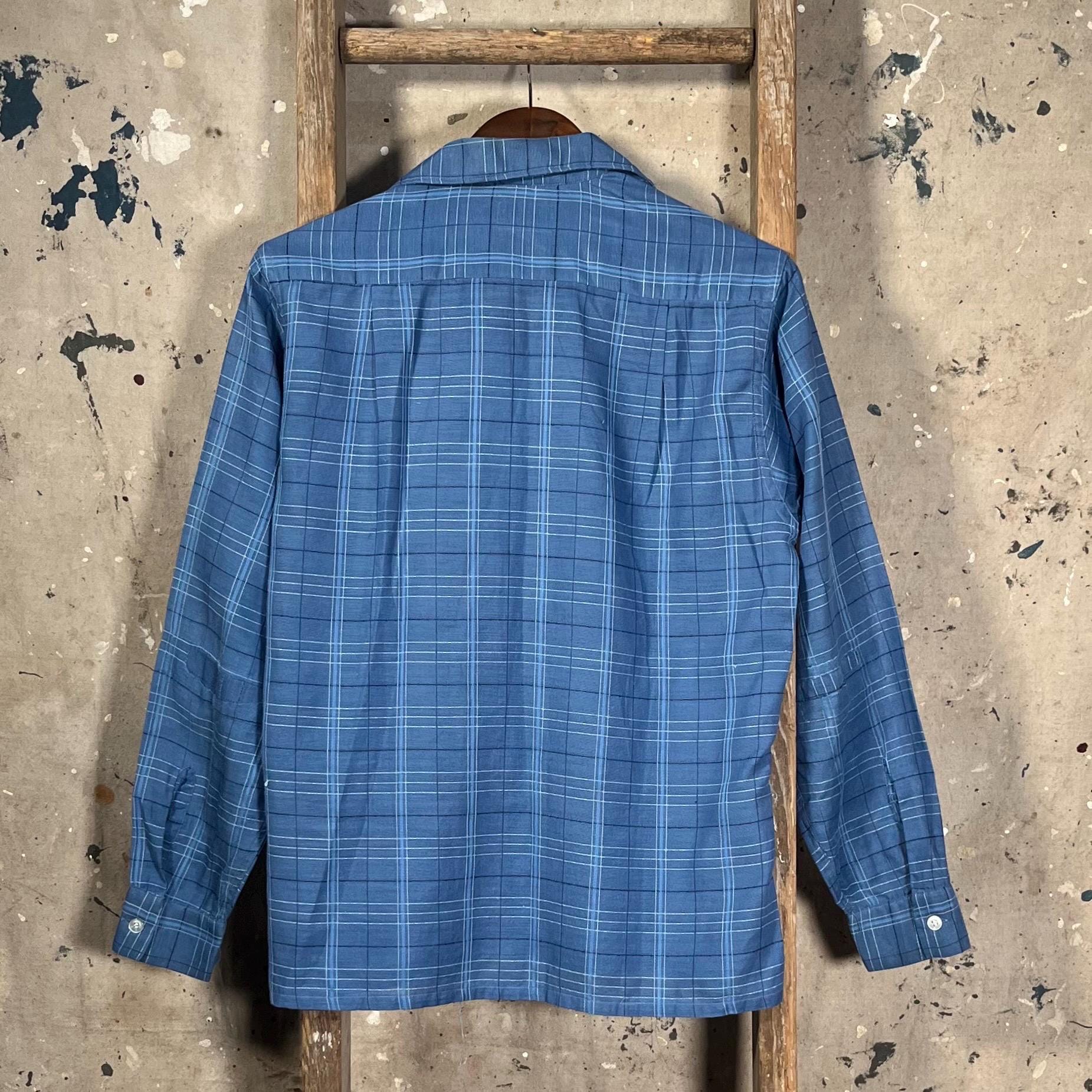 1950s All Cotton loop collar shirt by Truval. Blue shirt with w unique textured plaid pattern. Well done , original repairs at elbow, almost unnoticeable. Natural distressing throughout with a couple pulls. No holes or discoloration , great vintage condition - see photos.
