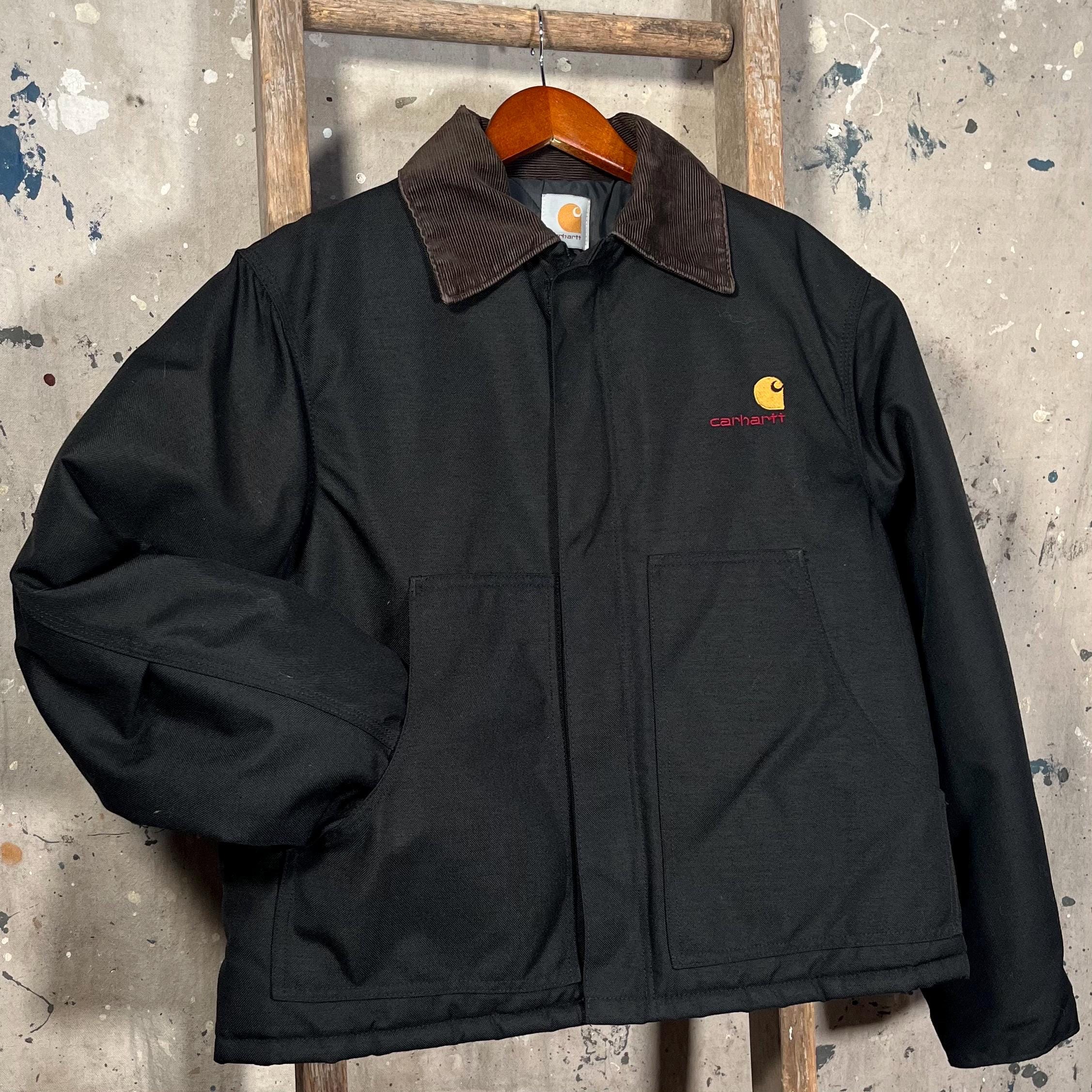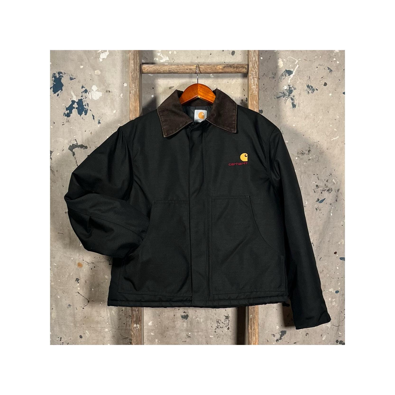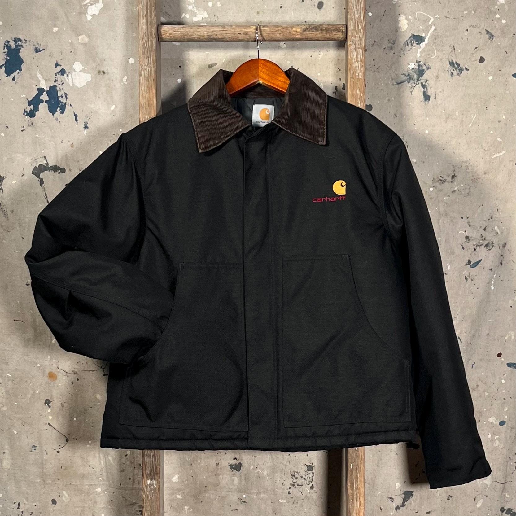 1990s Carhartt Quilt Lined Work coat. Black , made USA, deadstock - never worn condition. Tough as Nails , Cordura Like , Ripstop Fabric. Synthetic , different from typical Duck Canvas. Embroidered logo on chest, cropped fit with 2 pockets. New without tags - see photos.