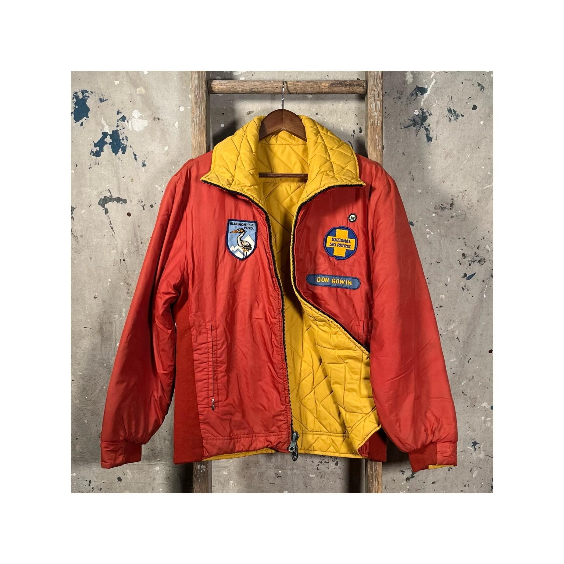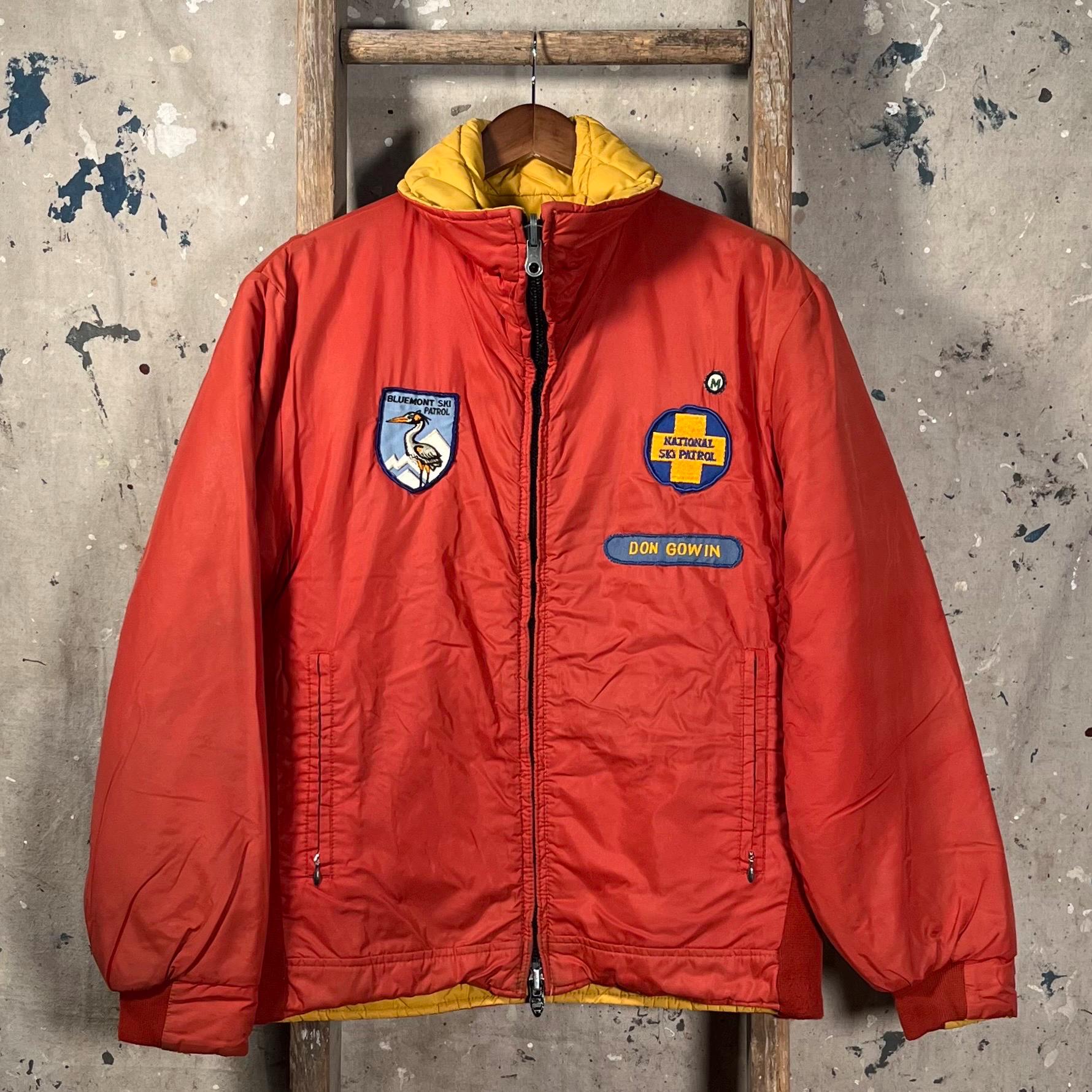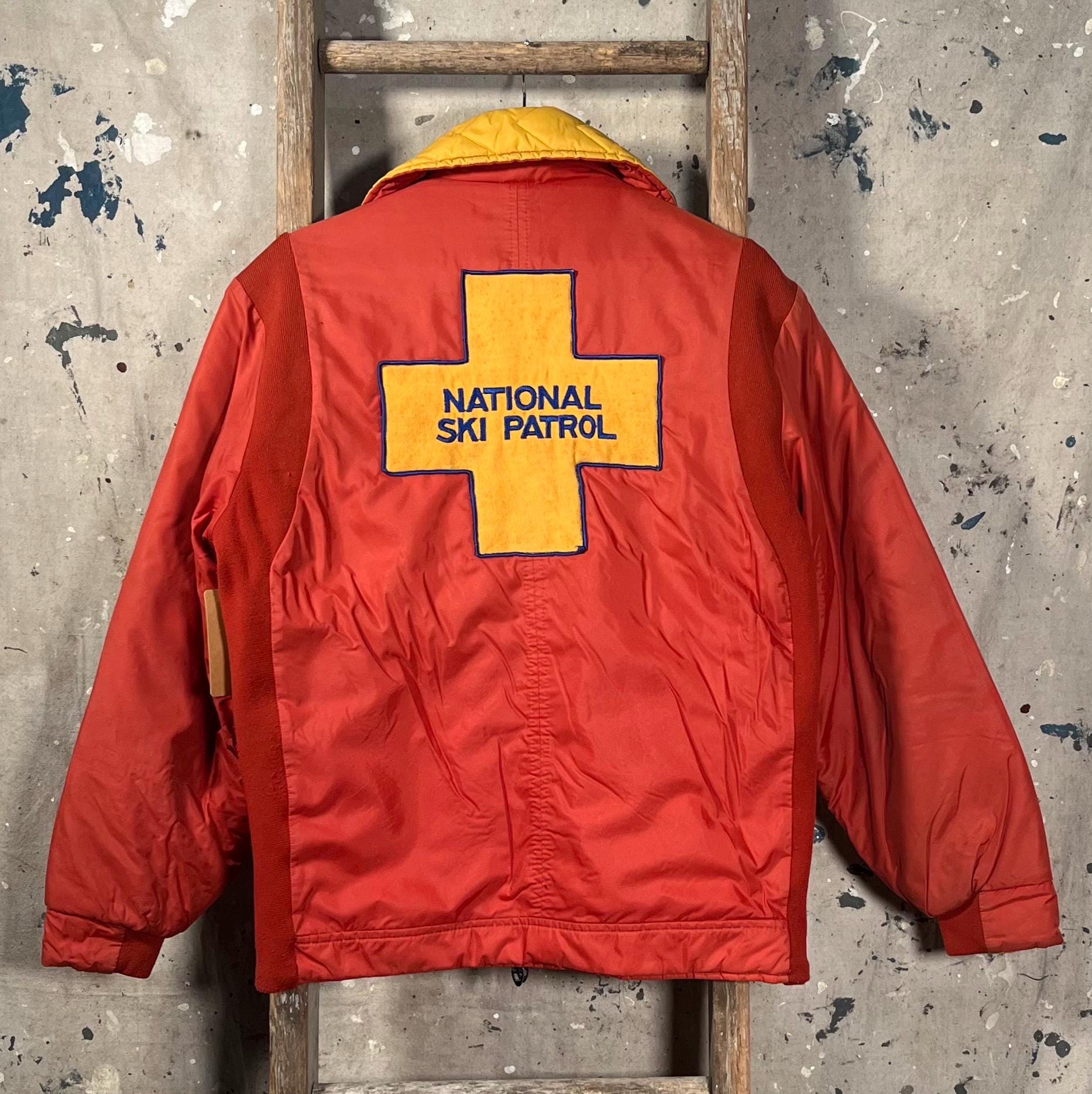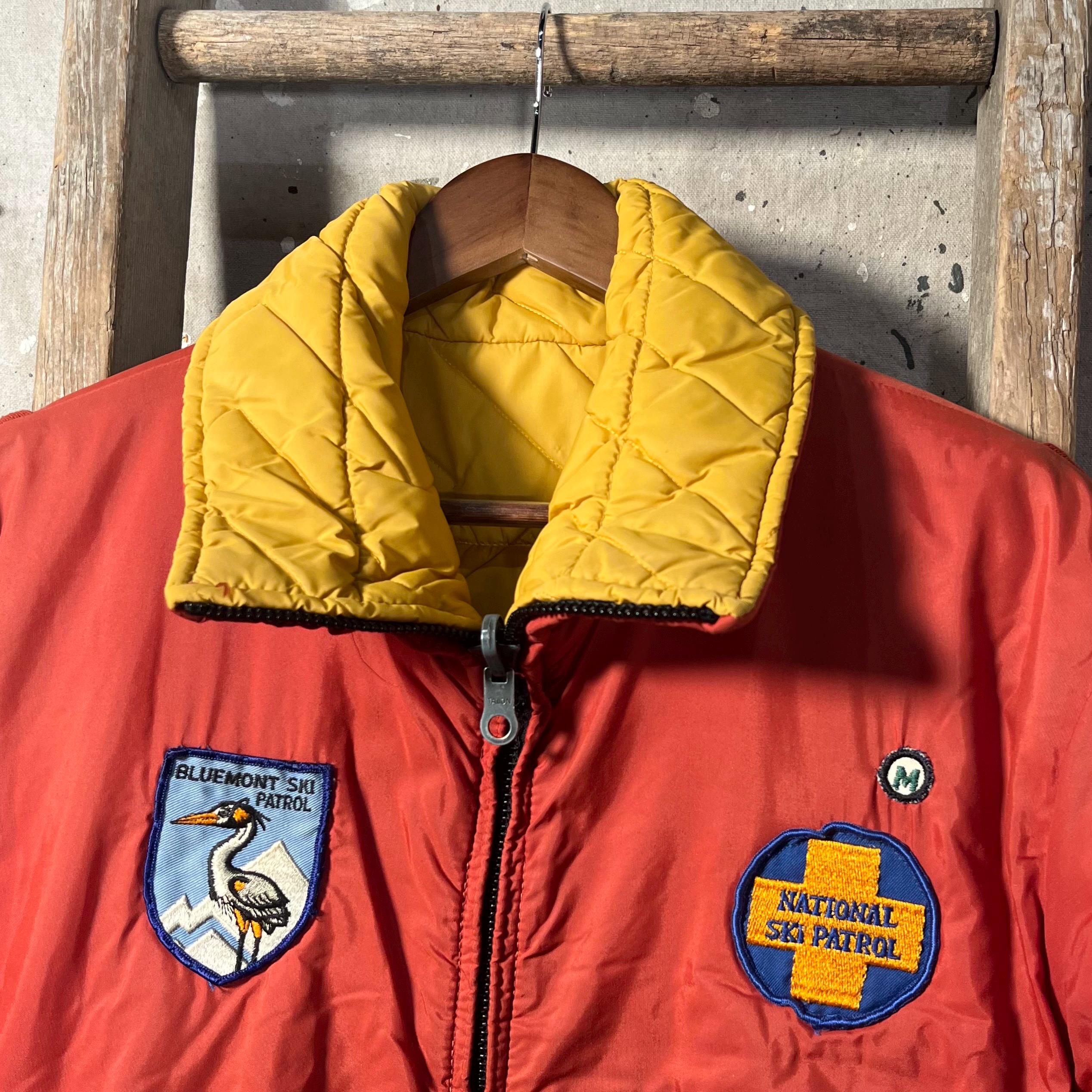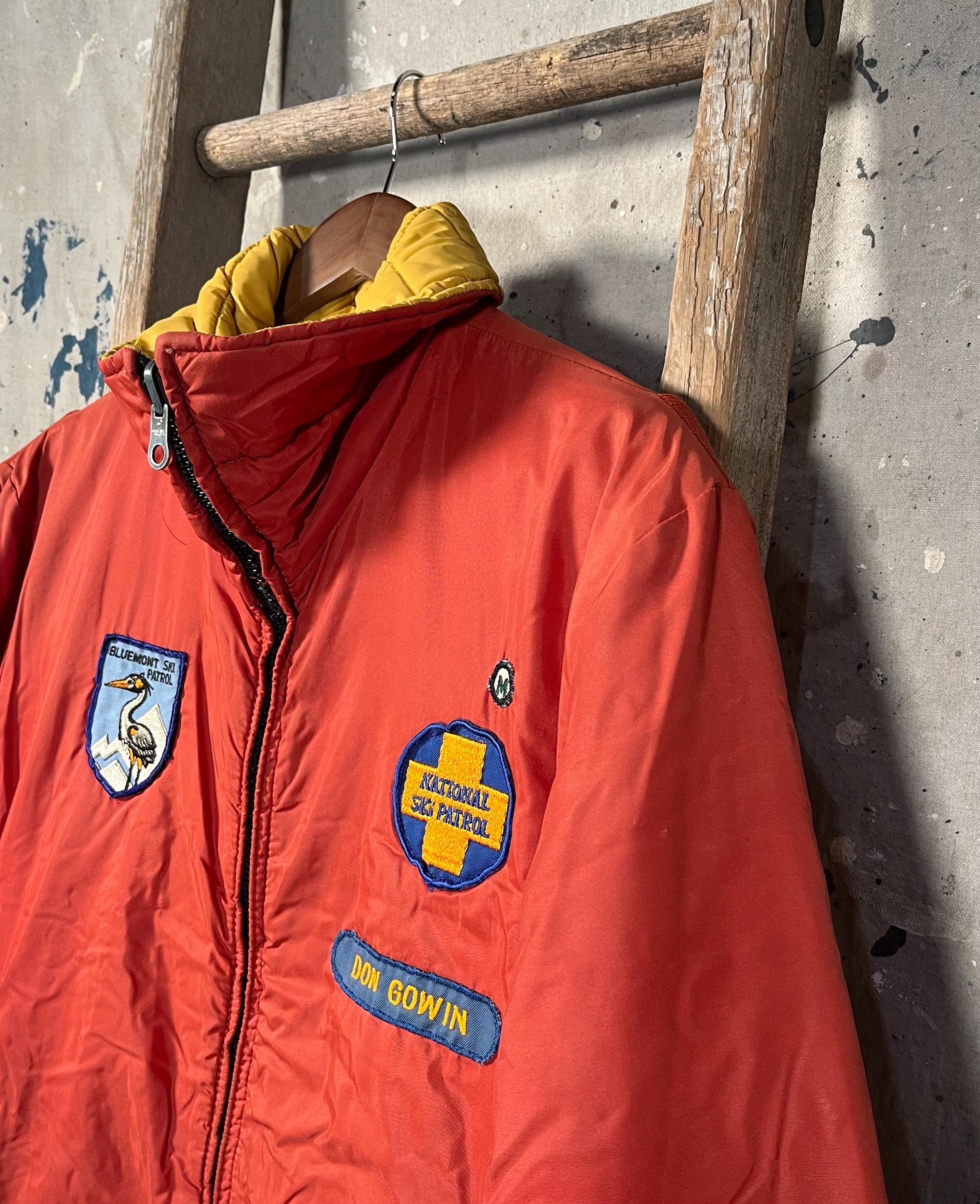 Original 1980s Ski Patrol Jacket . Reversible Yellow & Rust Orange shell with National Ski Patrol Patch on front and back Good condition , natural distressing - see photos.
