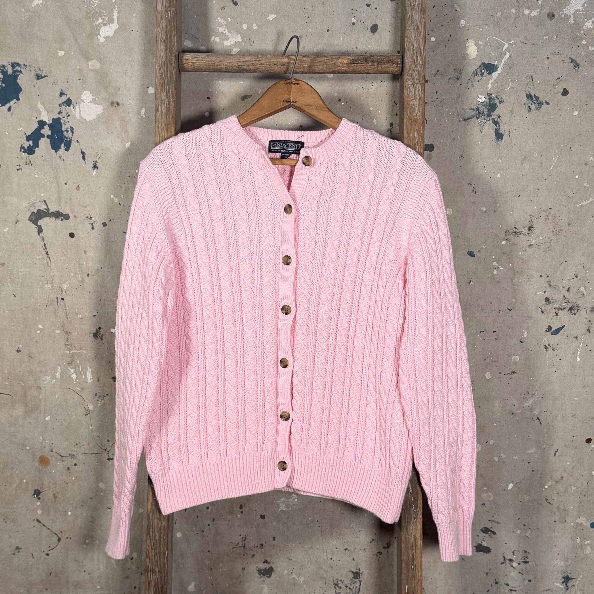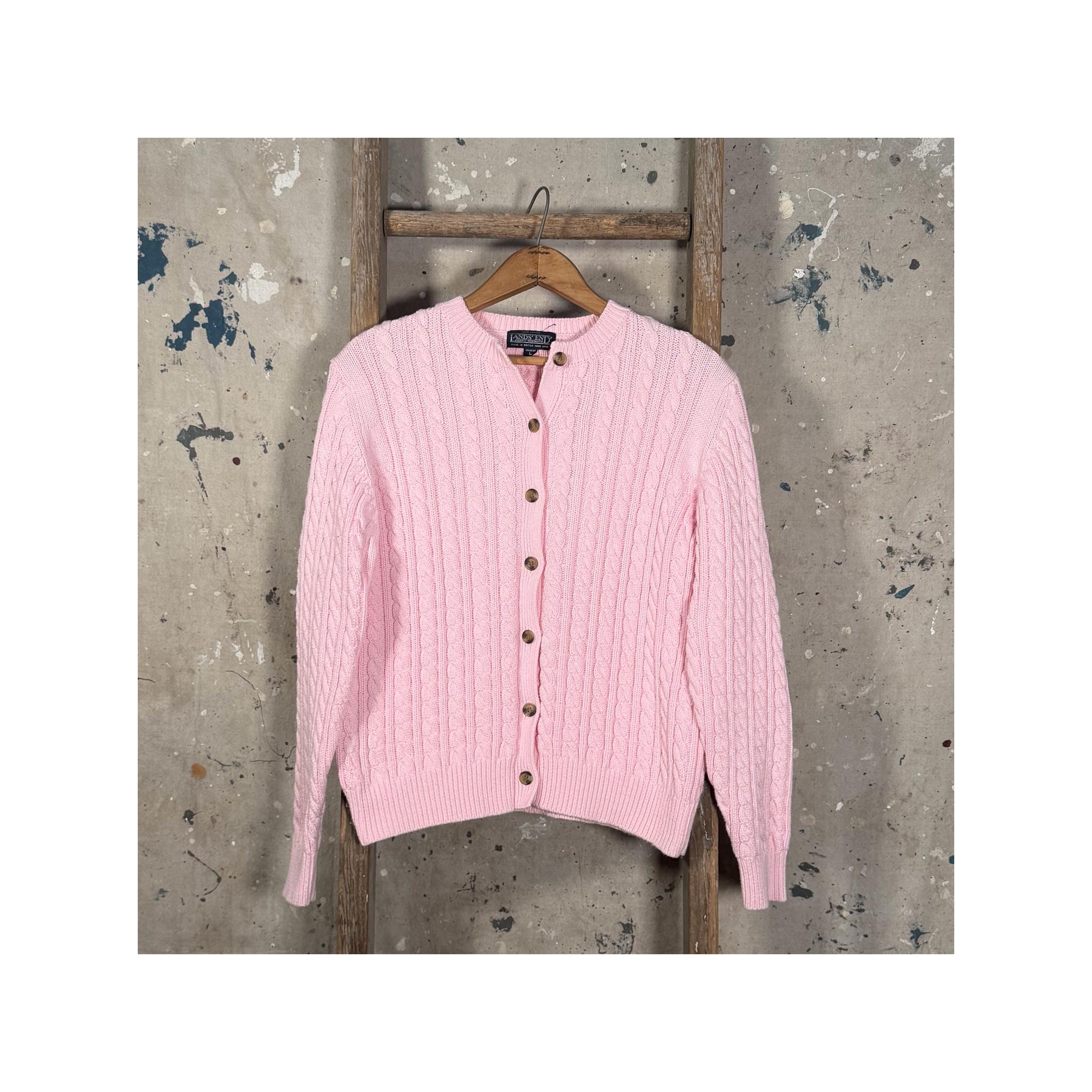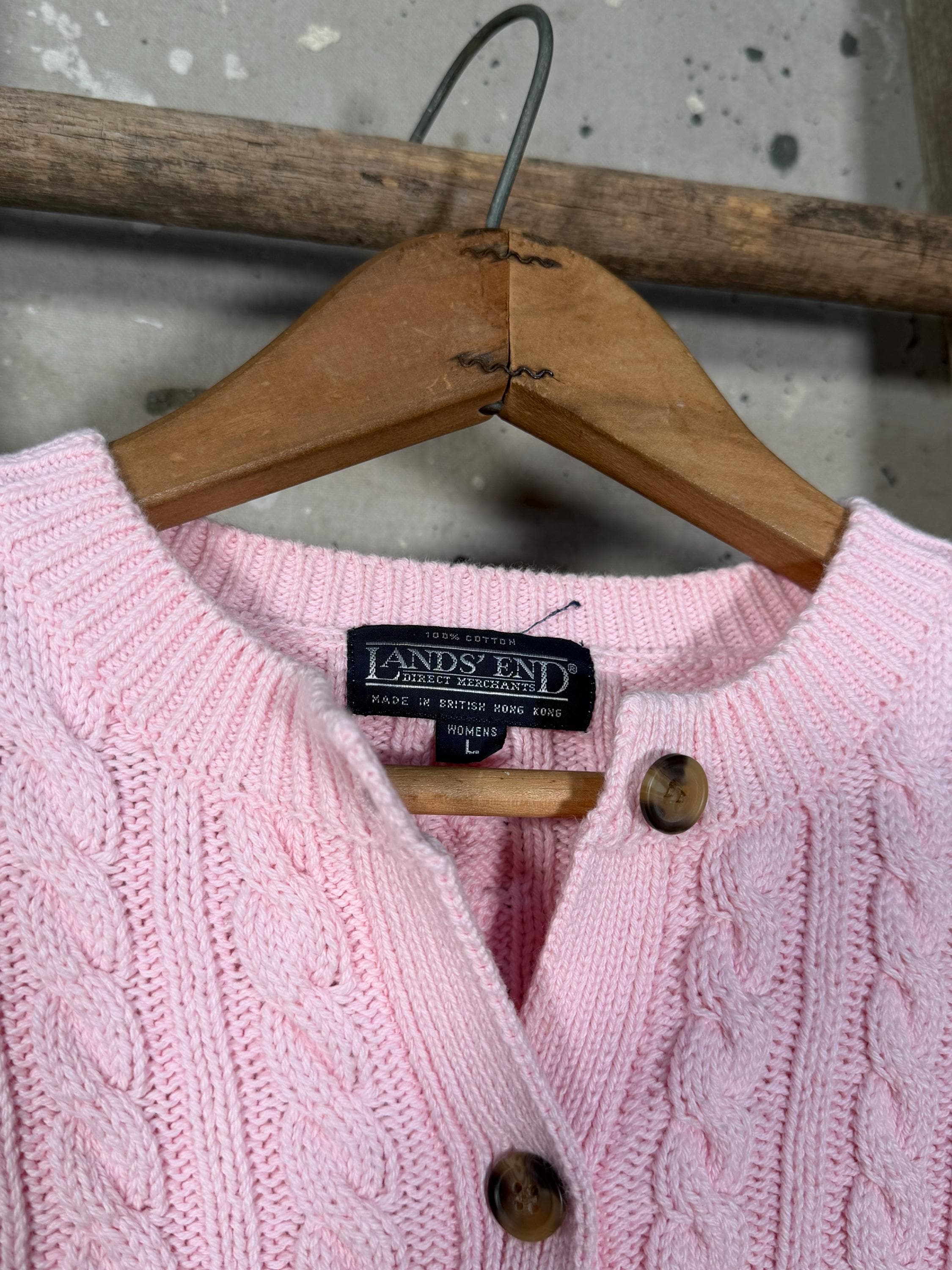 1990s Land's End Cable Knit Cardigan Sweater. All cotton , pink color, cable knit cardigan. Very soft and excellent quality. Plenty of stretch. Good vintage condition - see photos.