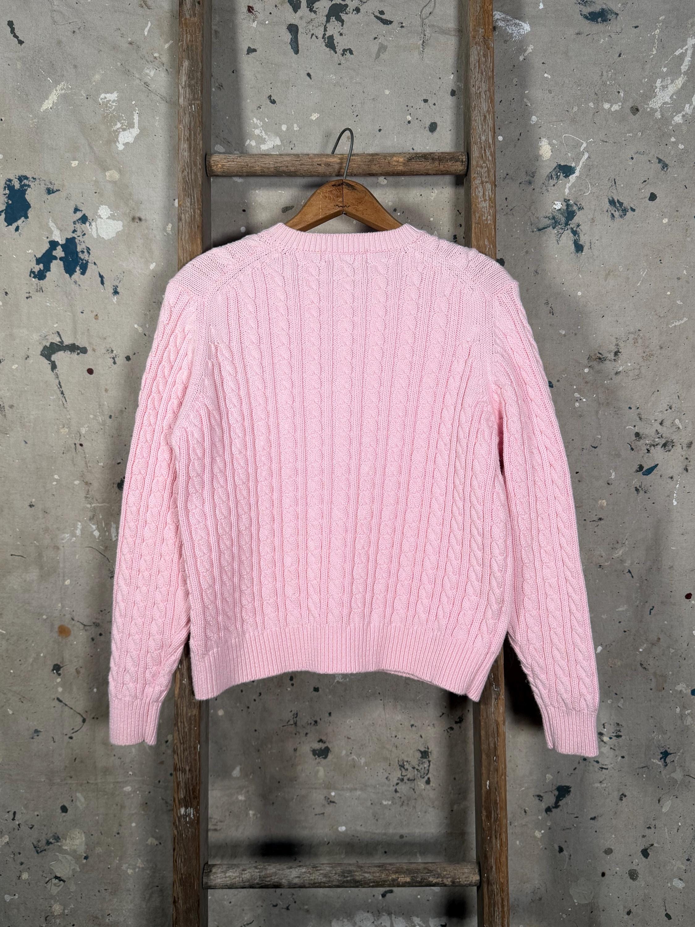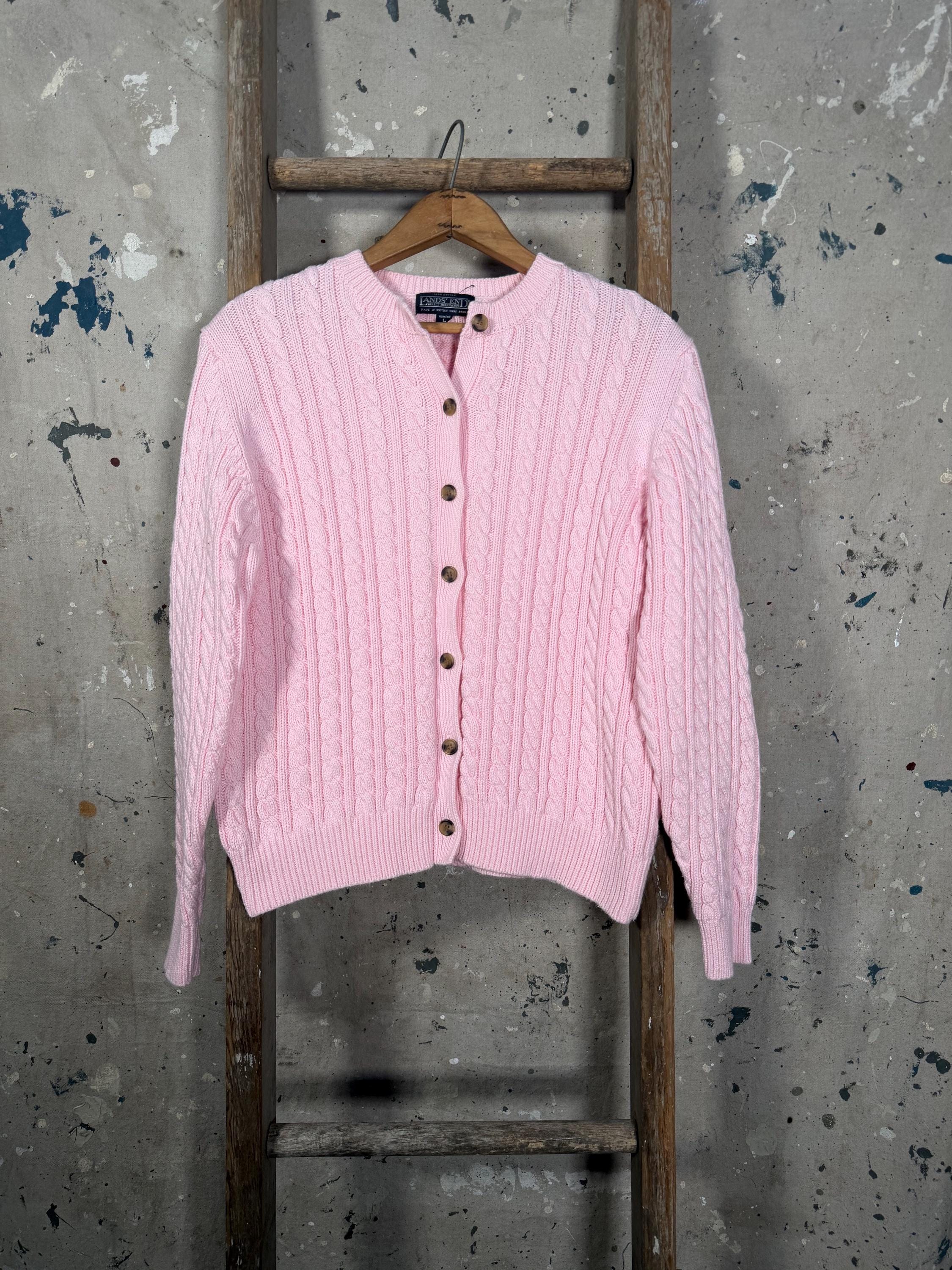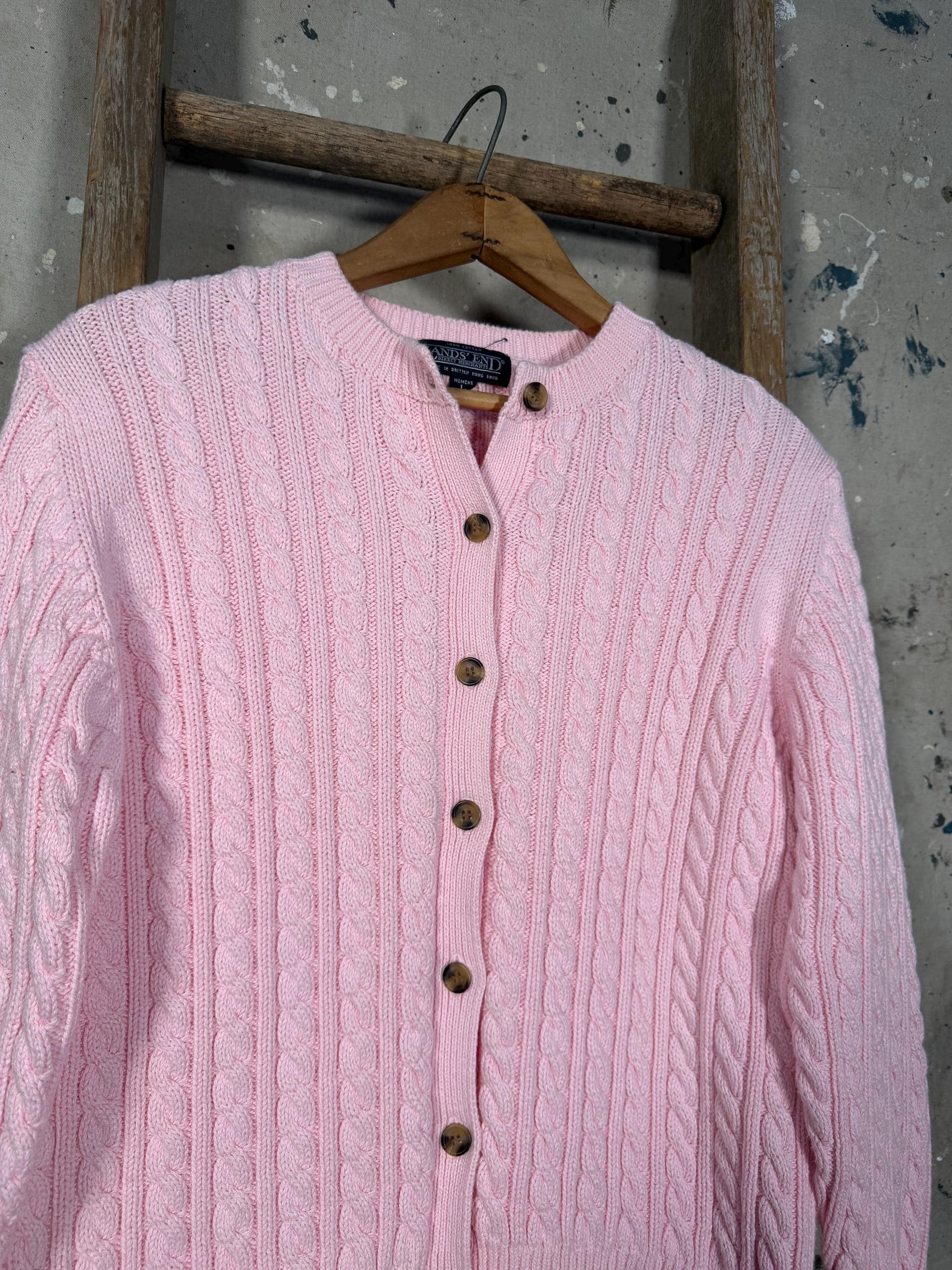 1990s Land's End Cable Knit Cardigan Sweater. All cotton , pink color, cable knit cardigan. Very soft and excellent quality. Plenty of stretch. Good vintage condition - see photos.
