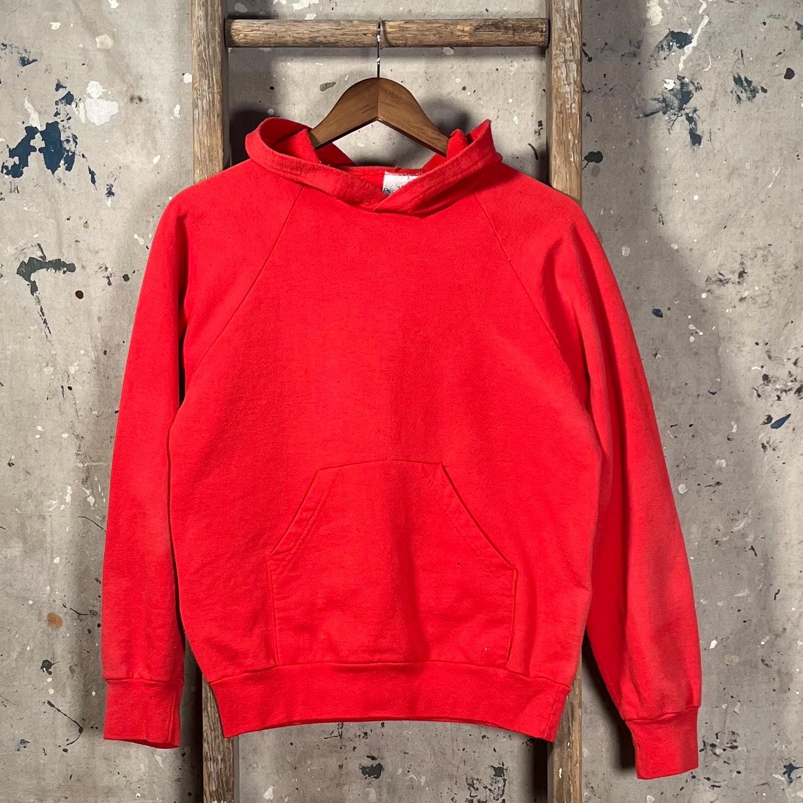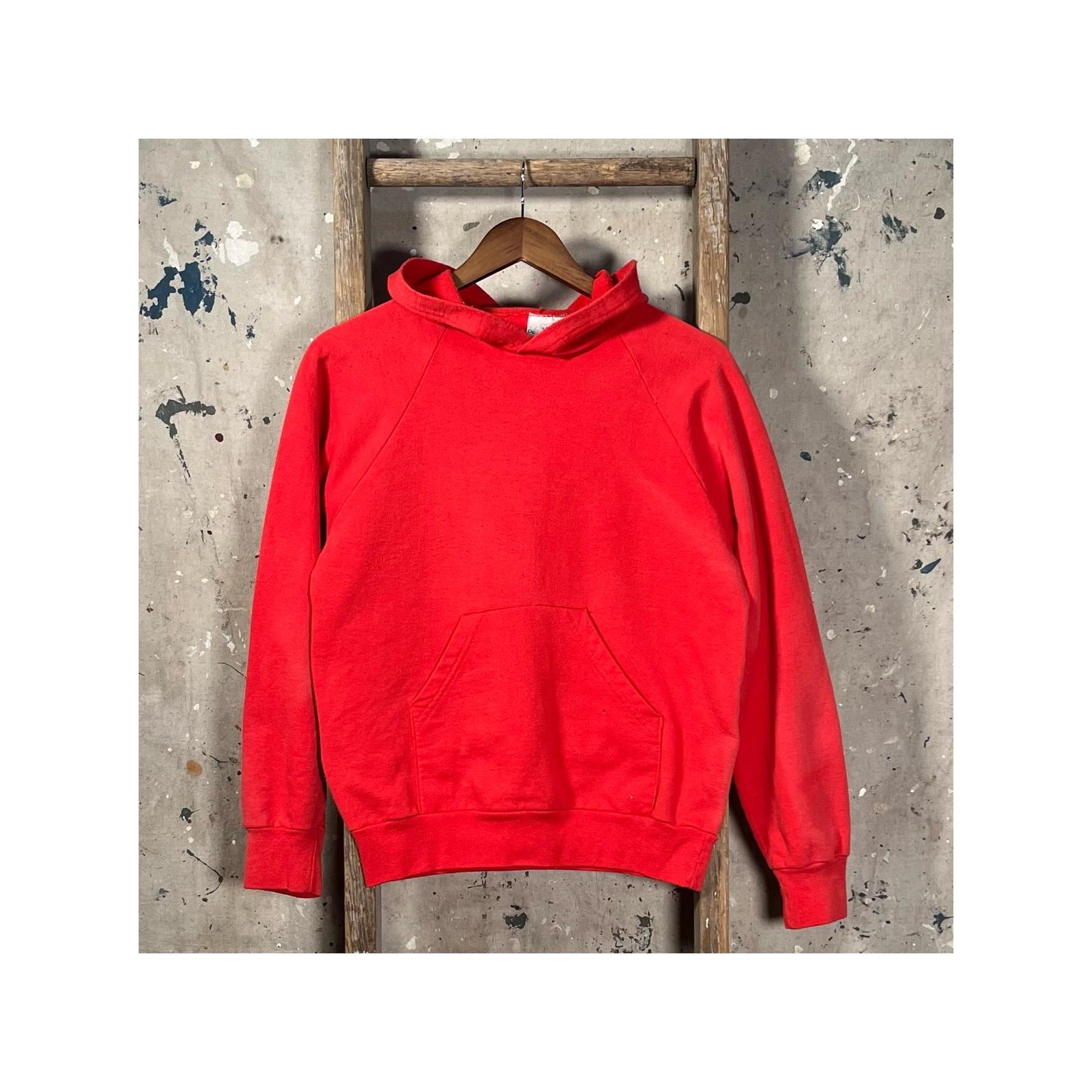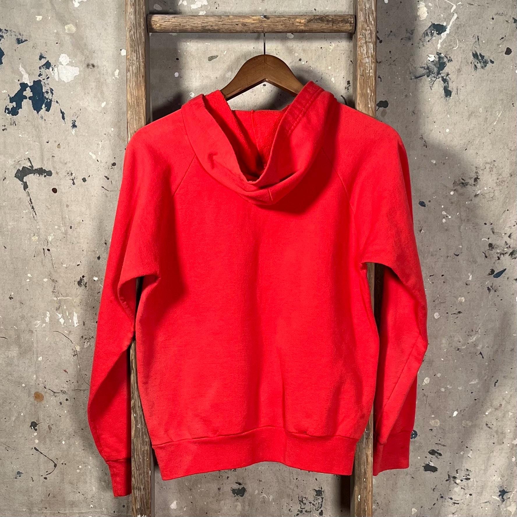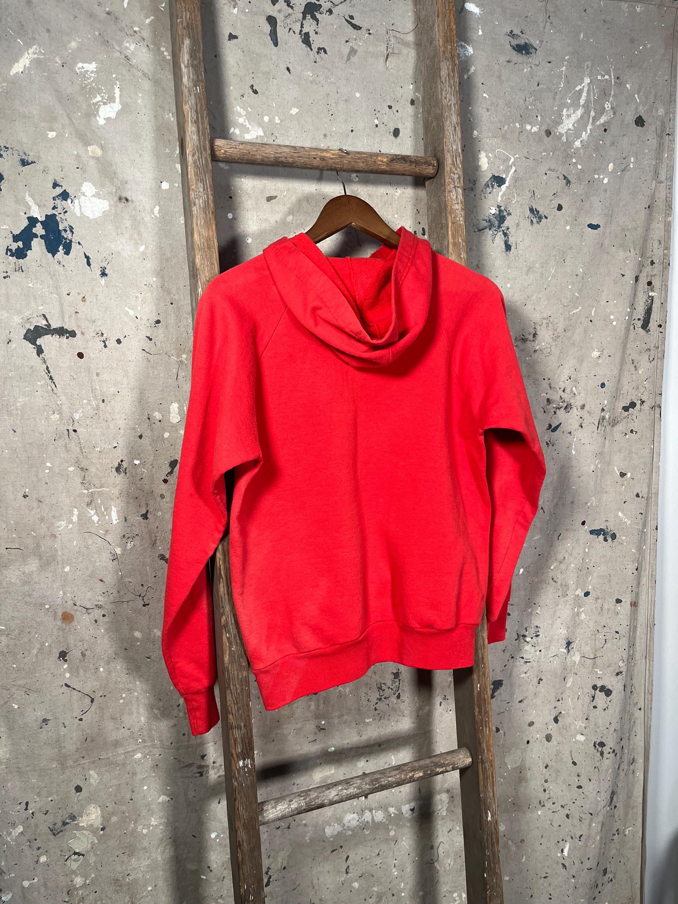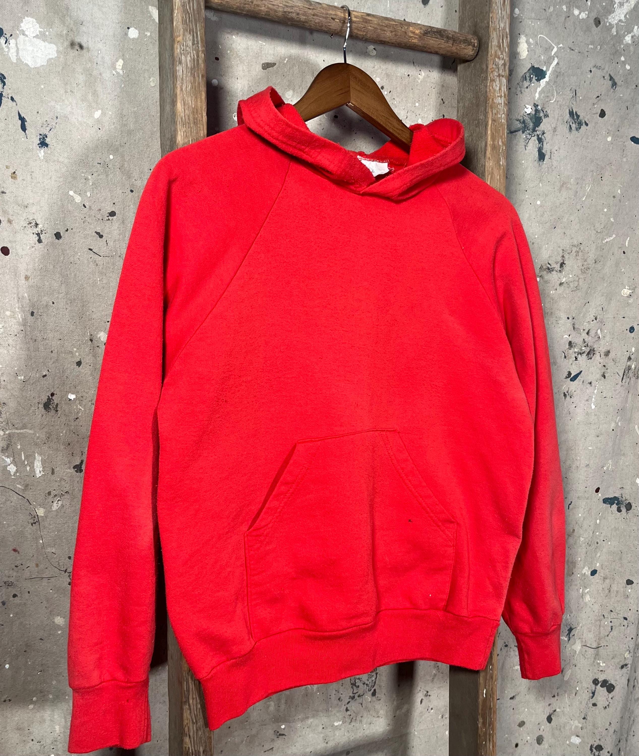 1970s / 80s perfectly faded red hoodie . Soft cotton sweatshirt w/ raglan sleeves. Well worn, heavily distressed. See photos. Good condition .