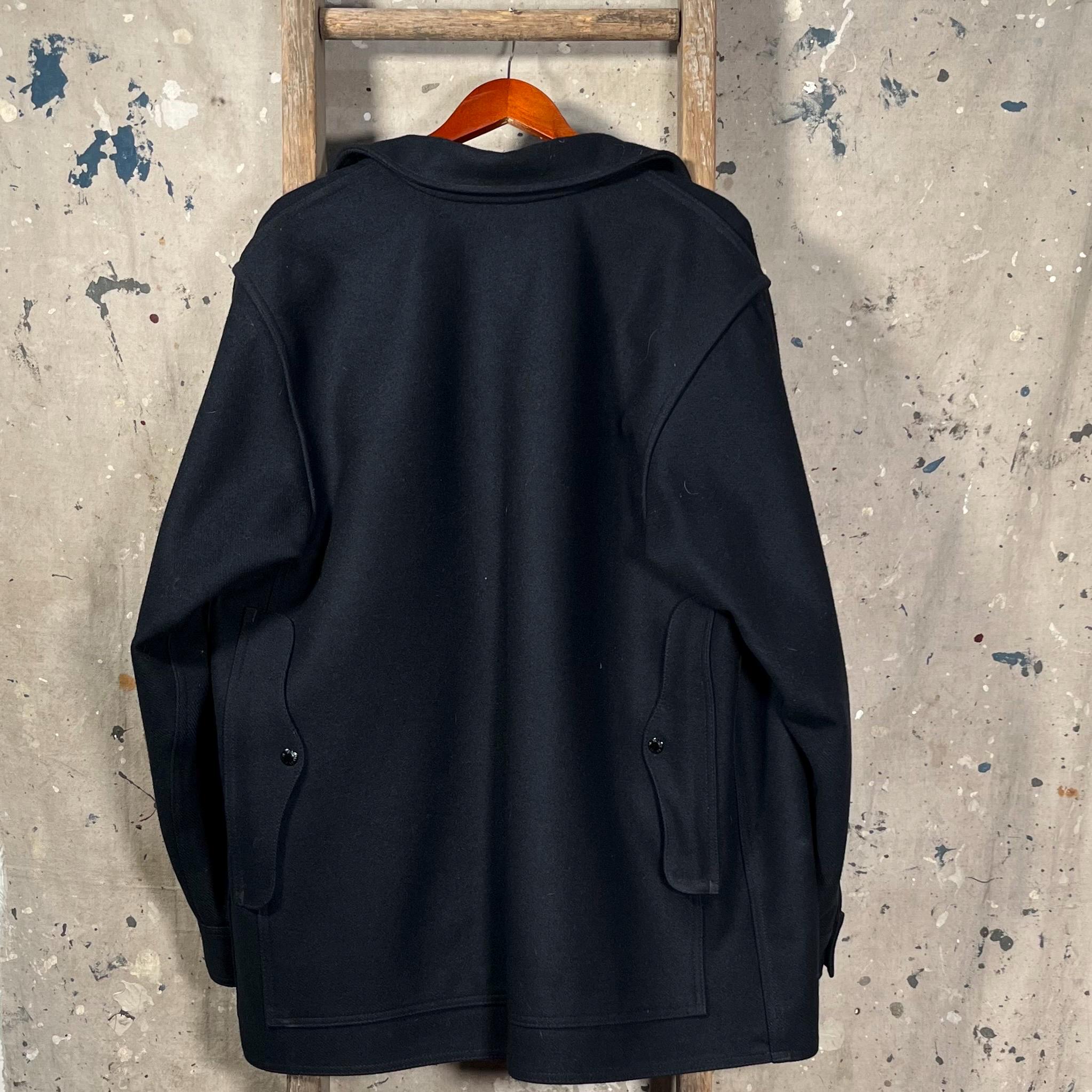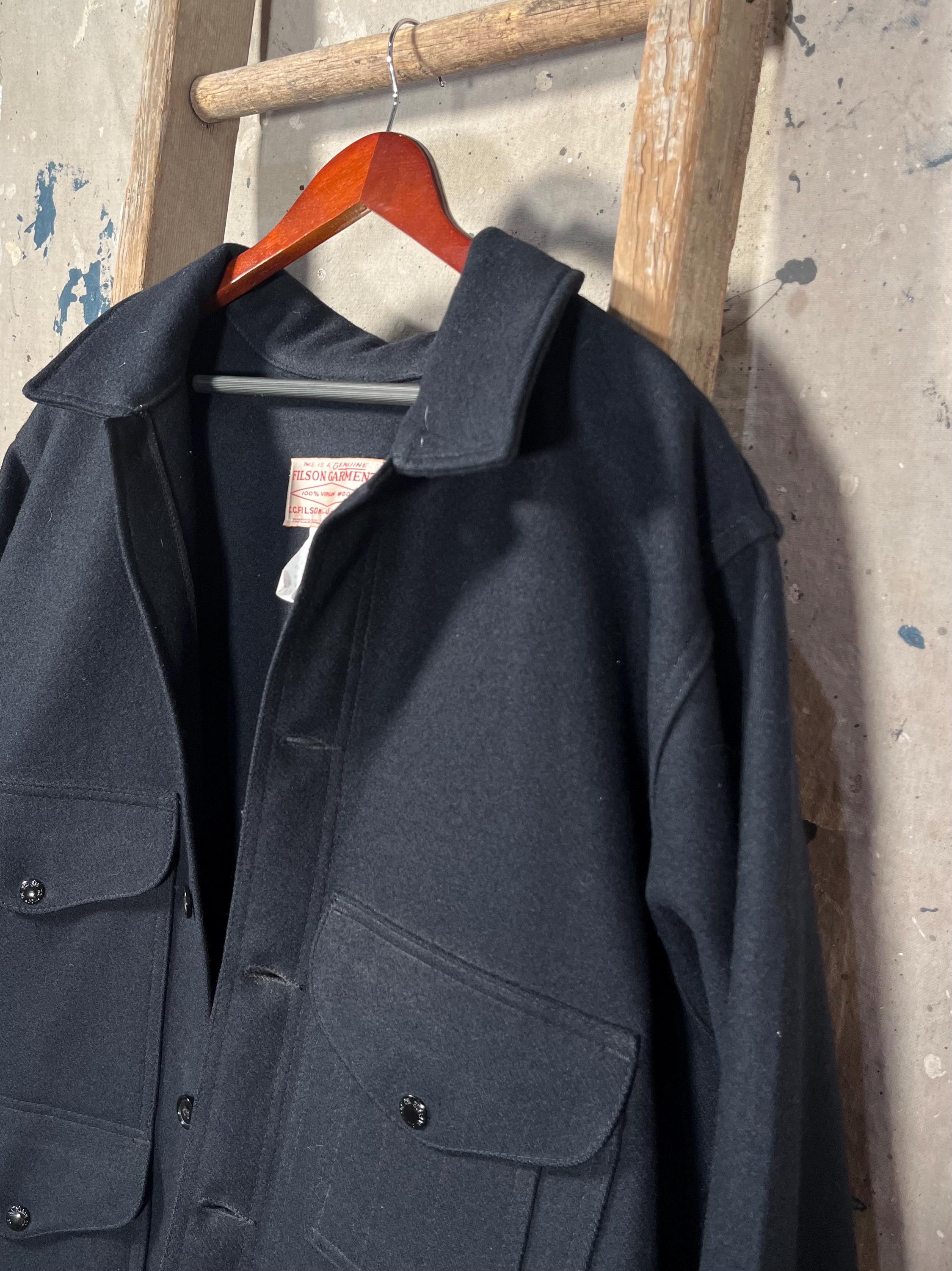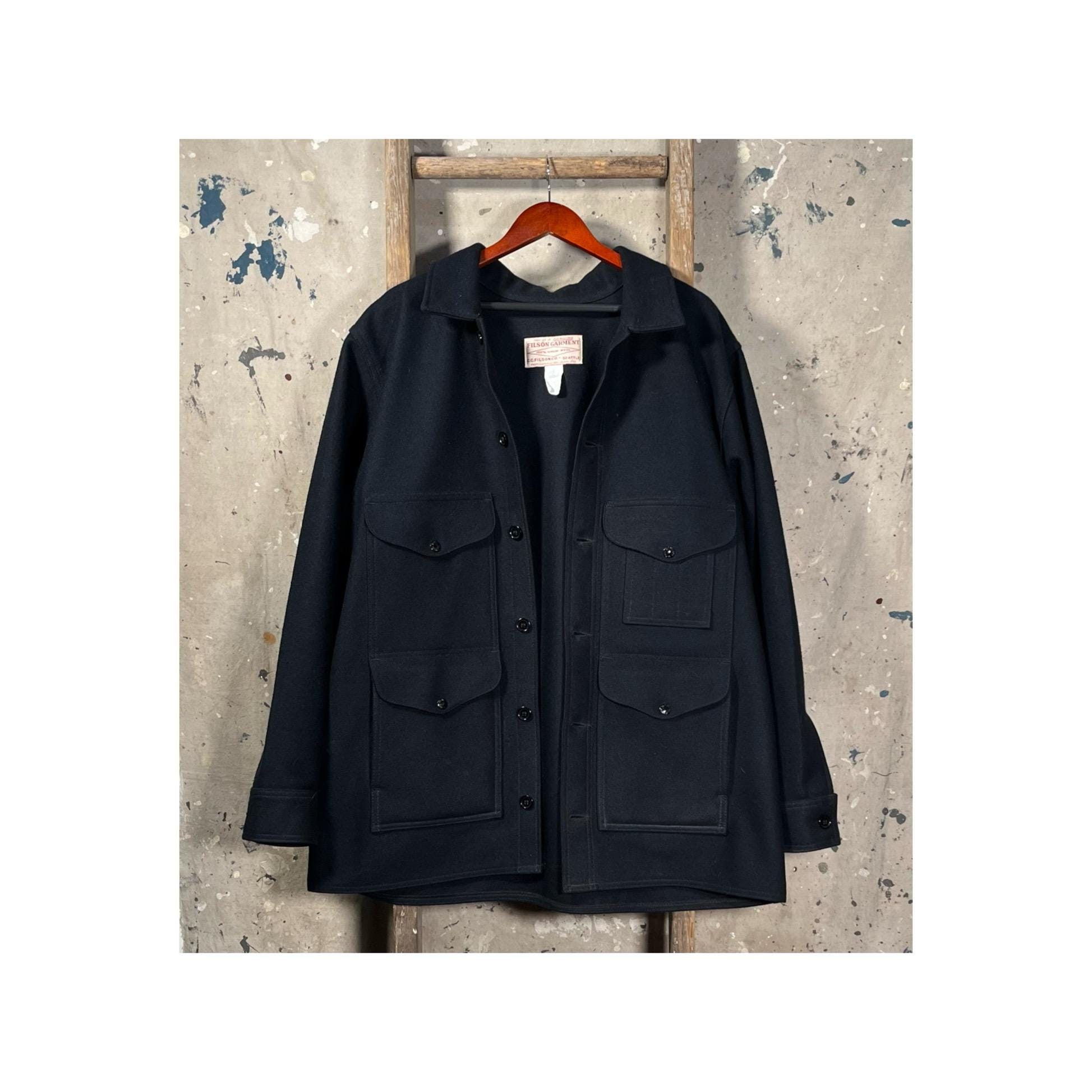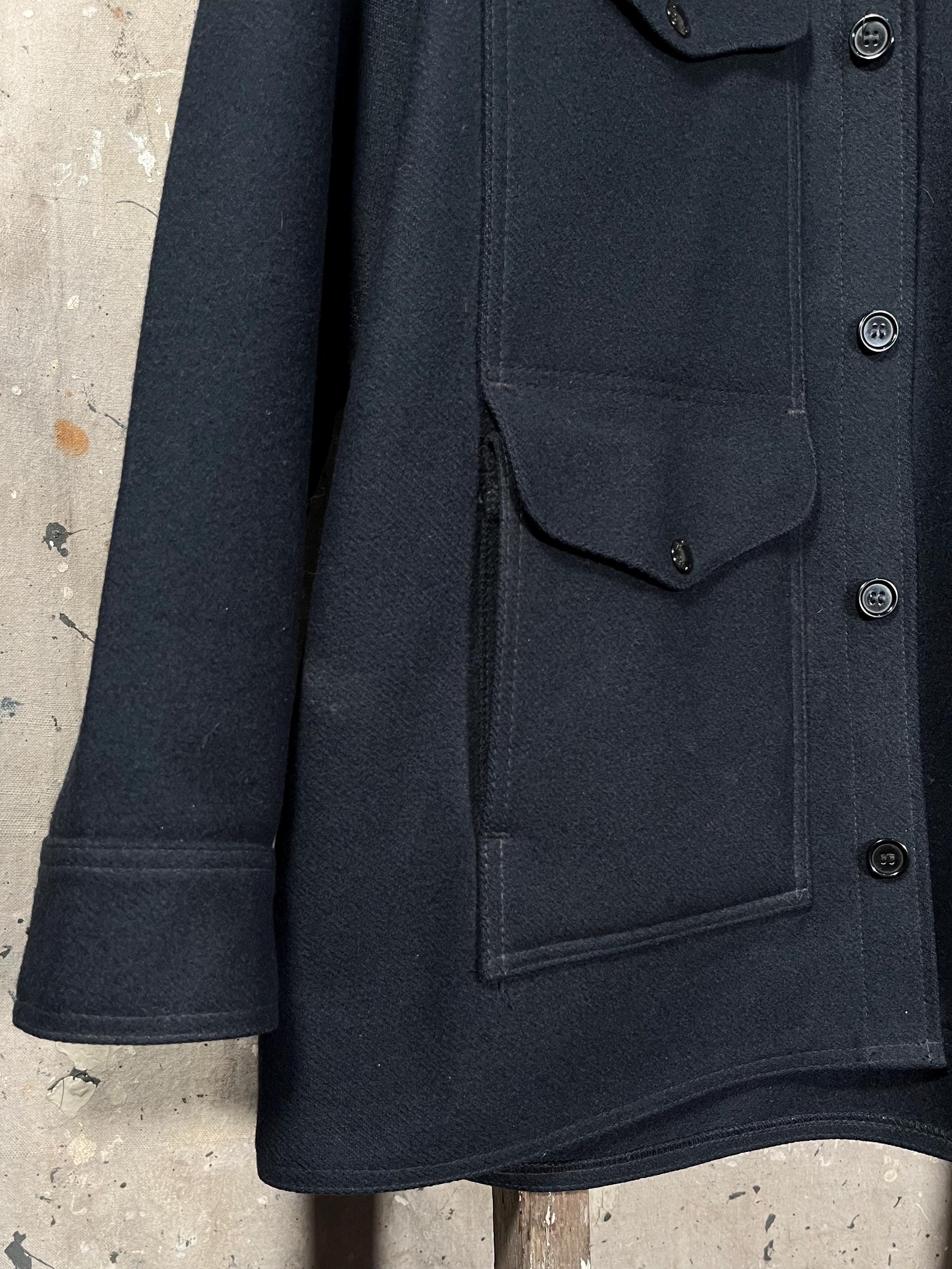 Made in USA Filson Mackinaw cruiser jacket. Features Navy Blue , 100% Virgin Wool with 4 front pockets and 6 Button closure. 1 dual-entry rear map pocket. Naturally water-repellent , Big Size 48 - XXL. Great vintage condition , little to no wear - See photos.
