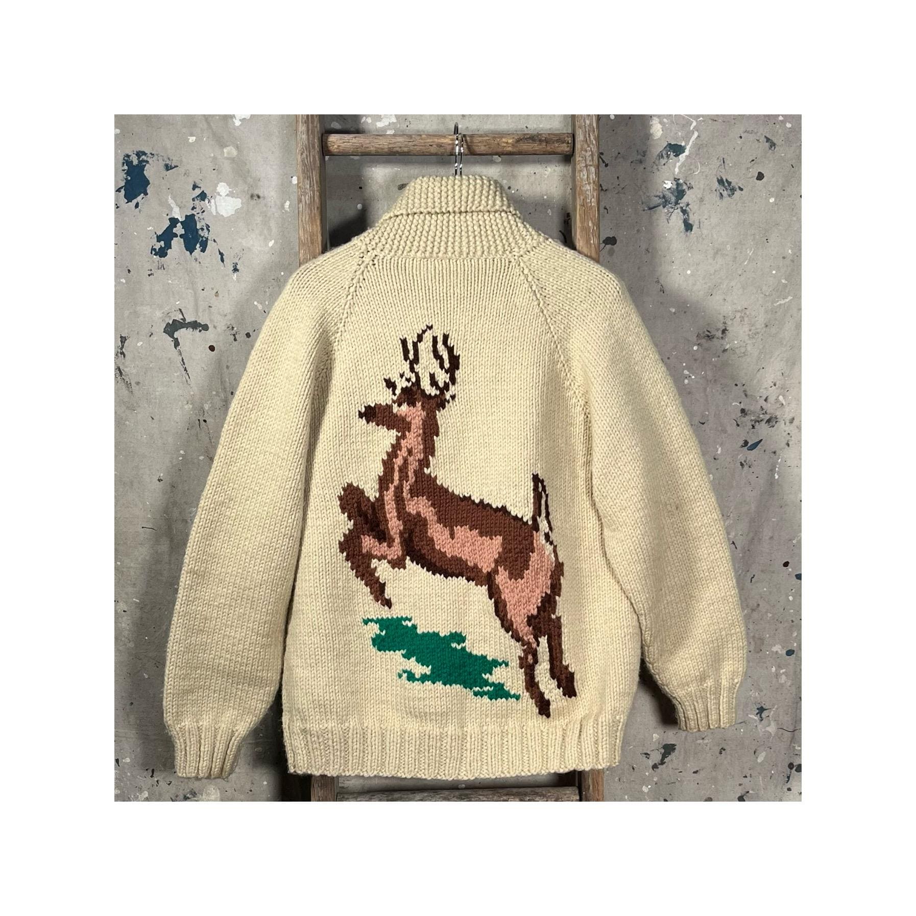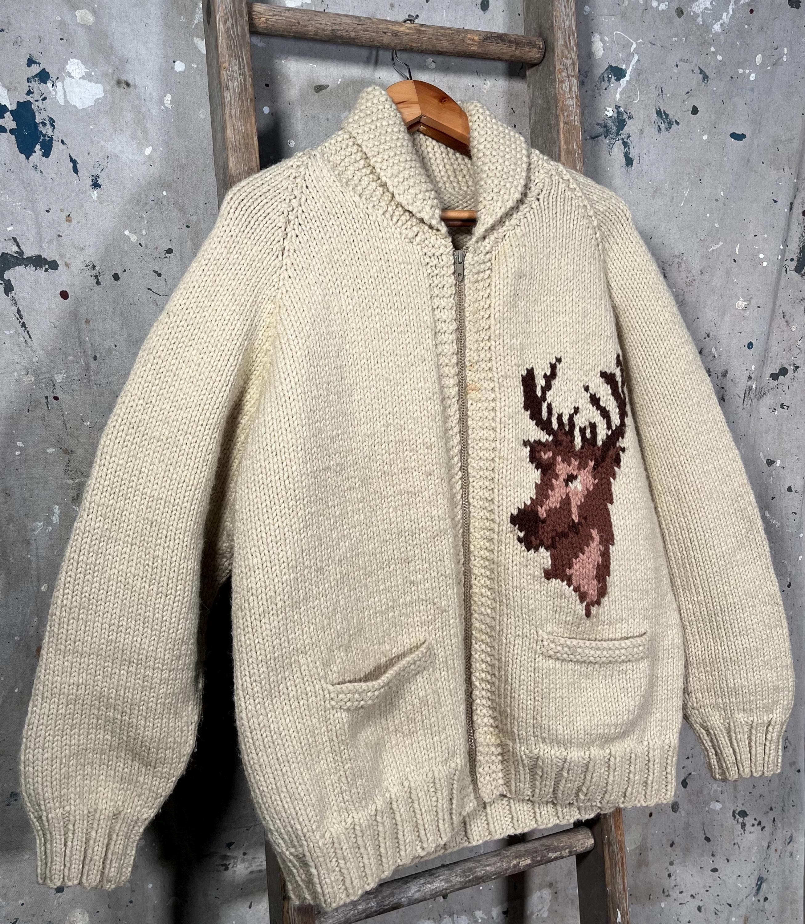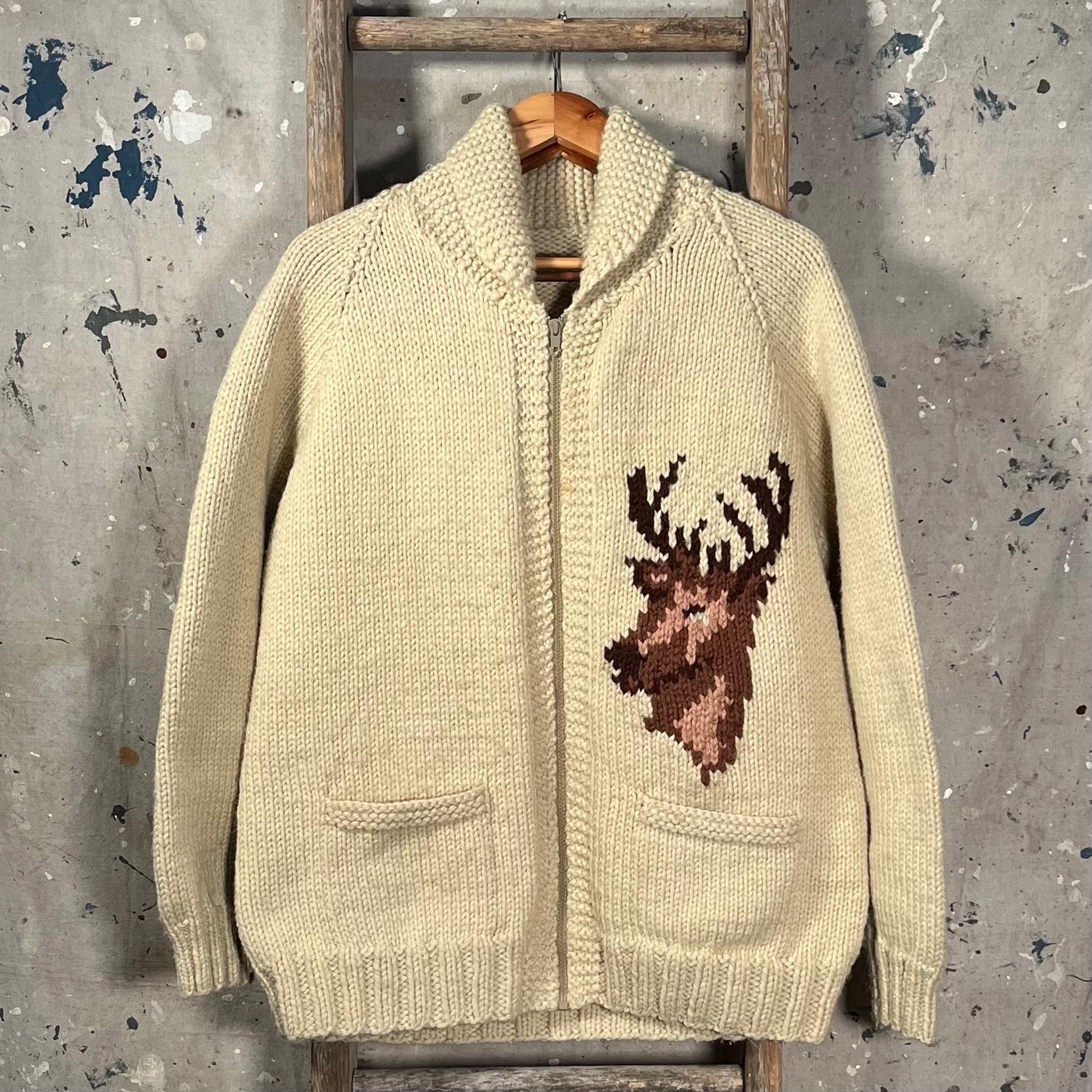 Beautiful hand knit 1960s/70s Cowichan sweater. Features deer pattern motif on front and back. Shawl collar , full zip cardigan with exceptionally thick wool. Natural distressing , small discoloration along zipper. Good vintage condition - see photos.