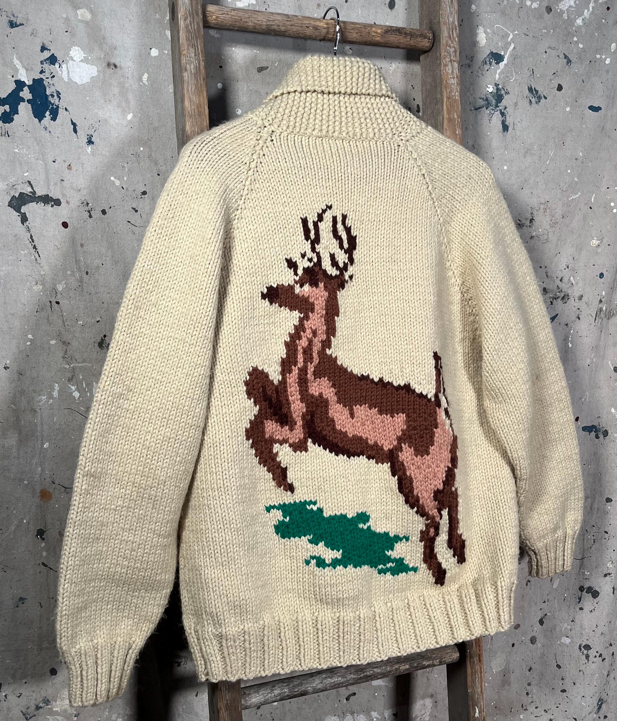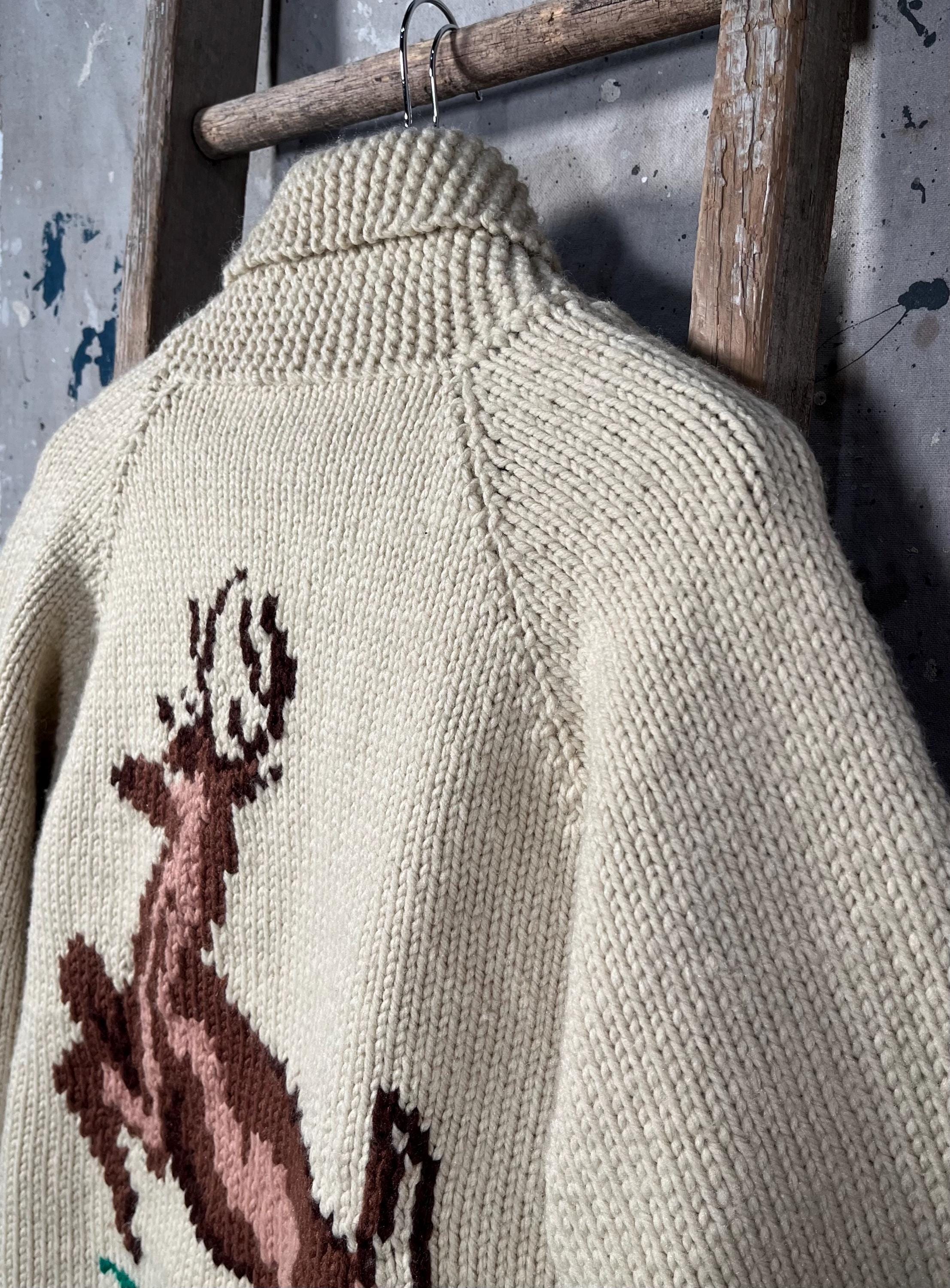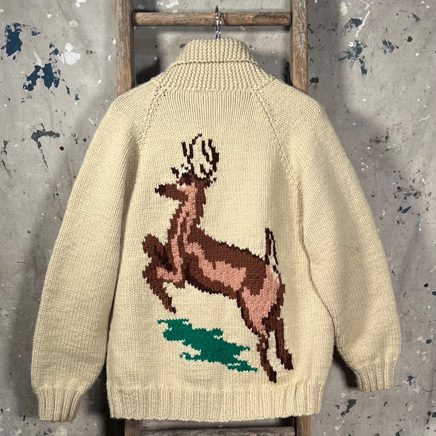 Beautiful hand knit 1960s/70s Cowichan sweater. Features deer pattern motif on front and back. Shawl collar , full zip cardigan with exceptionally thick wool. Natural distressing , small discoloration along zipper. Good vintage condition - see photos.