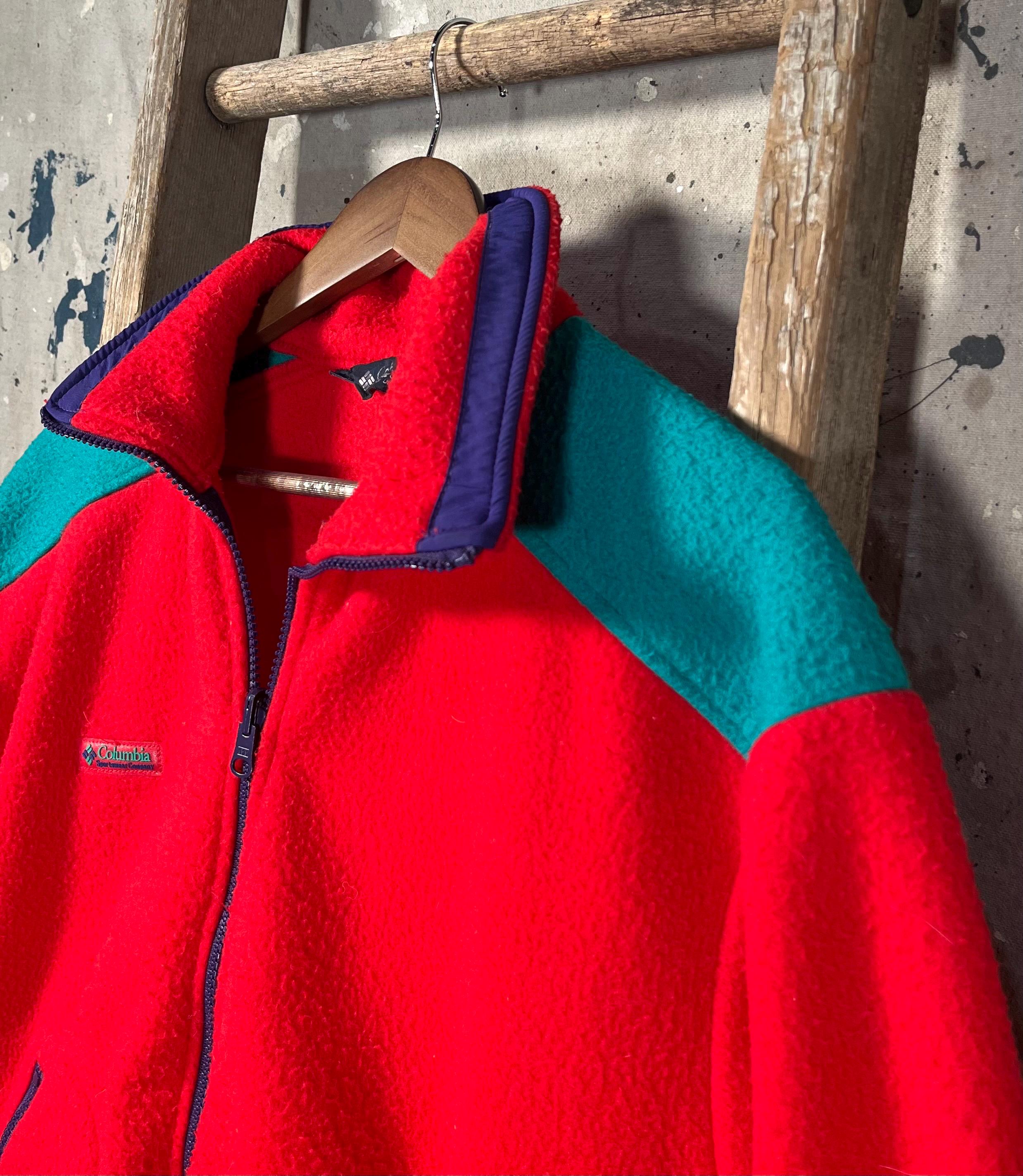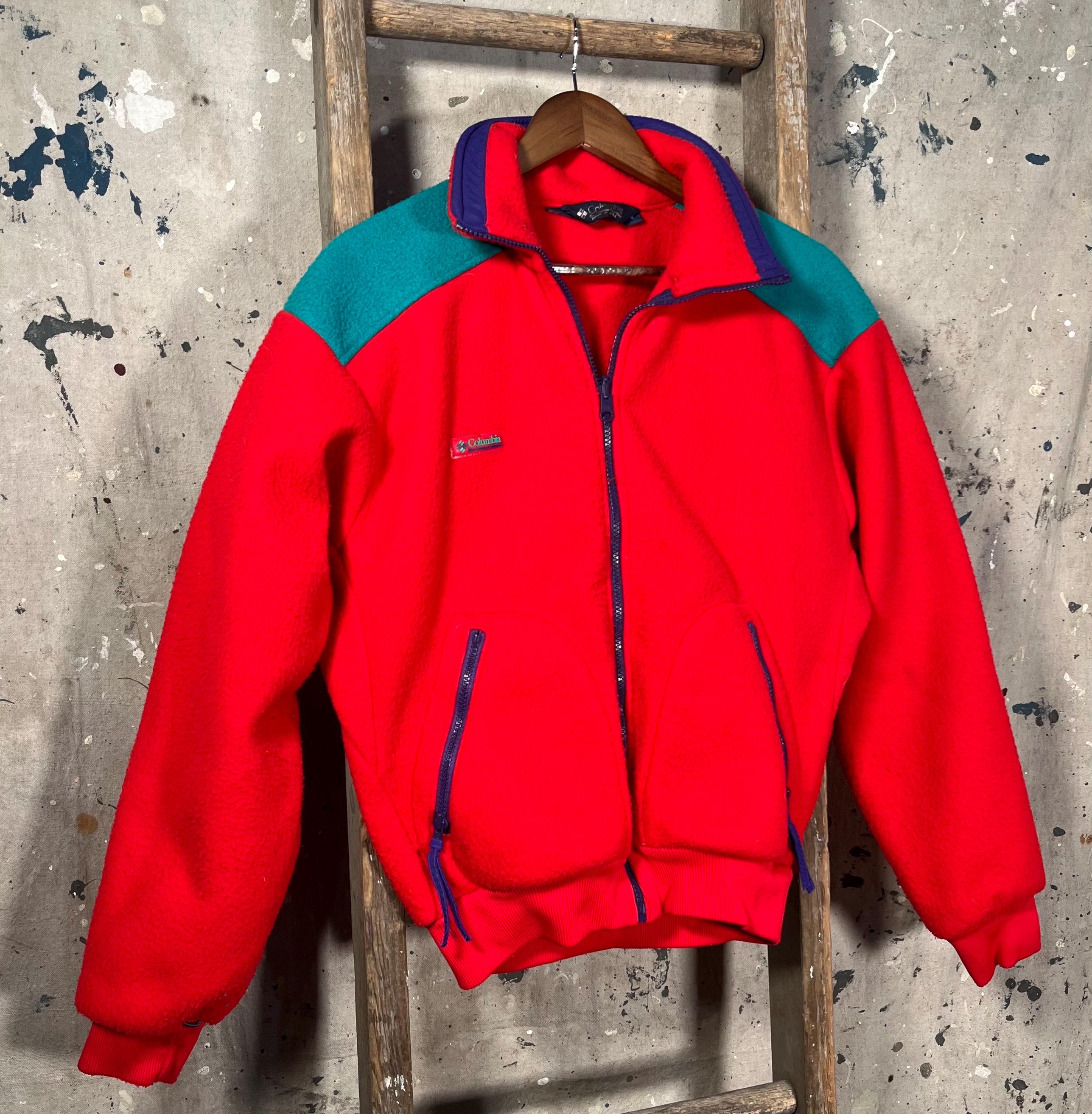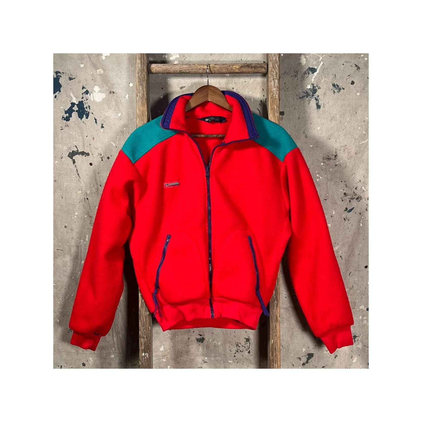 1990s Columbia Fleece. Features red w/ turquoise fleece. Full zip closure with 2 zipper pockets. Great insulating or outer layer. Made in USA. Good vintage condition , light pilling throughout. See Photos.