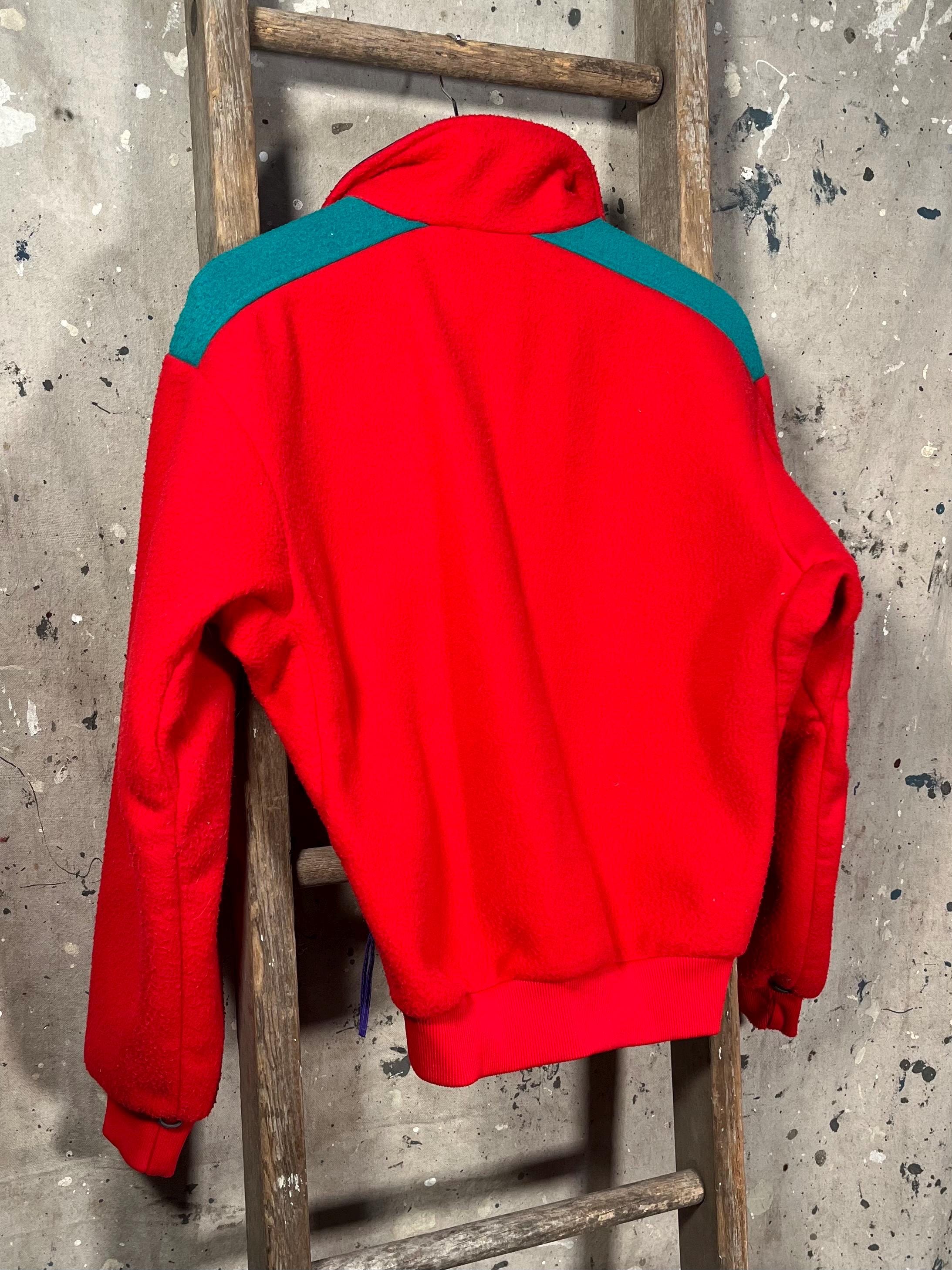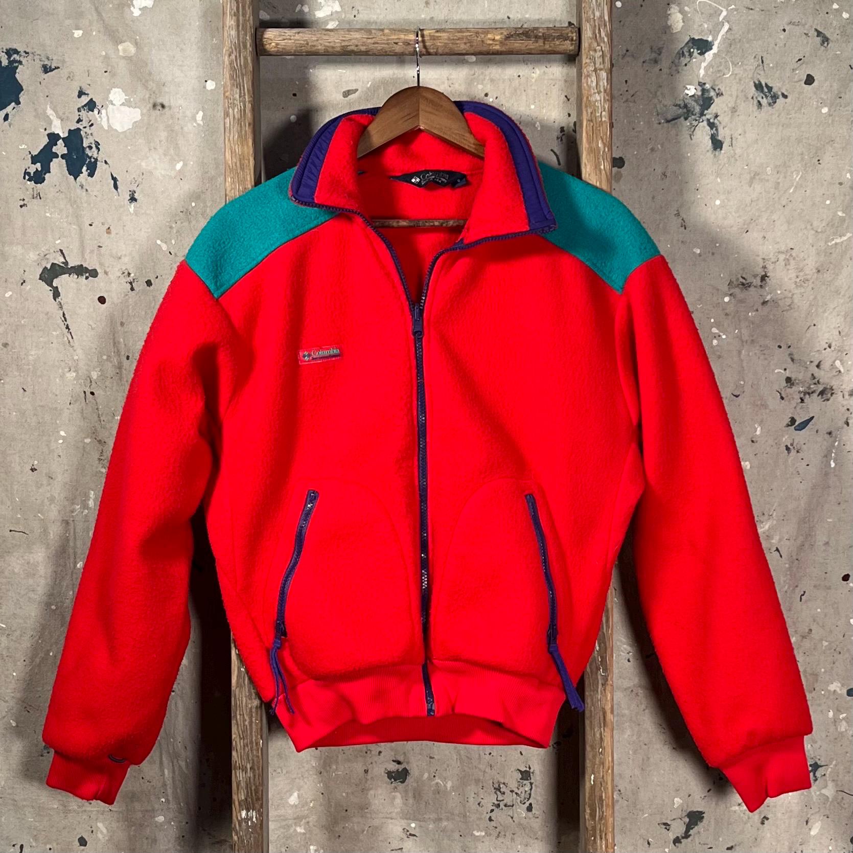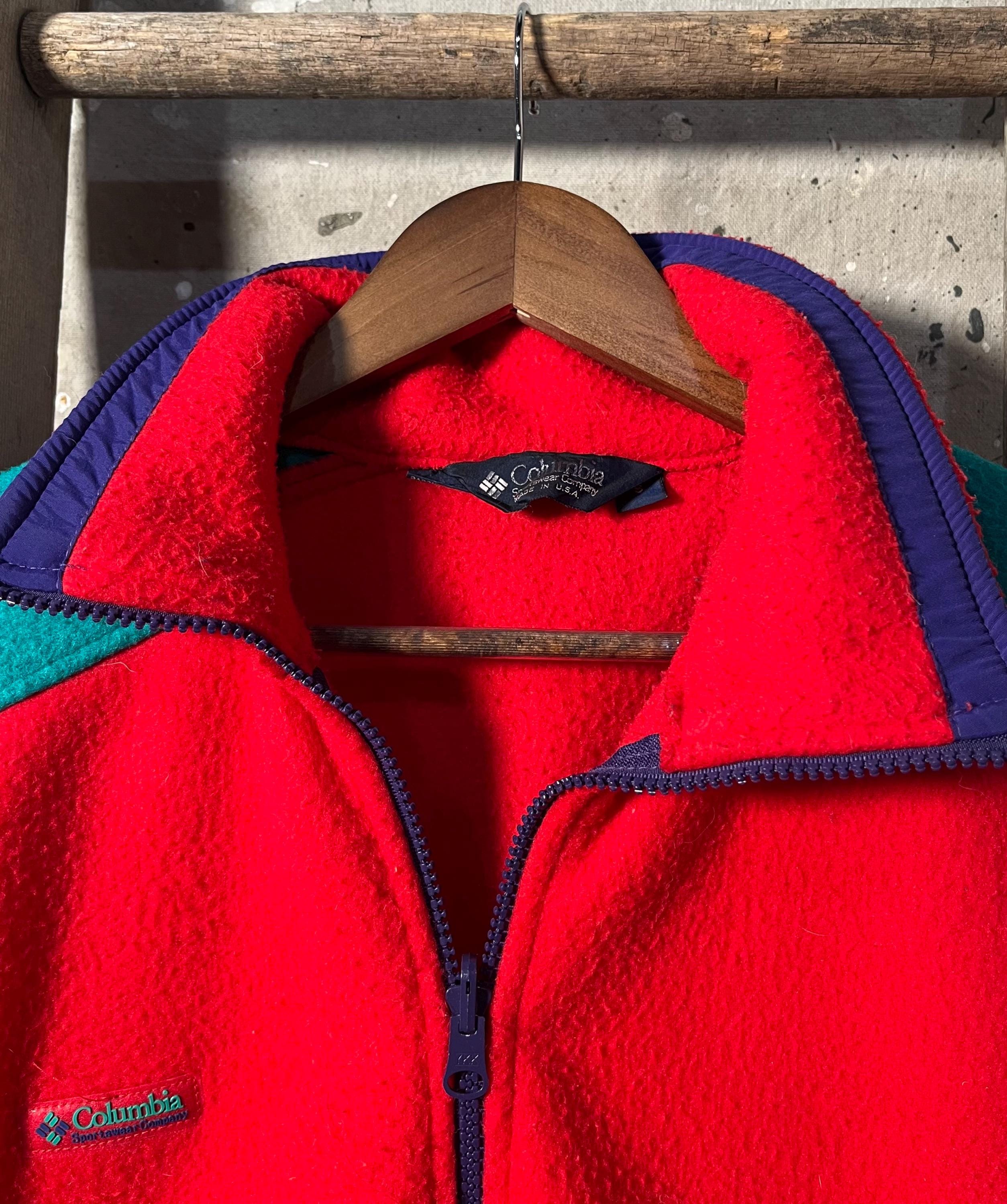 1990s Columbia Fleece. Features red w/ turquoise fleece. Full zip closure with 2 zipper pockets. Great insulating or outer layer. Made in USA. Good vintage condition , light pilling throughout. See Photos.