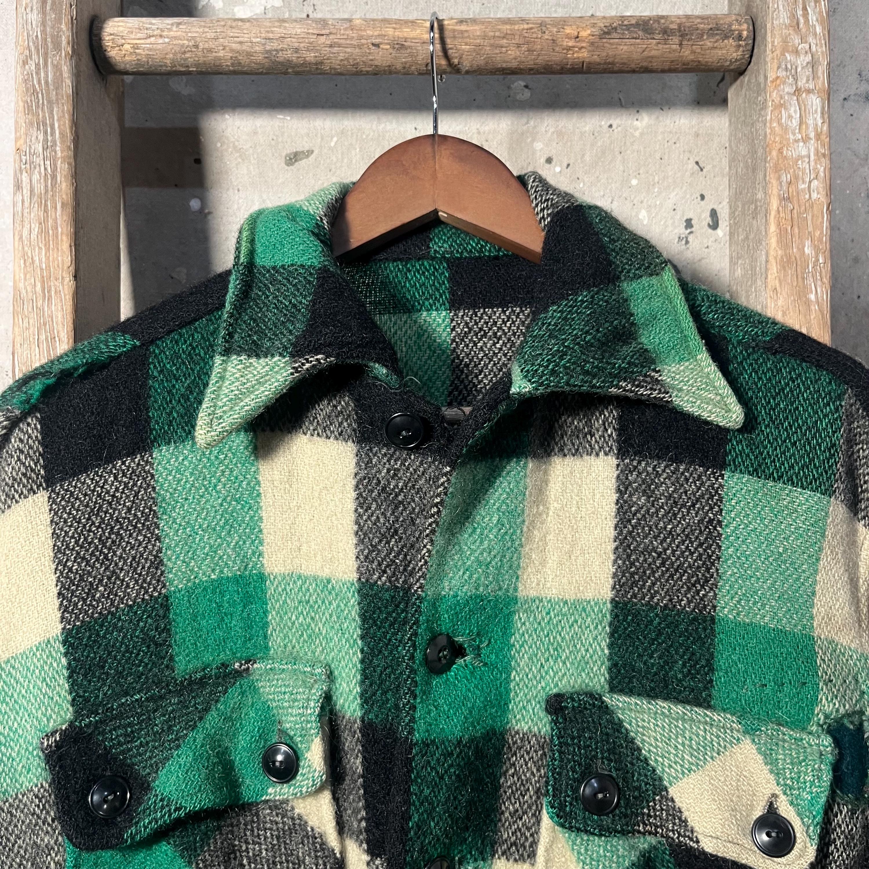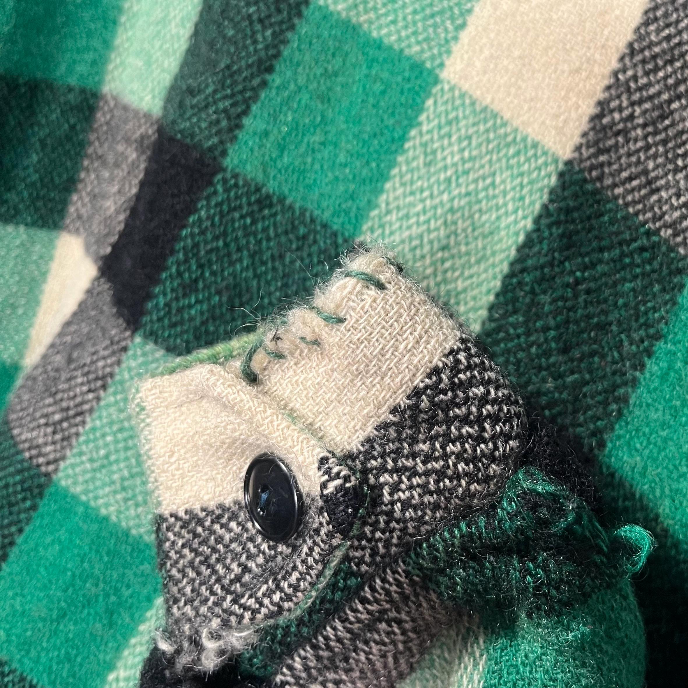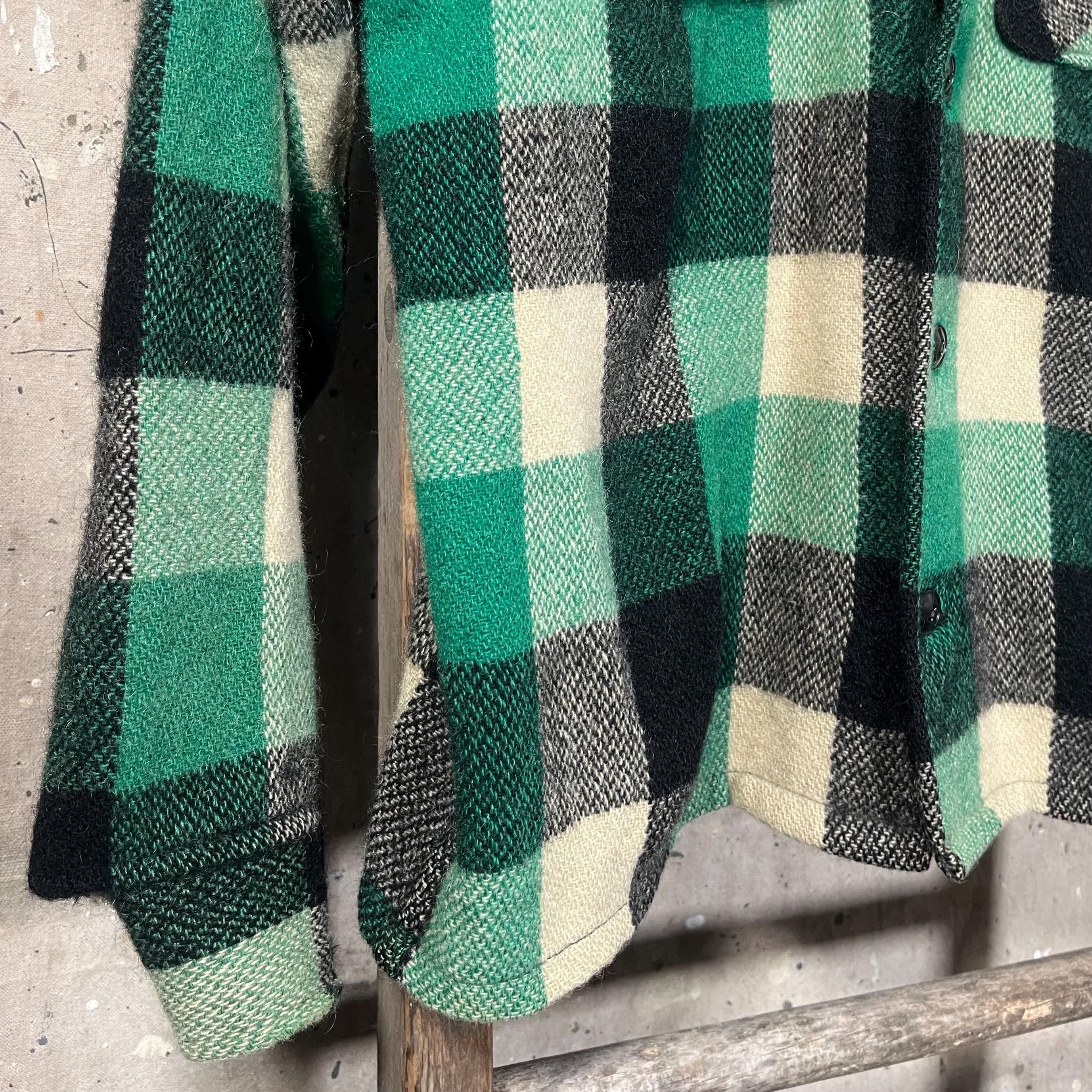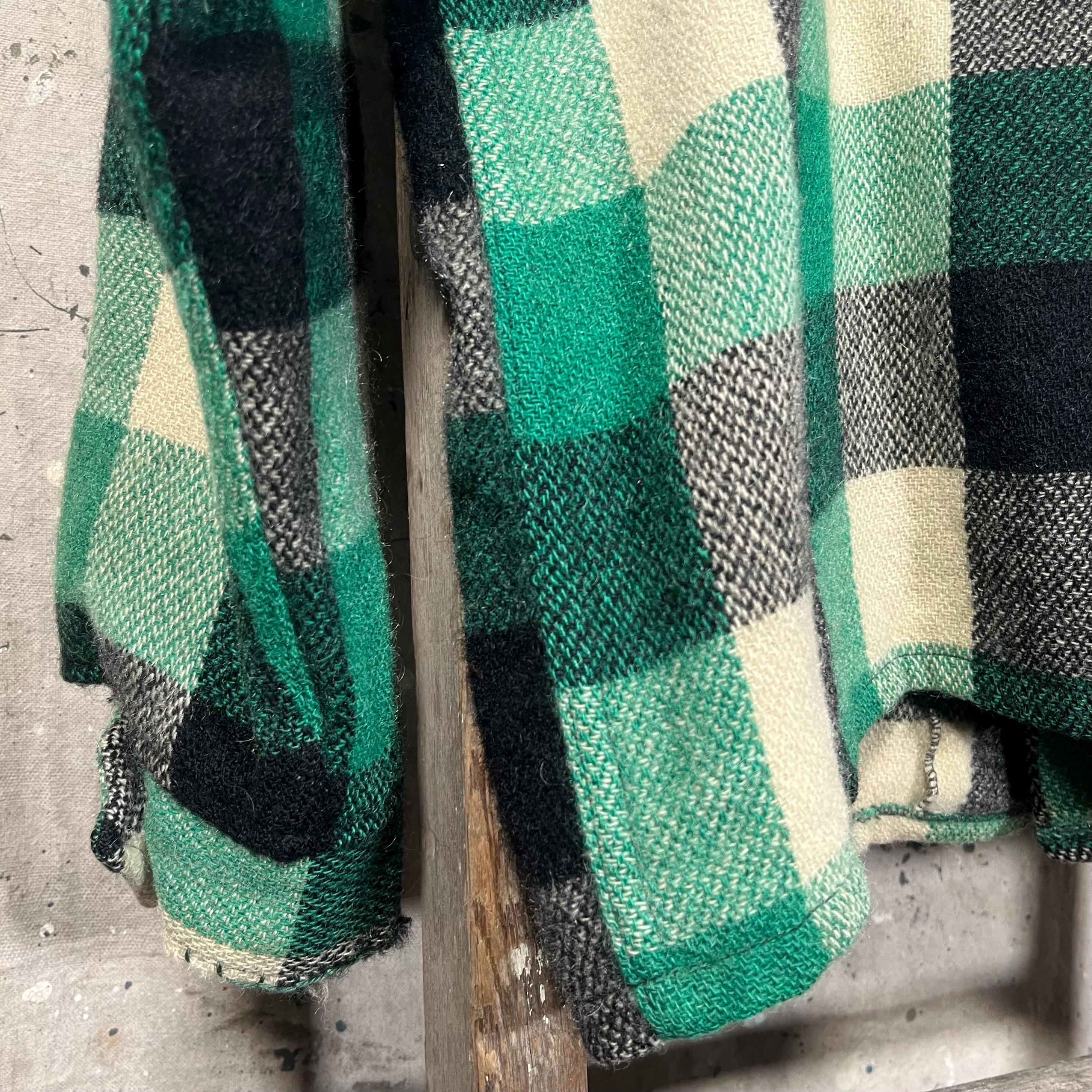 1950s wool shirt jacket. Heavy wool , black / green plaid button down. Features two chest pockets . Natural distressing throughout with original hand sewn repairs . Good condition see photos.