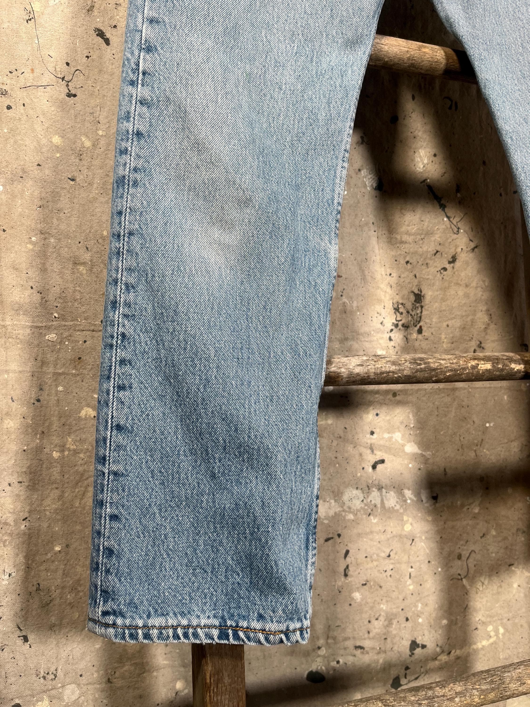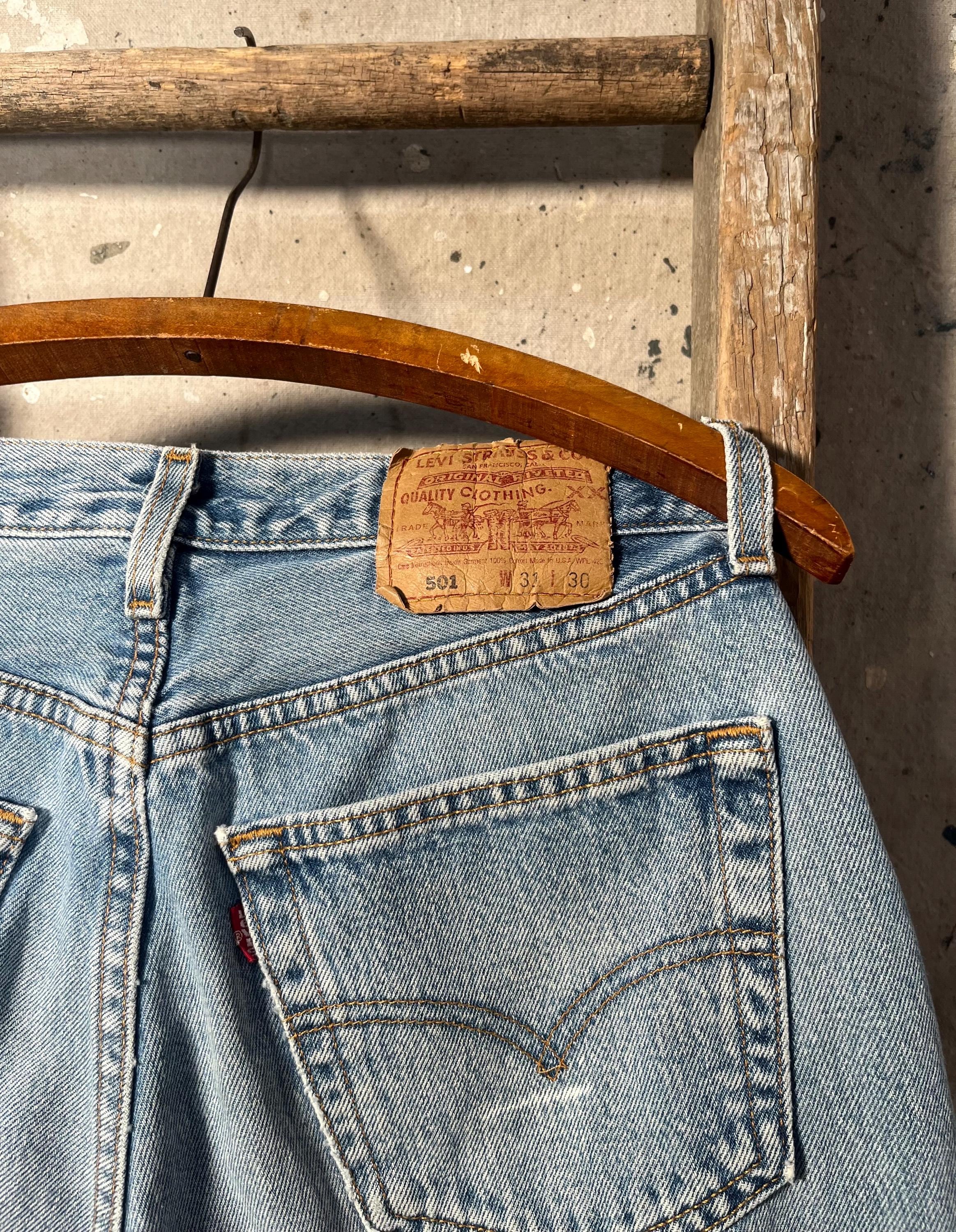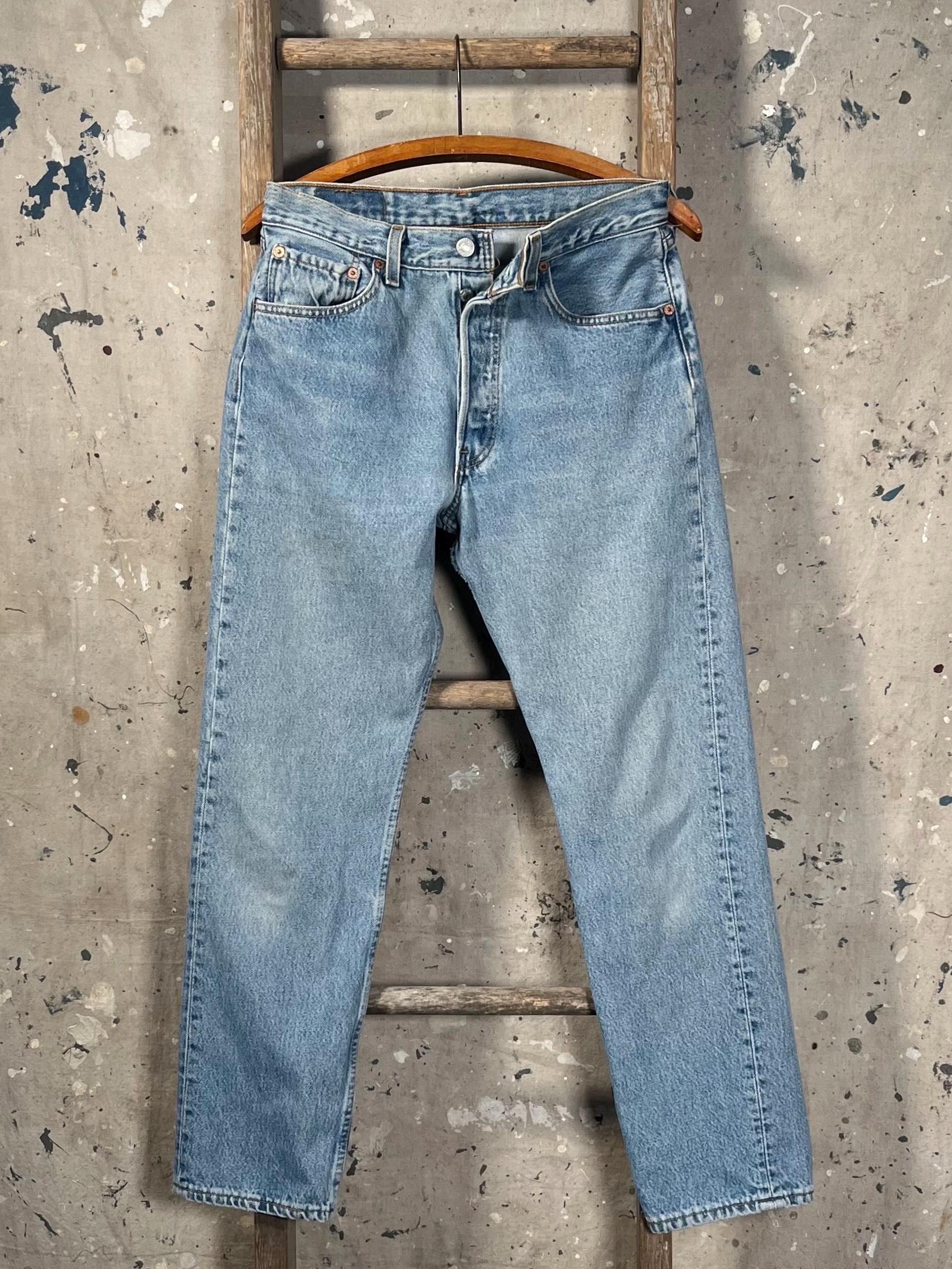 1980s Levi's 501 denim jeans. Medium / light wash with perfect distressing throughout . 28 waist , button fly Levi’s made in USA. See photos . Good condition.