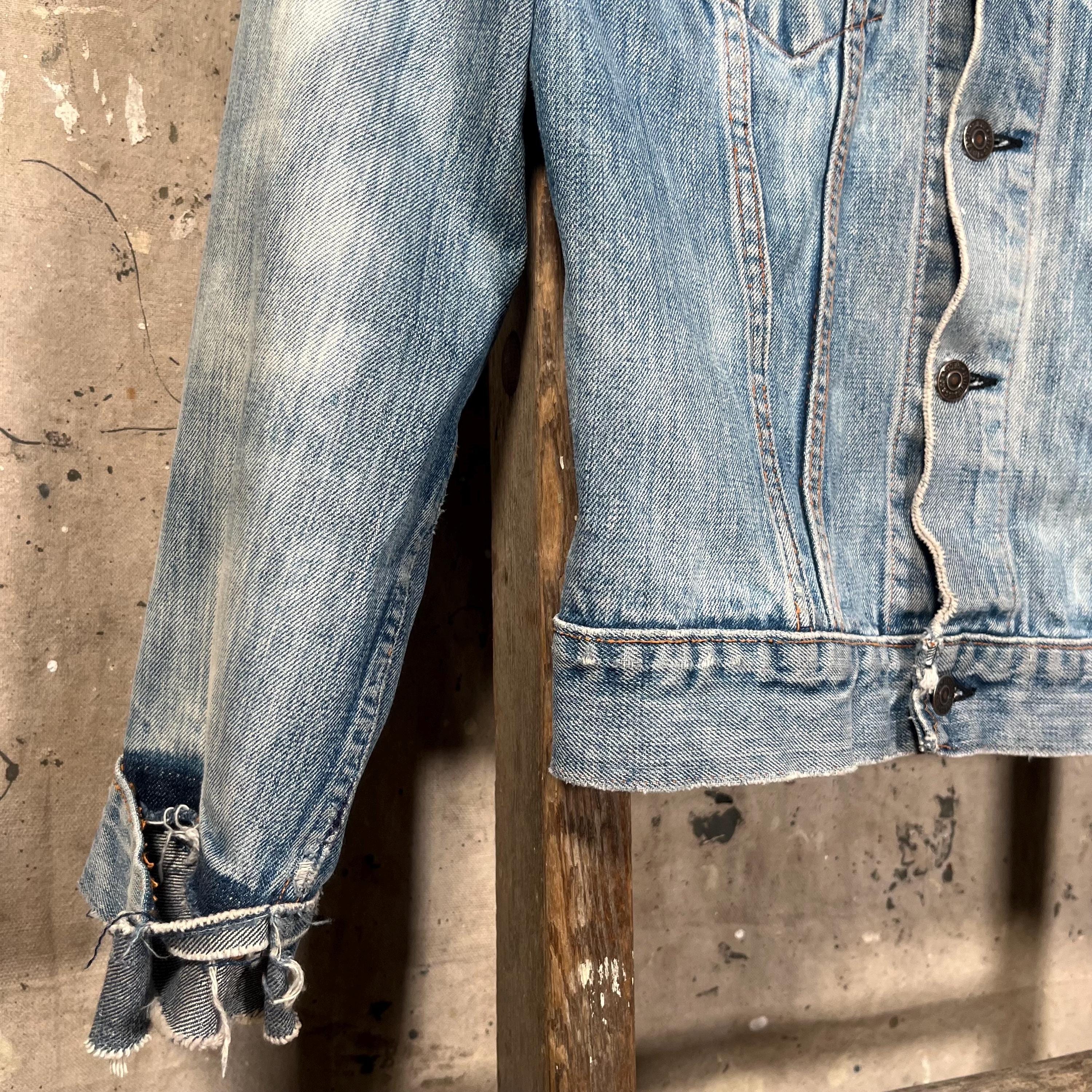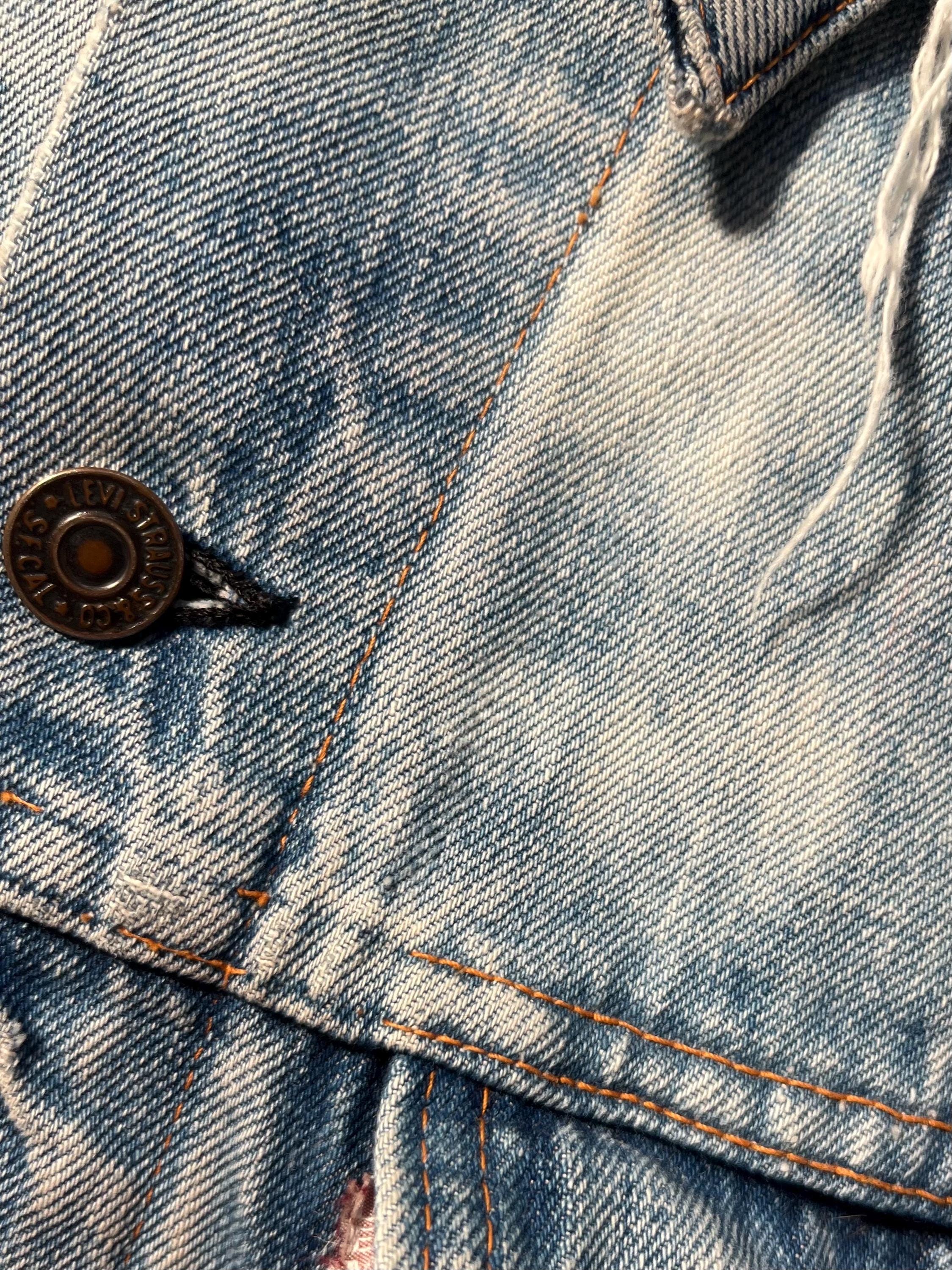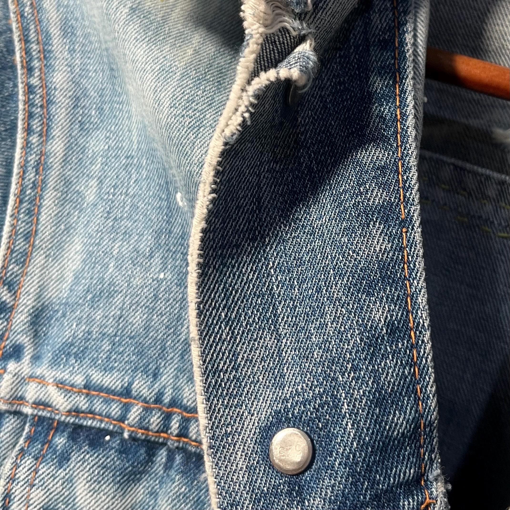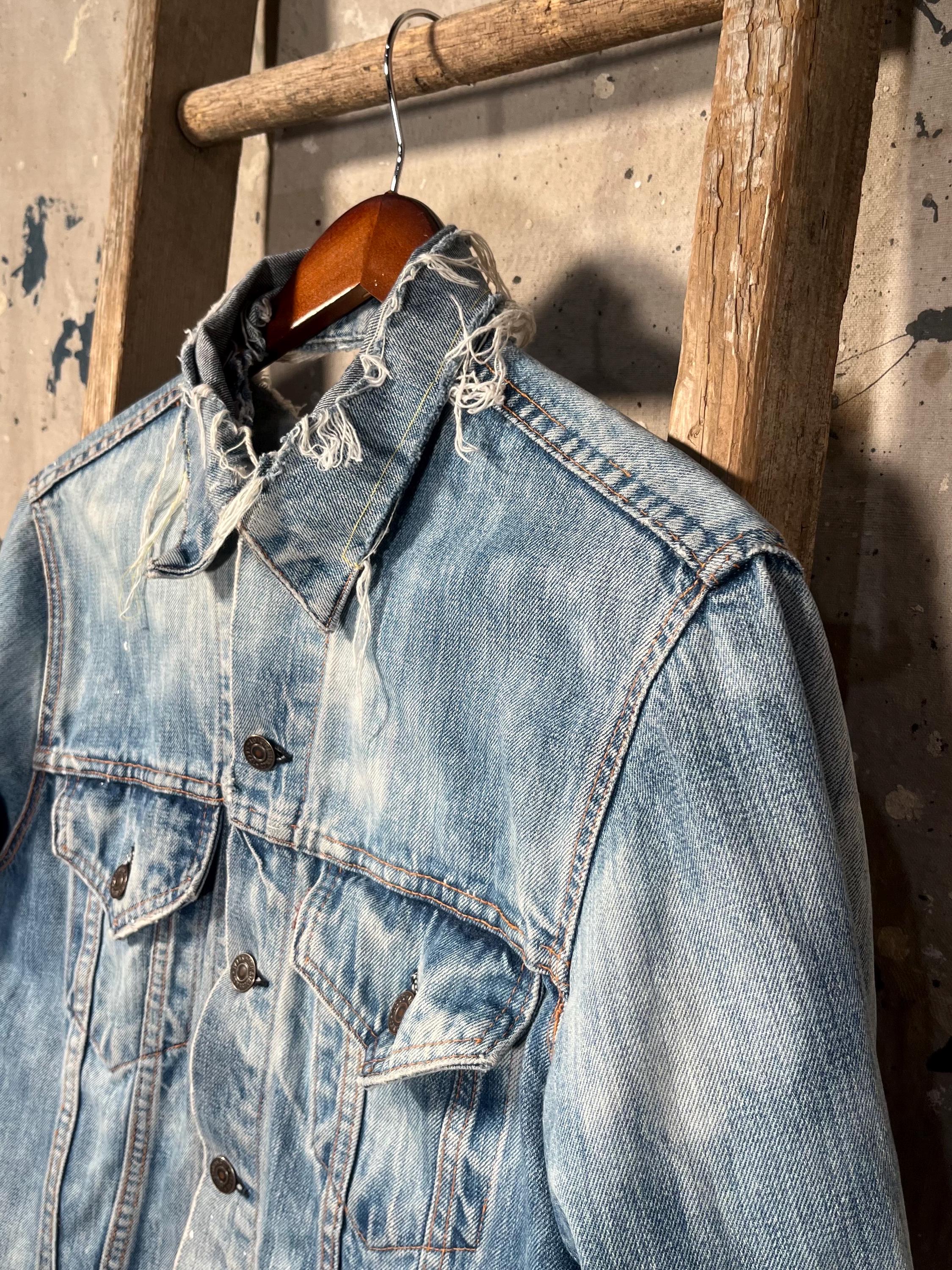 Thrashed 1960s Levi's Big E denim jacket . This is an authentic vintage Levis Type 3 denim jacket. Extremely distressed with misc holes and bleach splatter throughout. Continuing the life of this Original 1960s Levis jacket that appears to have been repurposed and rebranded in the past with screen printing inside collar. Please see photos .