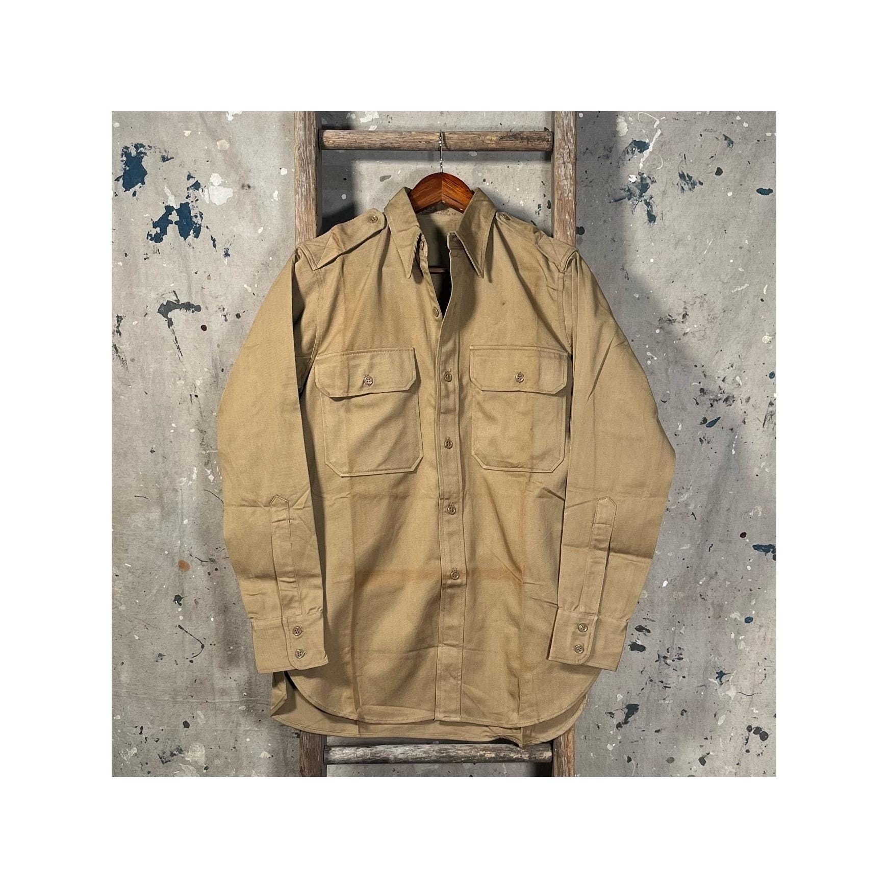Authentic WWII Early 1940s Army cotton khaki shirt. This is an all cotton light weight shirt with 2 pockets, original arm patches, and side gussets. The shirt is in new old stock condition with natural discoloration from storage throughout. Please see photos.