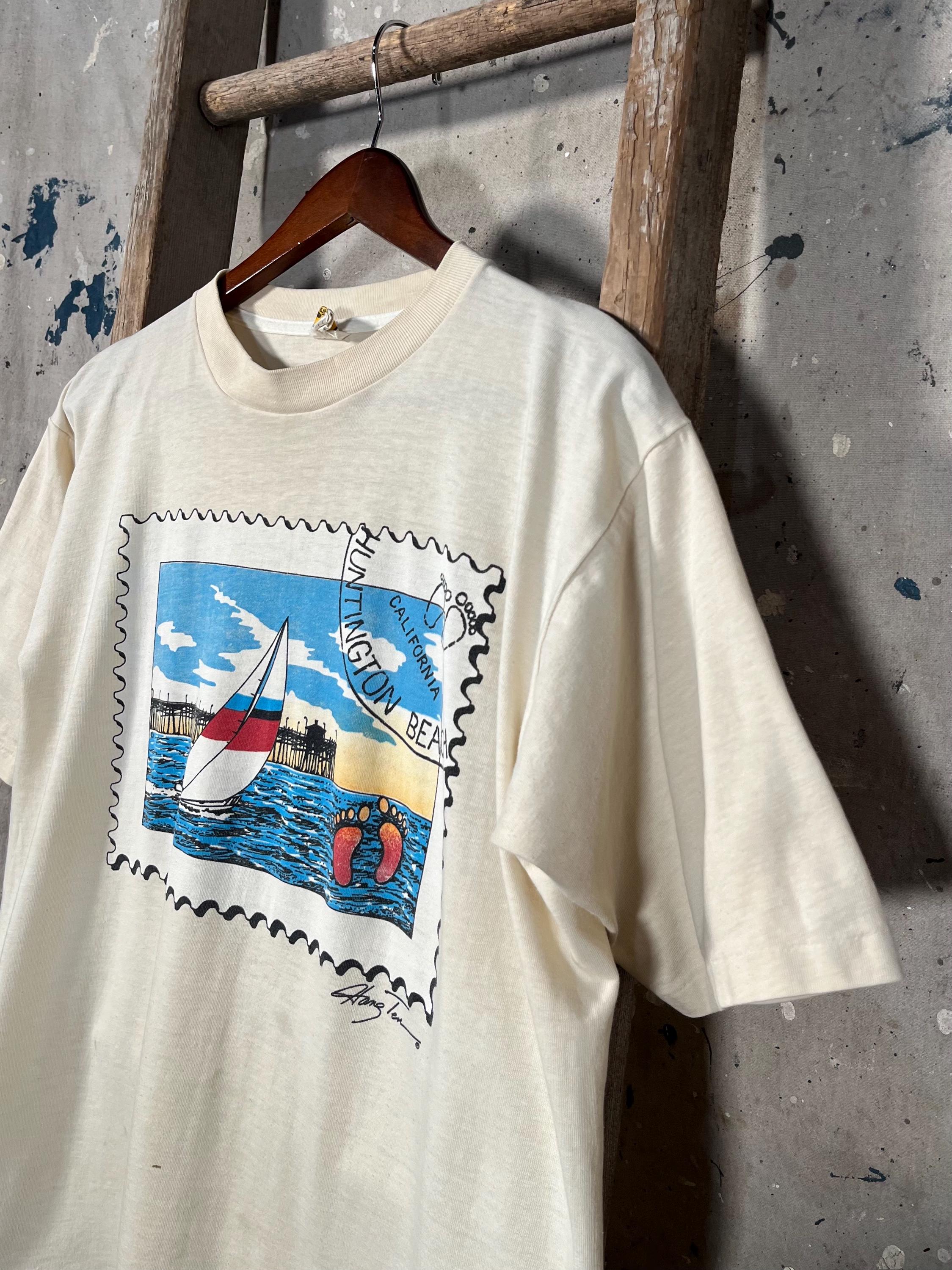 1990s Huntington Beach T-shirt by Hang Ten. Super soft , paper thin tee with windsurfing chest graphic. Good condition , natural distressing throughout - see photos.