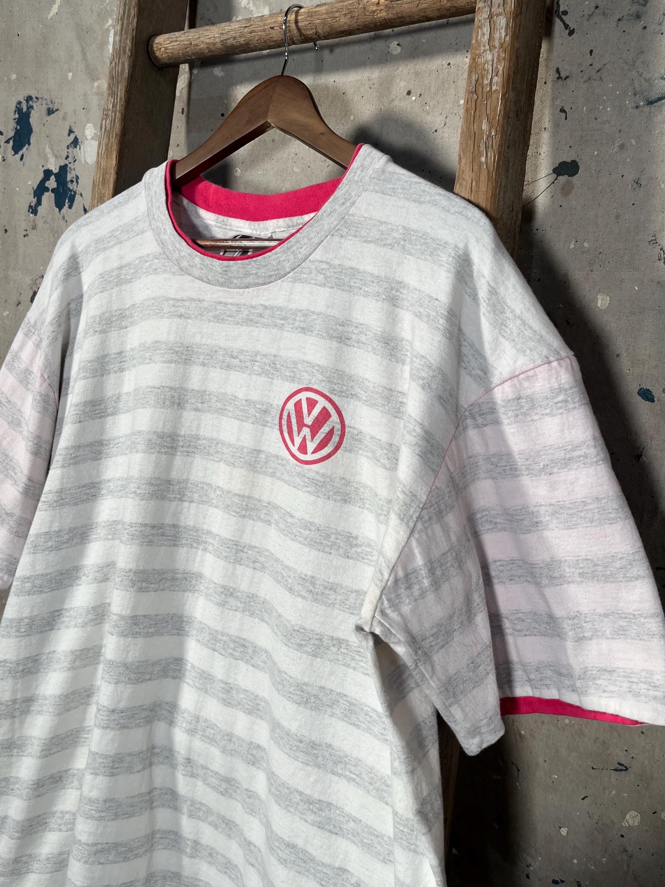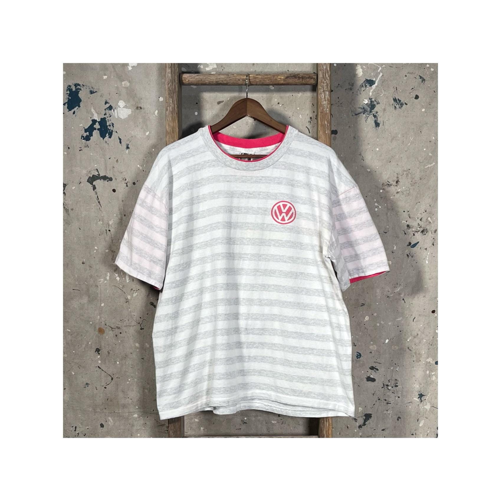 1990s Volkswagen T Shirt. Features Grey & White stripes with small VW logo screen printed at chest. Pink accent at collar & sleeve cuffs. Good condition , little to no wear - see photos.