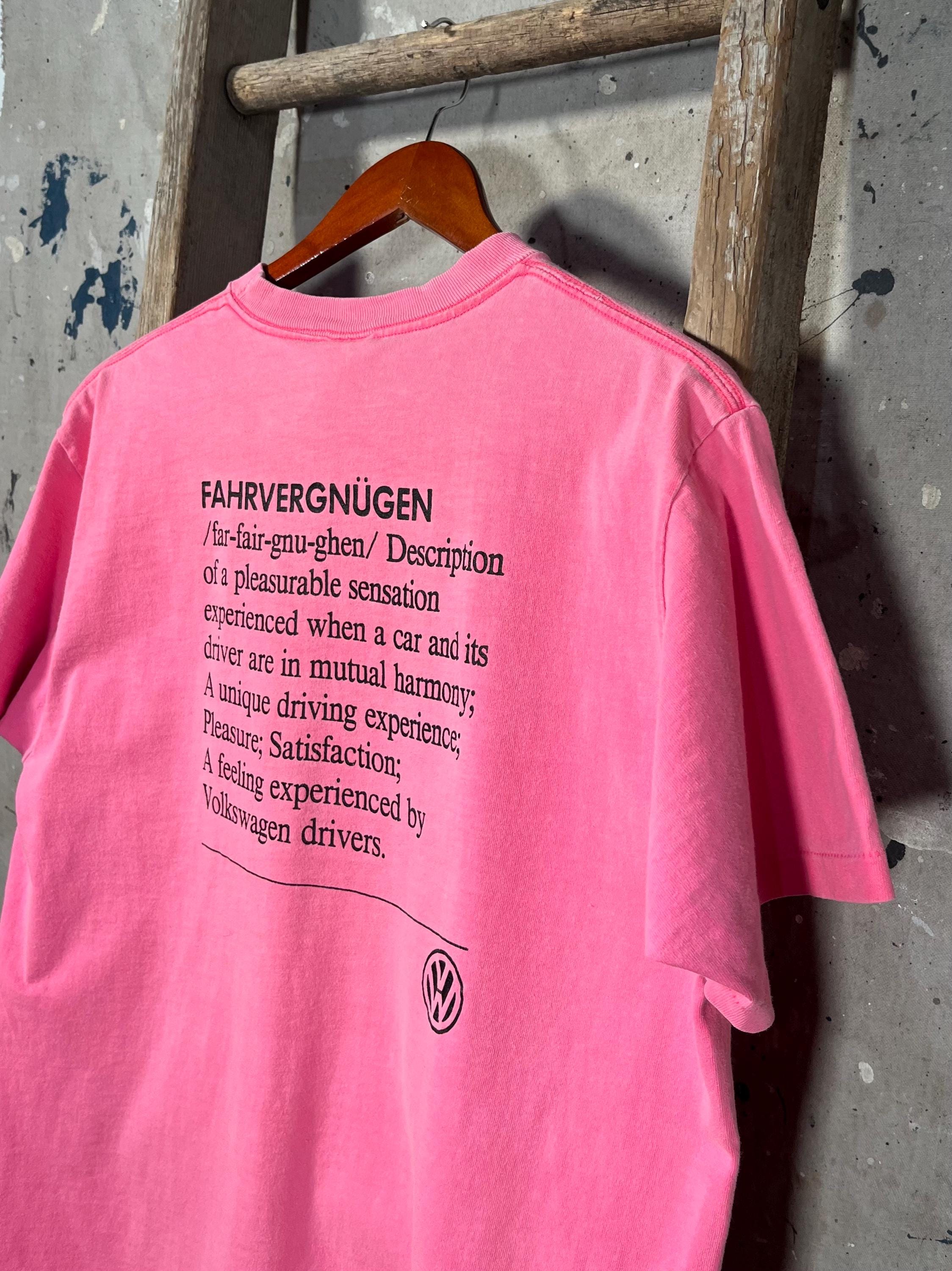 1990s Volkwagen Fahrvergnugen T Shirt. Pink, single stitch tee features double sided graphic. Good vintage condition , desirable fading with natural distressing - see photos.